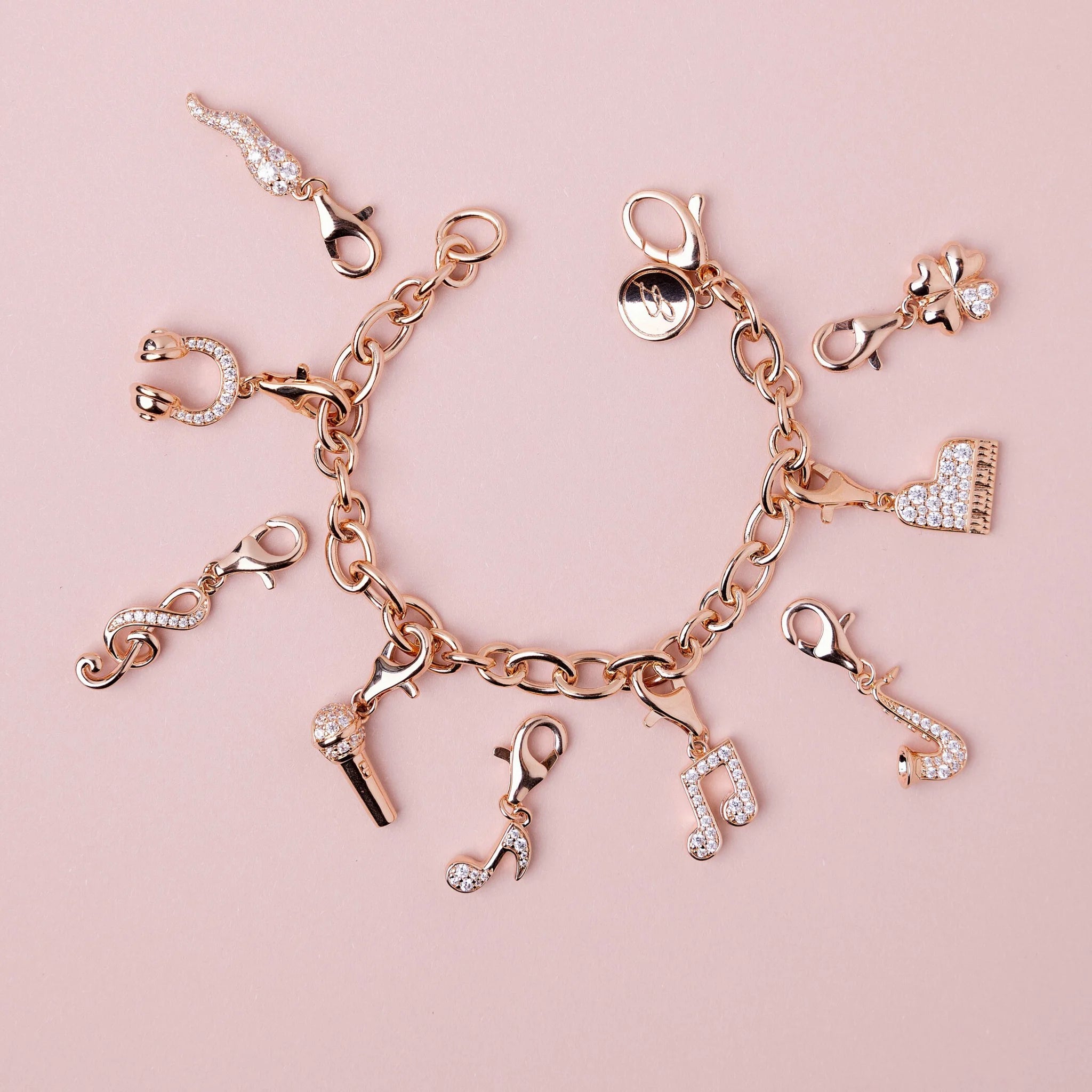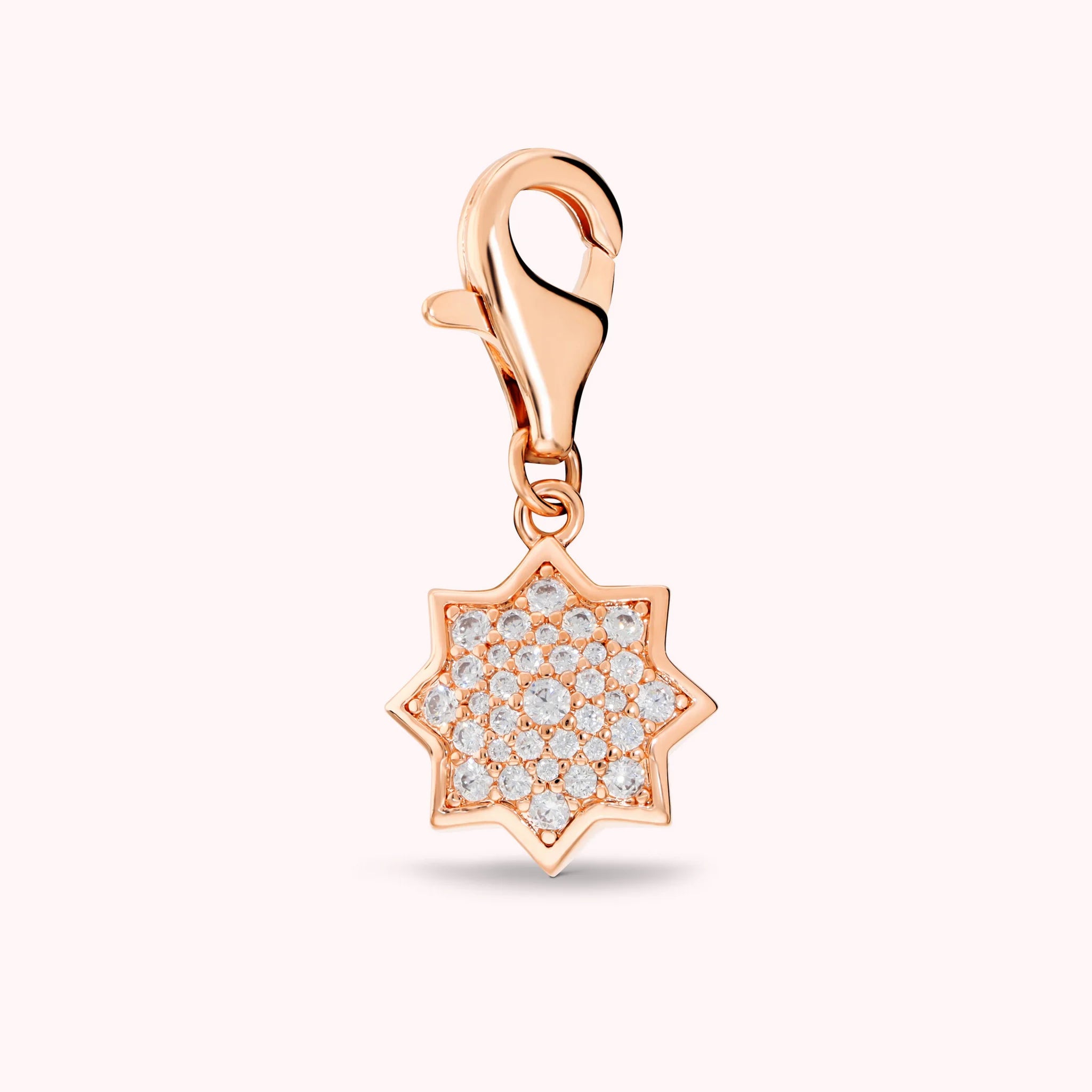 Sternanhänger Bronzallure gefertigt aus der Legierung Golden Rosé, 18 Karat vergoldet, mit funkelndem Zirkonia-Pavé. Ausgestattet mit Karabinerhaken. Kompatibel mit dem Armband für Anhänger mit abwechselnden Gliedern.