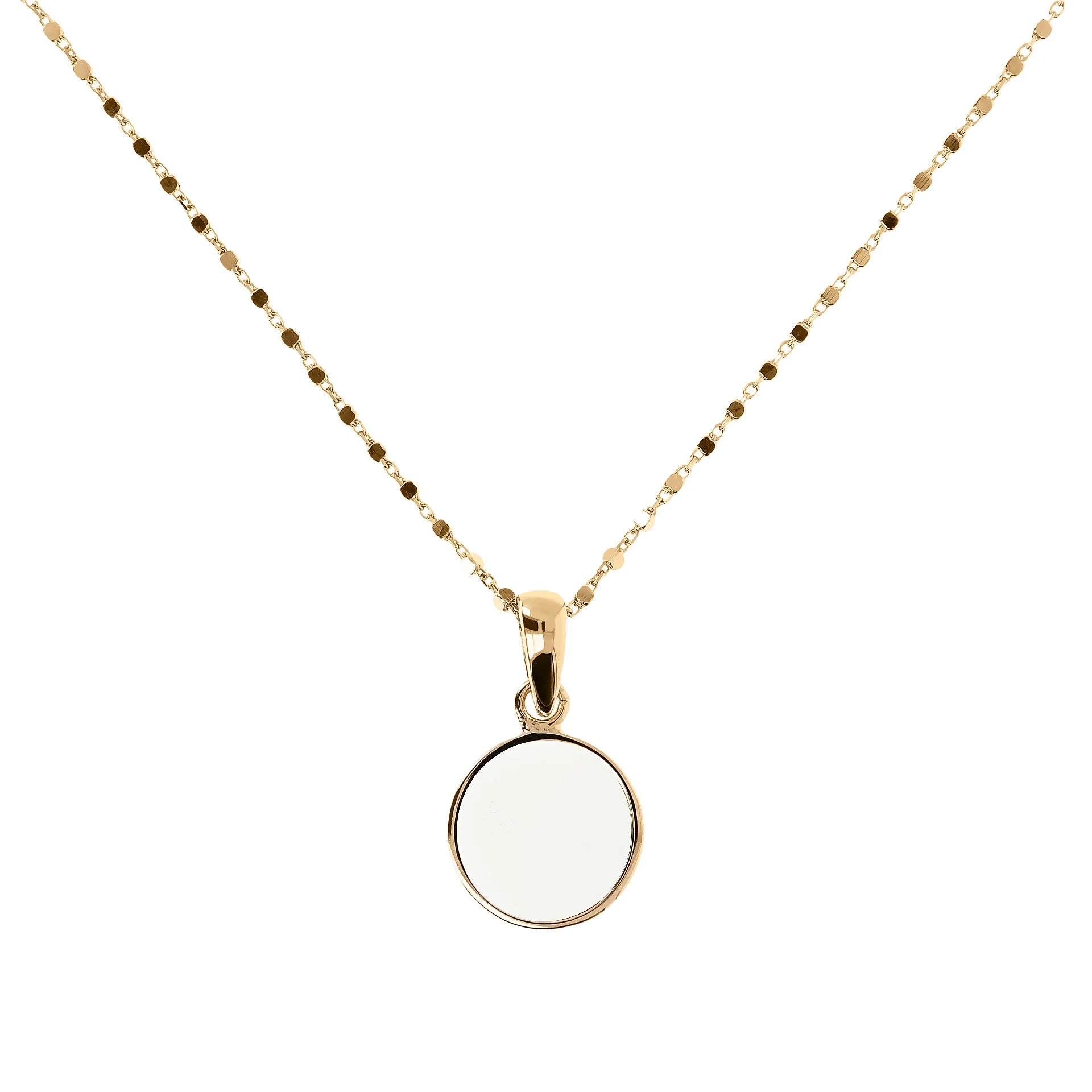 Bronzallure-Halskette aus Golden Rosé-Legierung, 18 Karat Gelbgold plattiert, mit Würfelkette und kleinem Scheibenanhänger aus Naturstein (14 mm). Karabinerverschluss und Länge 47 cm mit Zwischengliedern bei 41 und 44 cm.