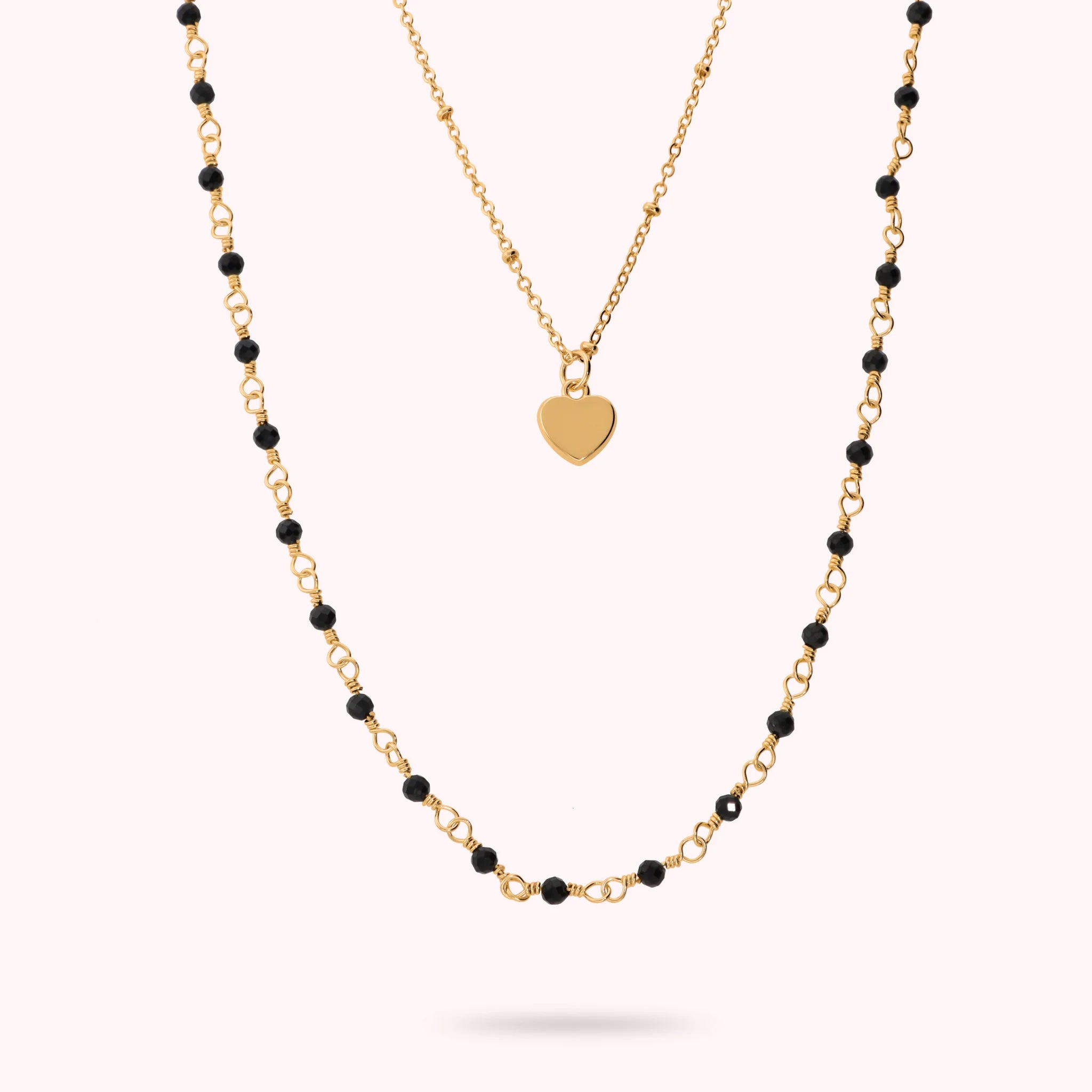 Lange doppelte Kette von Bronzallure aus Golden Rosé Legierung, 18kt Gelbgold plattiert, bestehend aus einer Rolo-Halskette (39cm) mit Rondellen und glänzendem Herzanhänger sowie einer Rosenkranzkette mit facettierten Natursteinen aus Quarzit (3 mm). Karabinerverschluss.