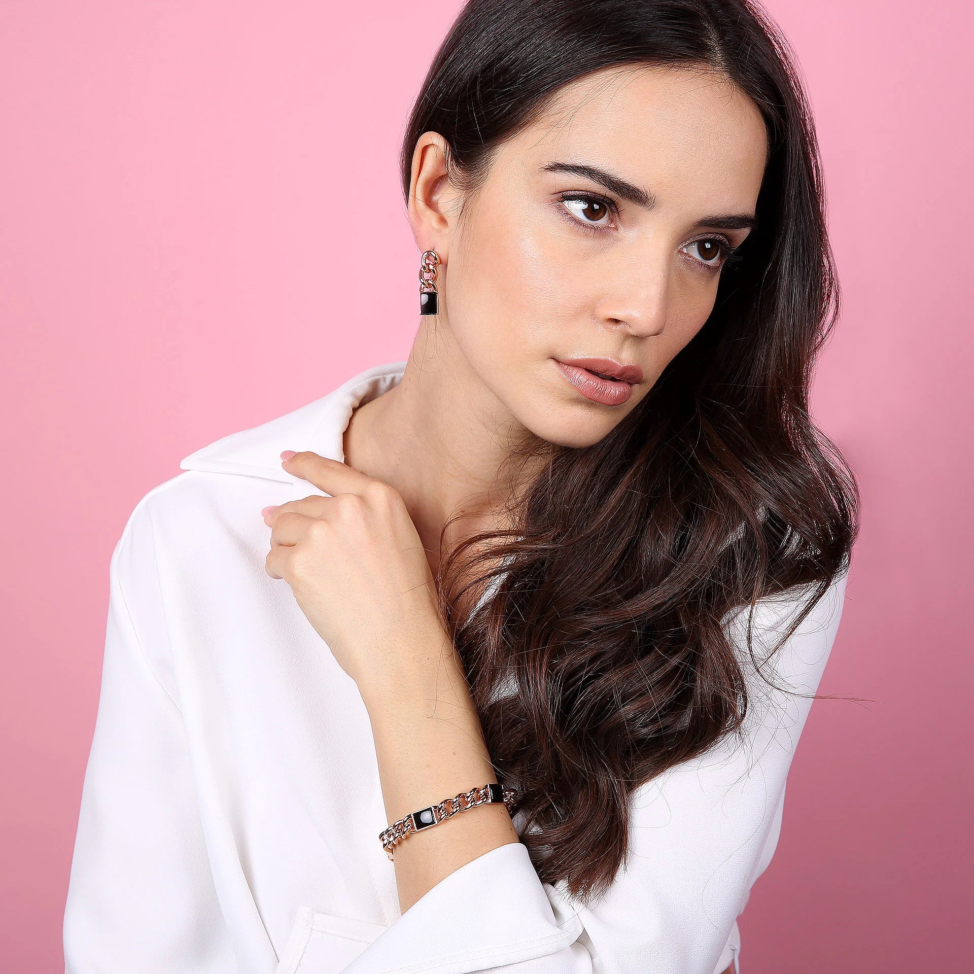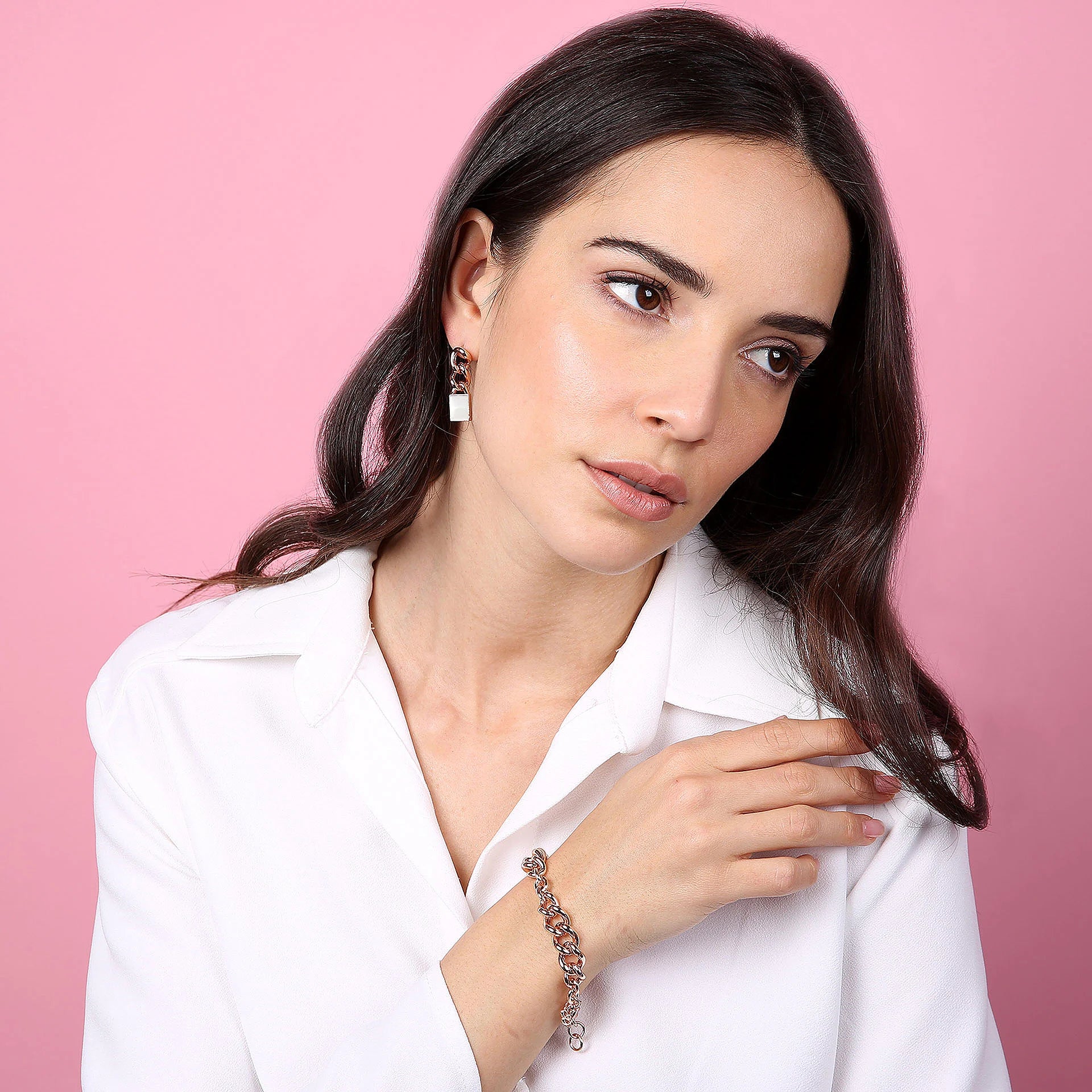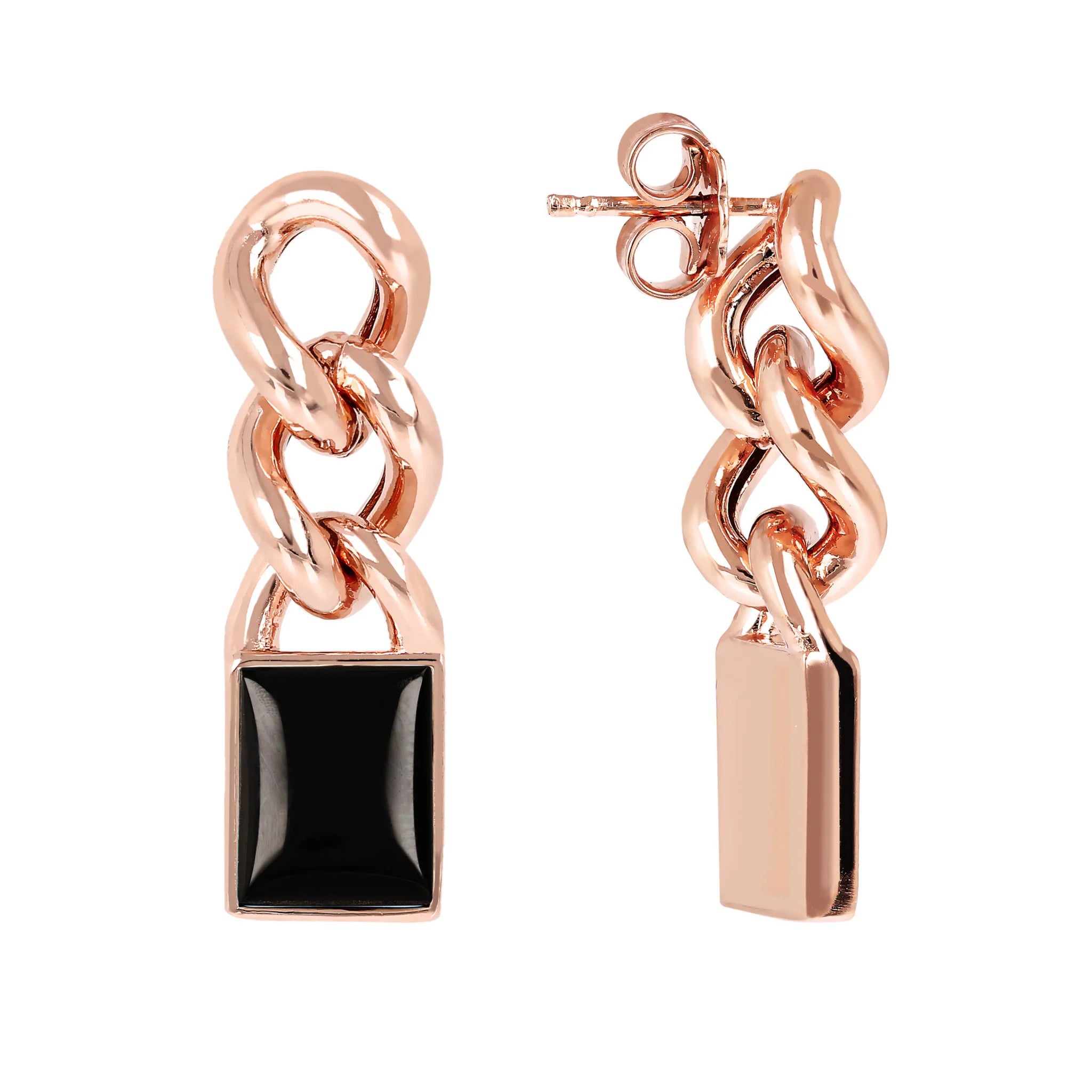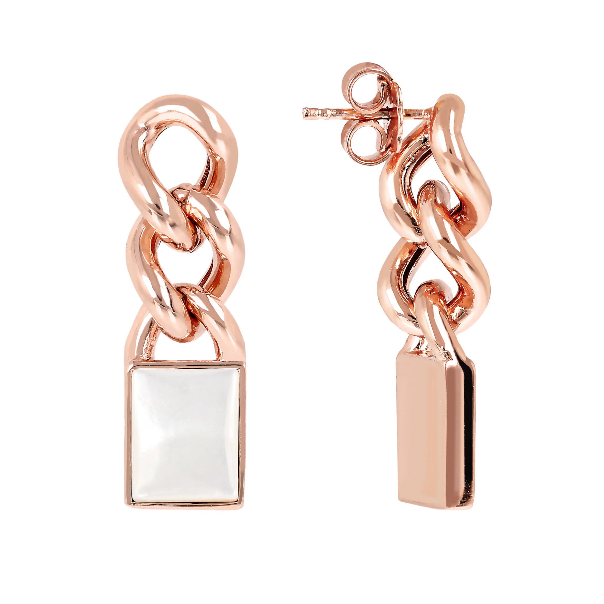Bronzallure-Ohrringe mit Glieder-Anhänger auf einer Golden Rosé-Basis, 18-Karat rosévergoldet, mit einem rechteckigen Cabochon-Anhänger aus Naturstein. Der Ohrring hat eine Länge von 3,2 cm und verfügt über einen Stift- und Schmetterlingsverschluss.