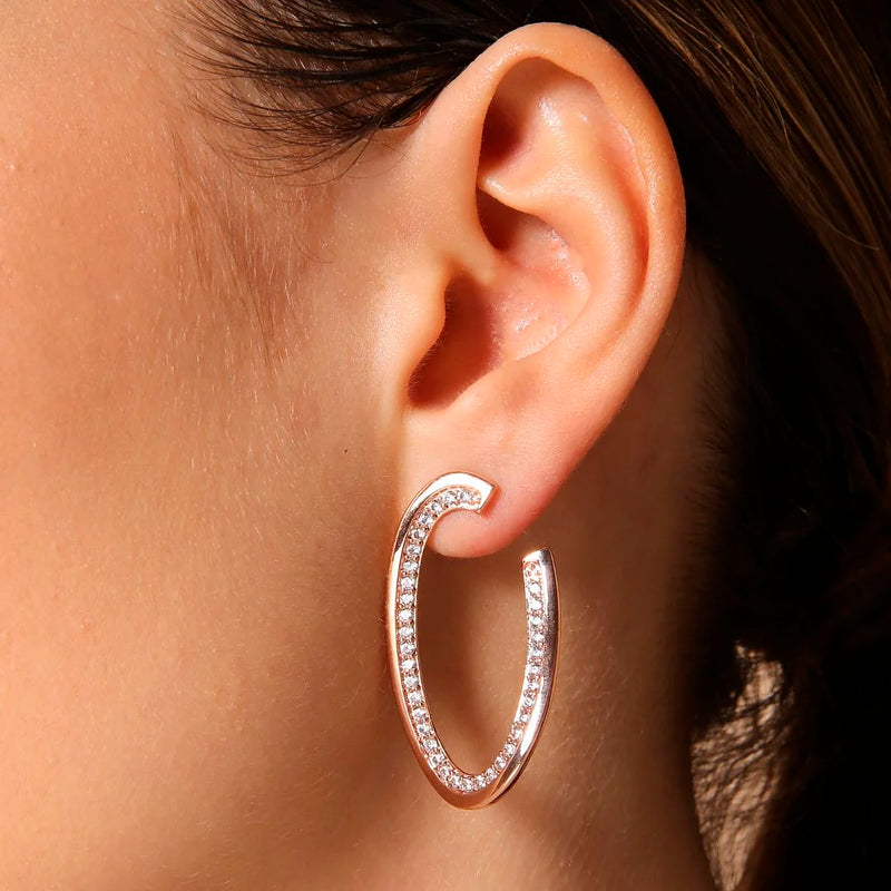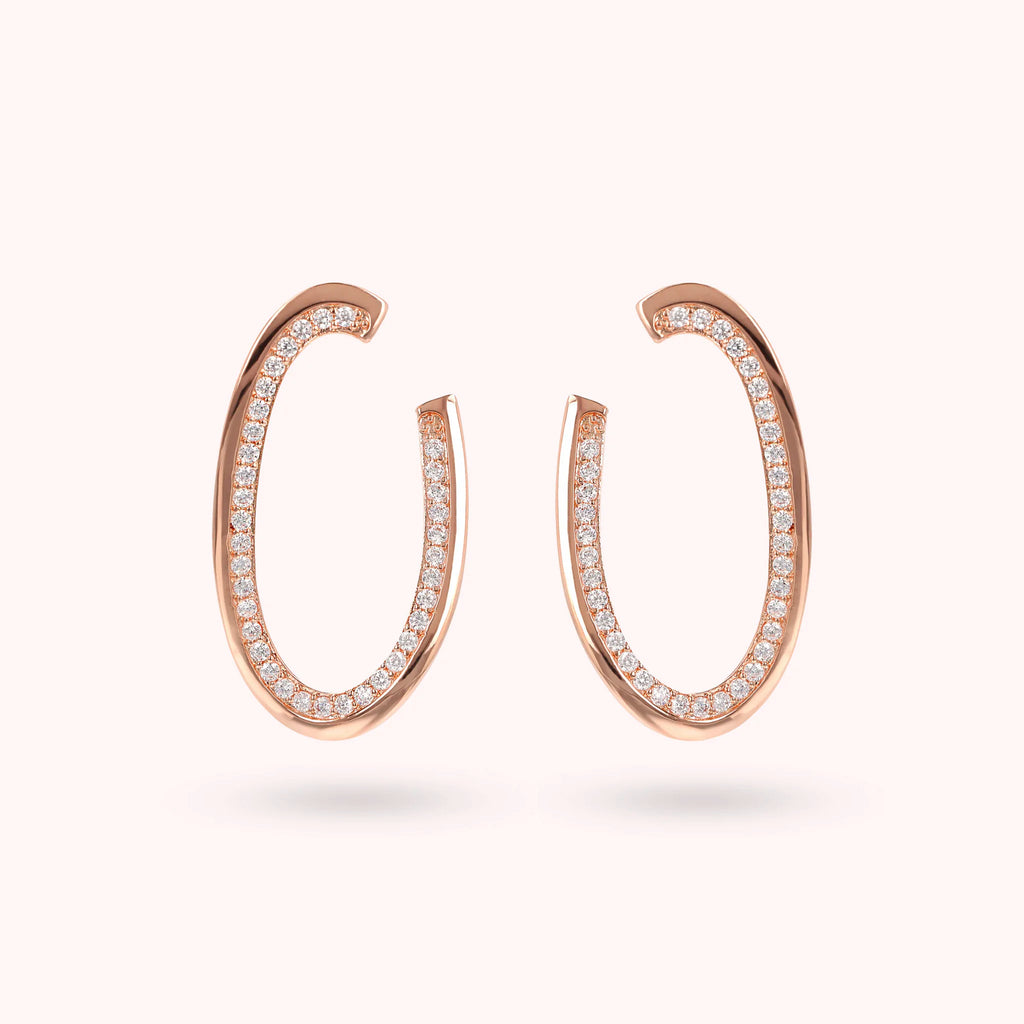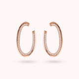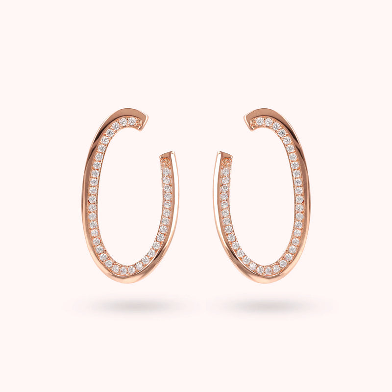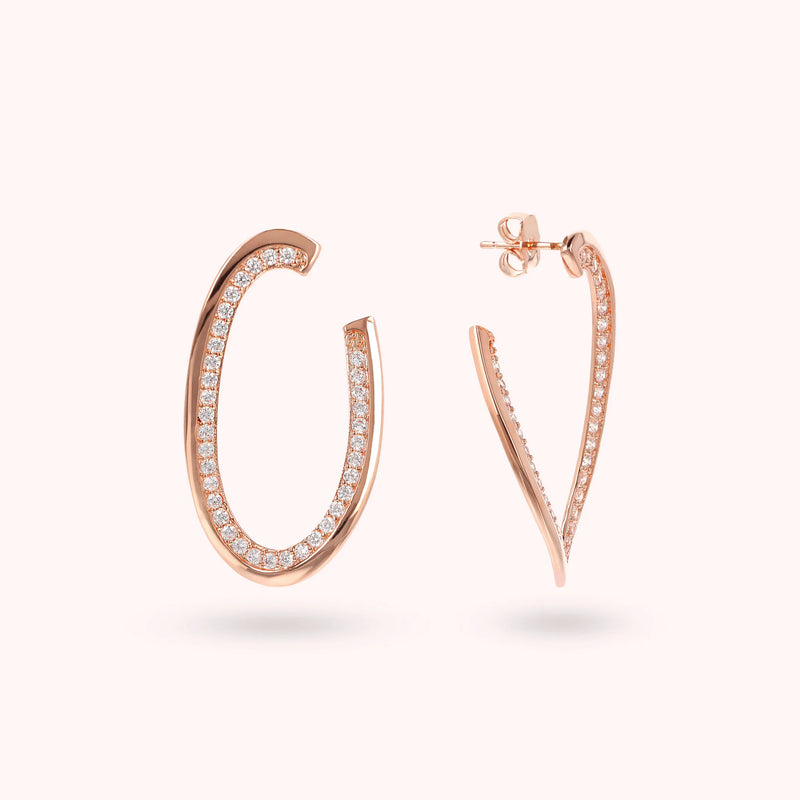 Ohrringe aus einer Golden Rosé-Legierung, mit 18 Karat Roségold vergoldet, mit geschwungenem und halboffenem Design und einer Oberfläche, die mit Zirkonia von leuchtender Qualität verziert ist. Pin- und Butterfly-Verschluss. Länge 4 cm.