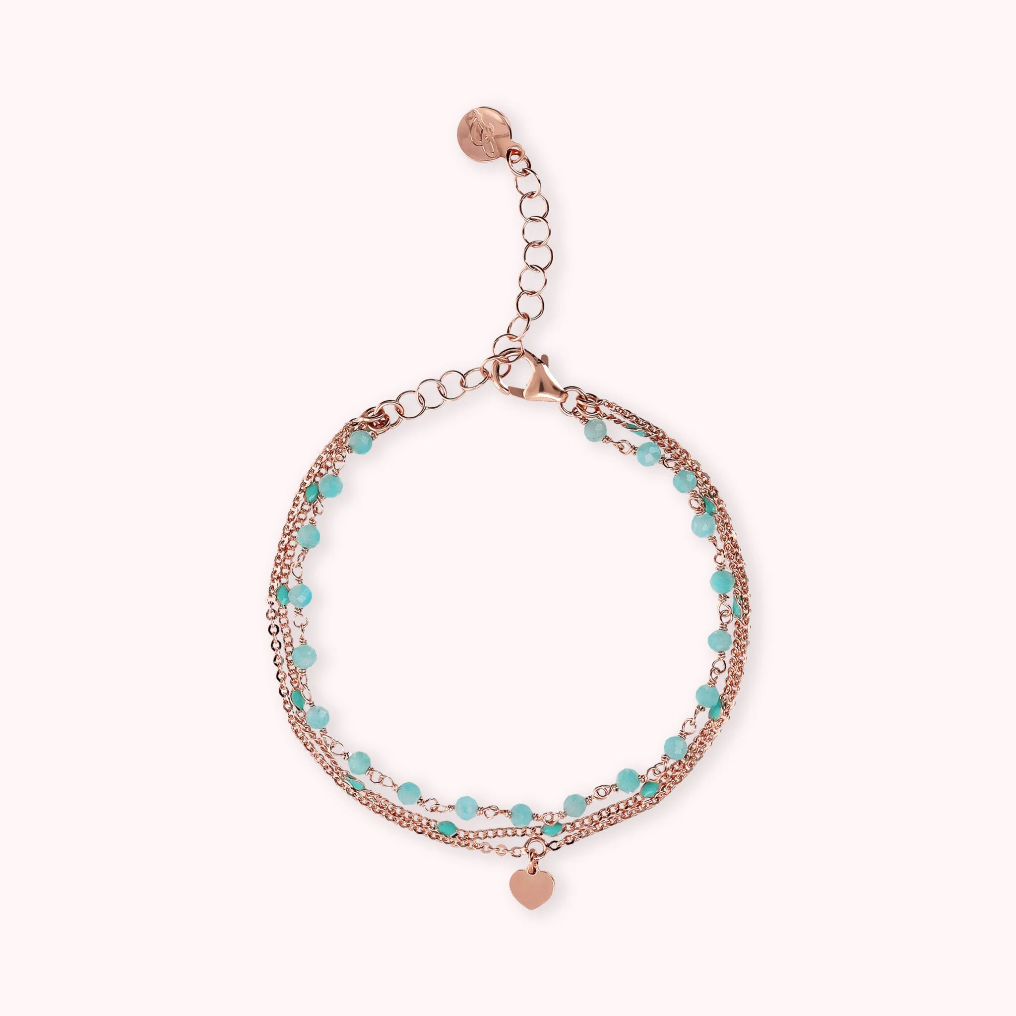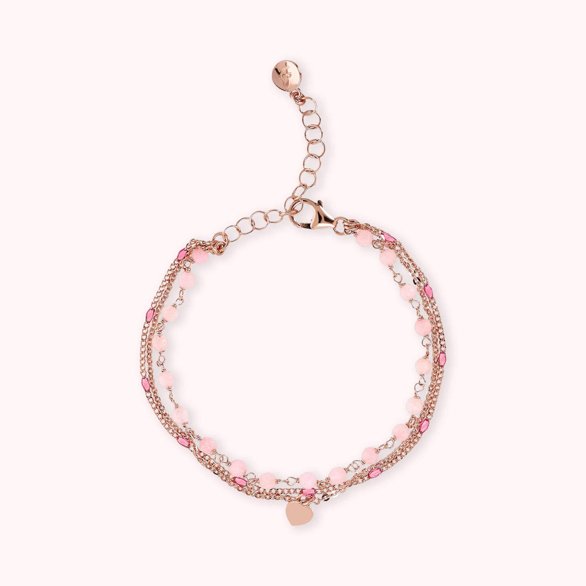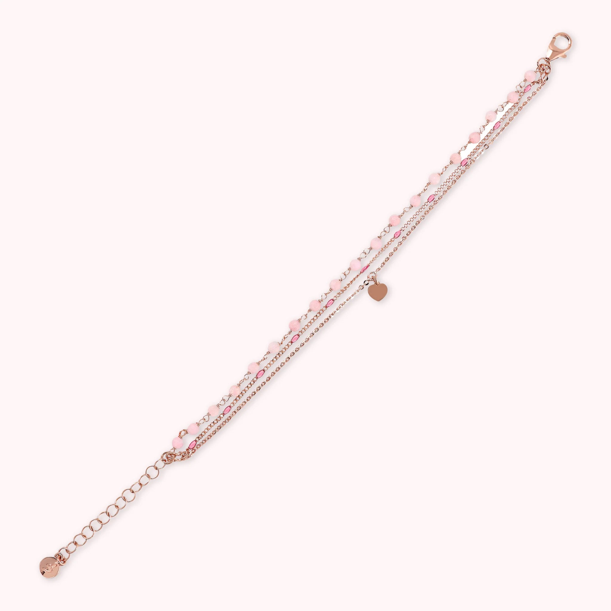 Mehrsträngiges Armband aus der Legierung Golden Rosé, 18-karätig rosévergoldet, bestehend aus drei Strängen: einer Rosenkranzkette mit facettierten Natursteinen (3/4 mm), einer dünnen Klumpenkette mit emaillierten Elementen, die an die Farbe des Steins erinnern, und eine flache Rolo-Kette mit Herzanhänger. Karabinerverschluss mit Verlängerung.