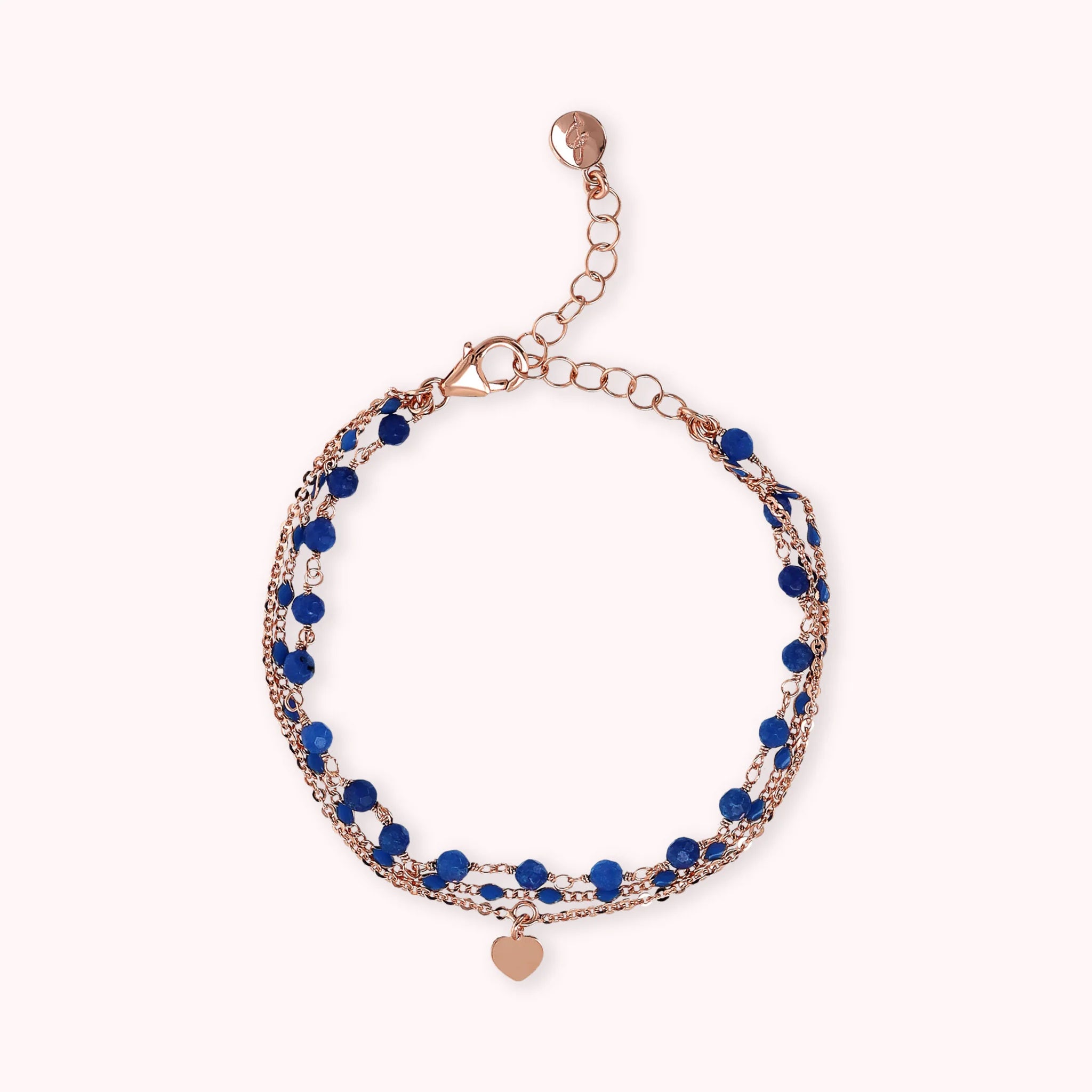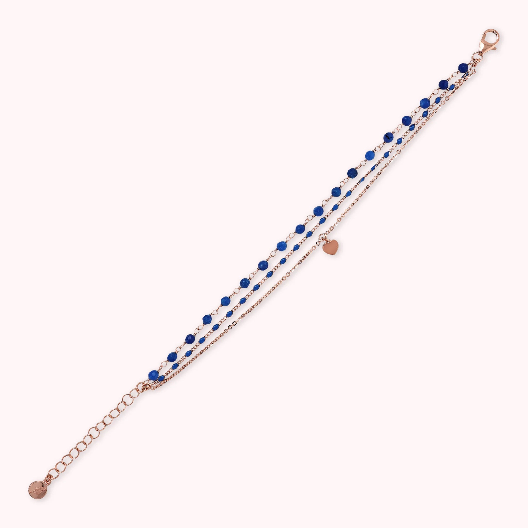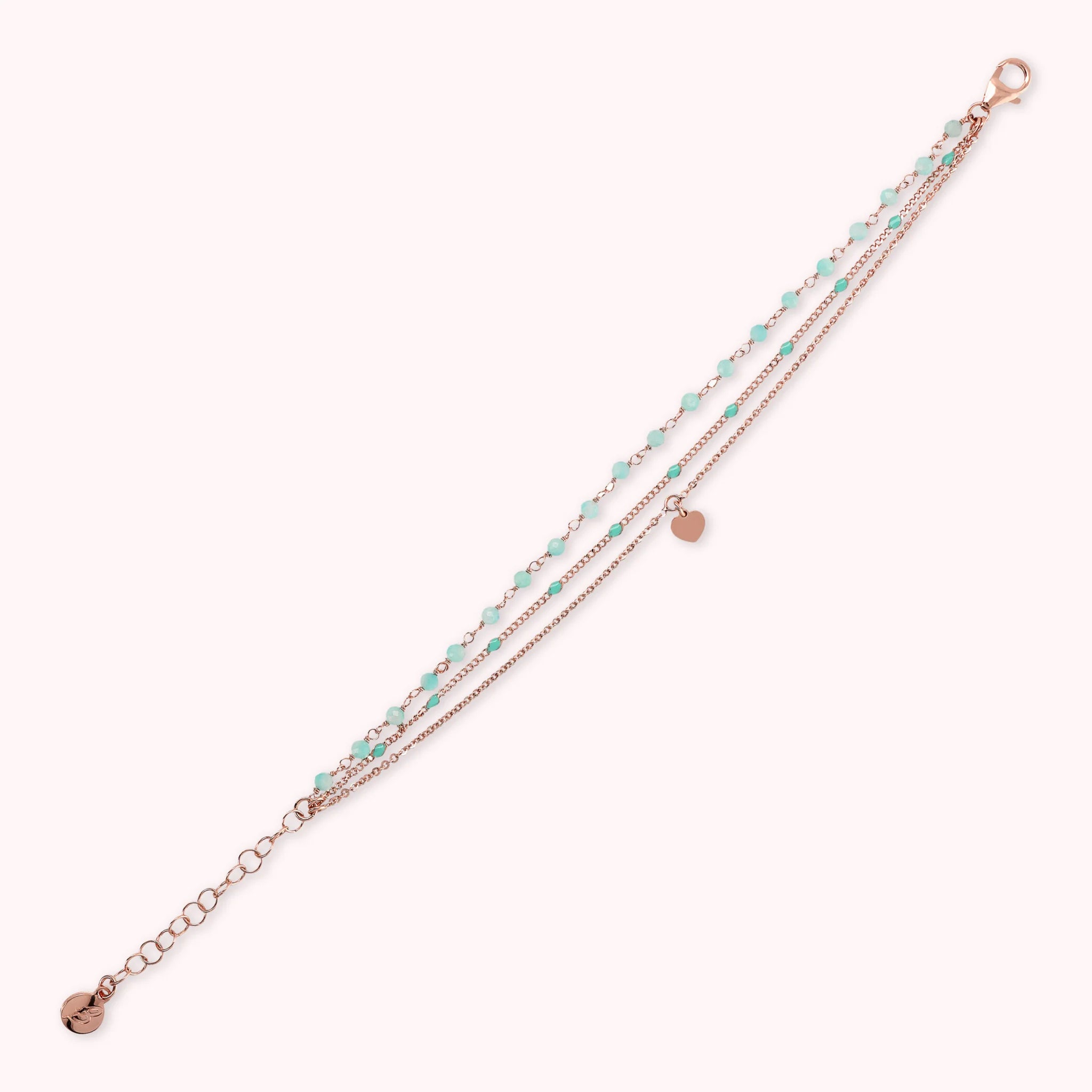 Mehrsträngiges Armband aus der Legierung Golden Rosé, 18-karätig rosévergoldet, bestehend aus drei Strängen: einer Rosenkranzkette mit facettierten Natursteinen (3/4 mm), einer dünnen Klumpenkette mit emaillierten Elementen, die an die Farbe des Steins erinnern, und eine flache Rolo-Kette mit Herzanhänger. Karabinerverschluss mit Verlängerung.