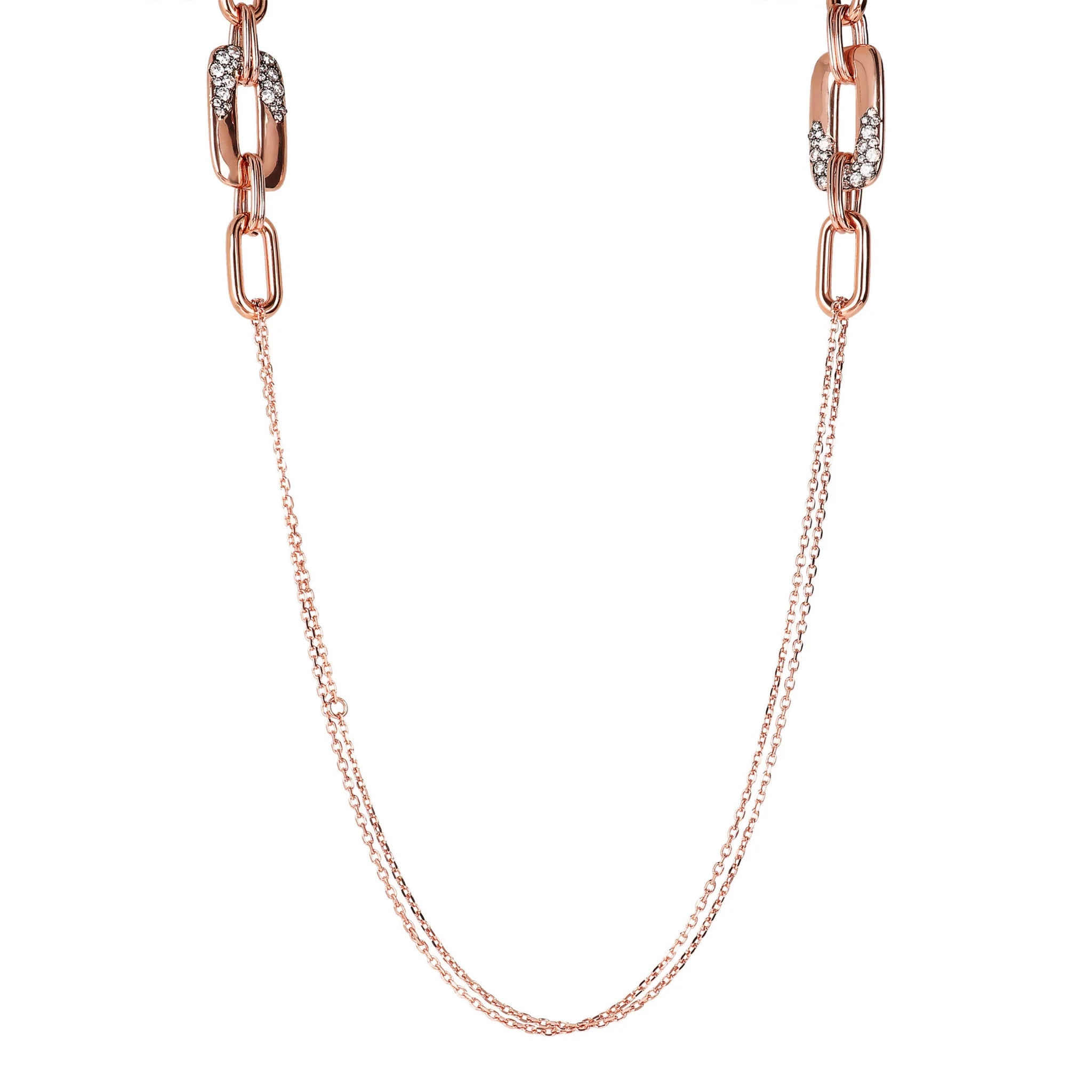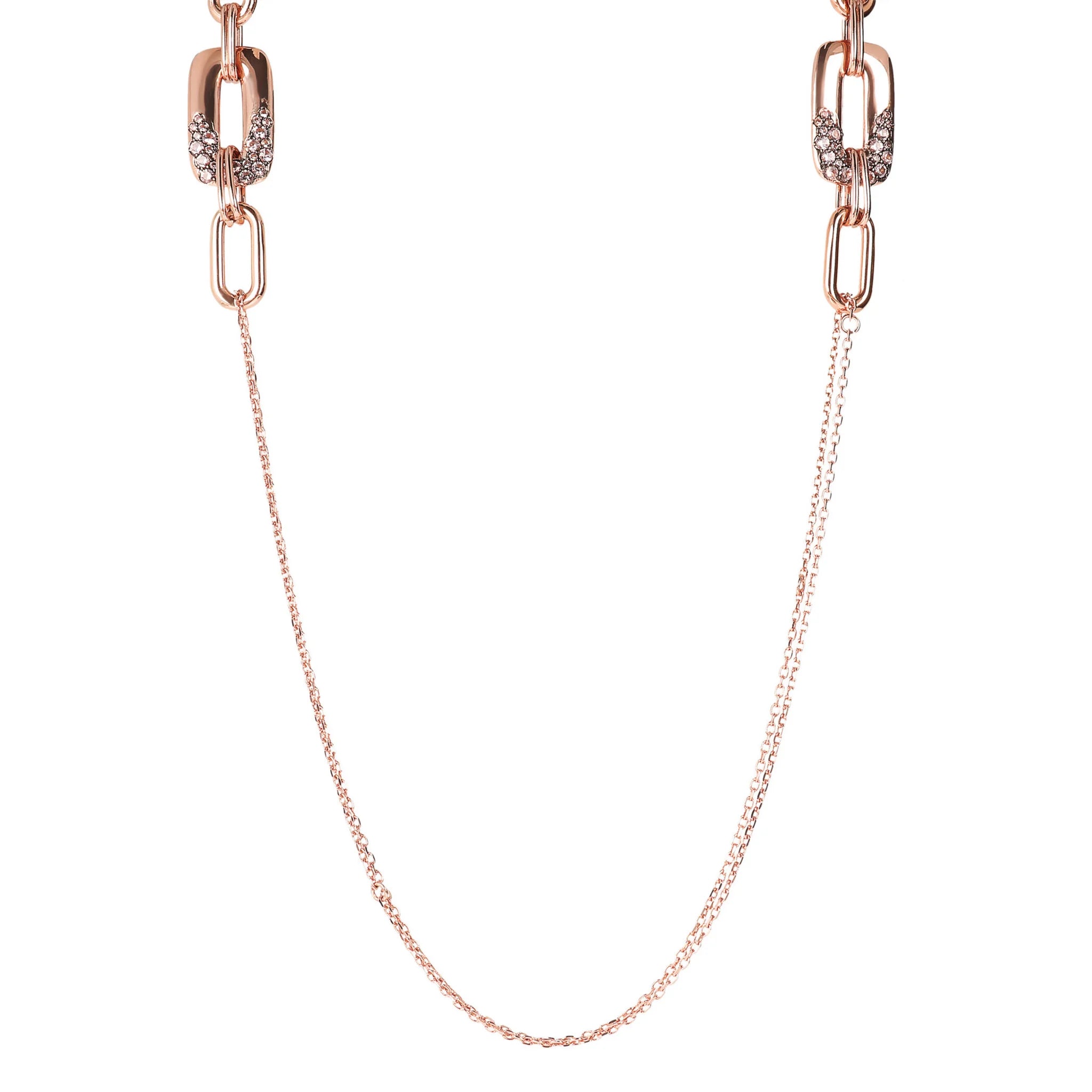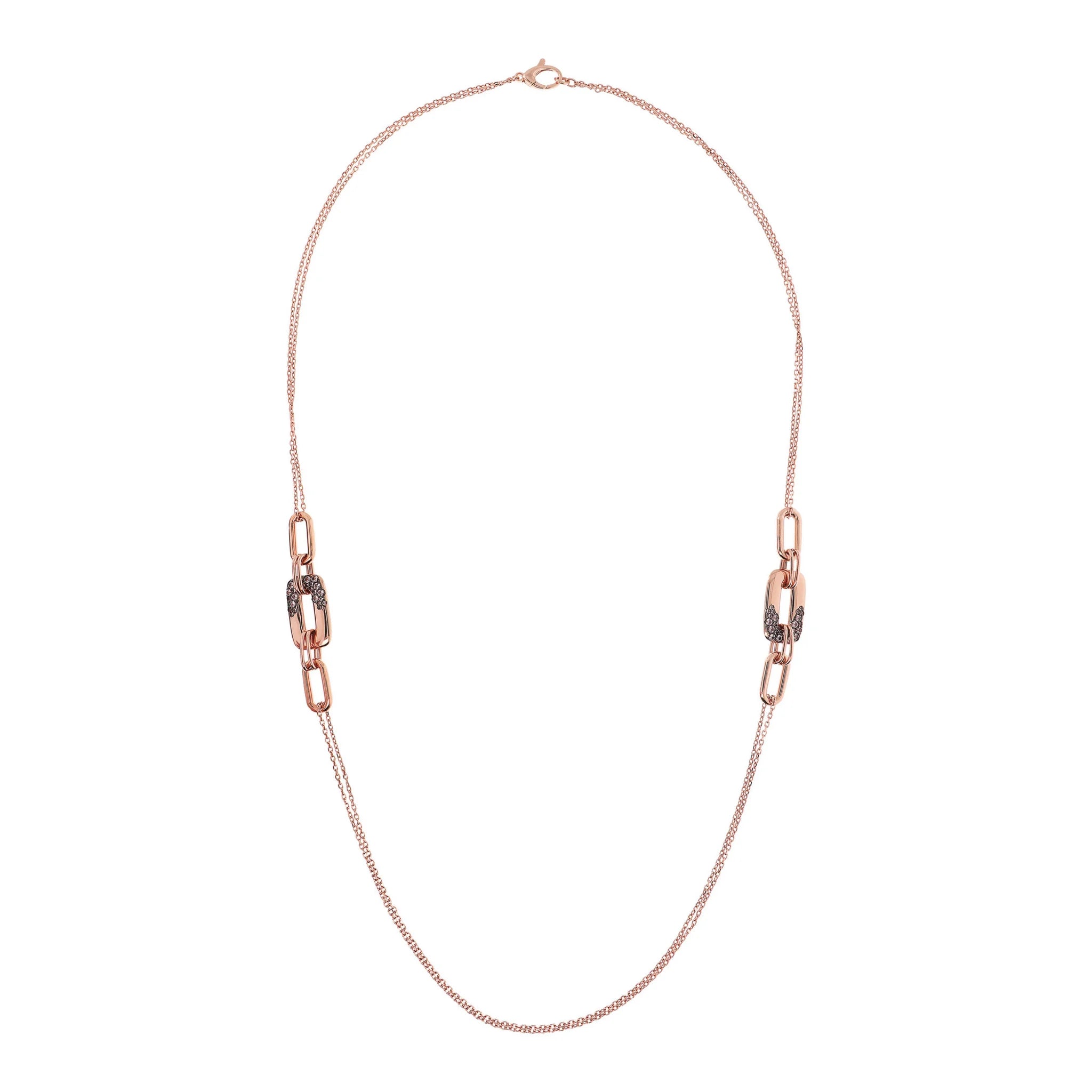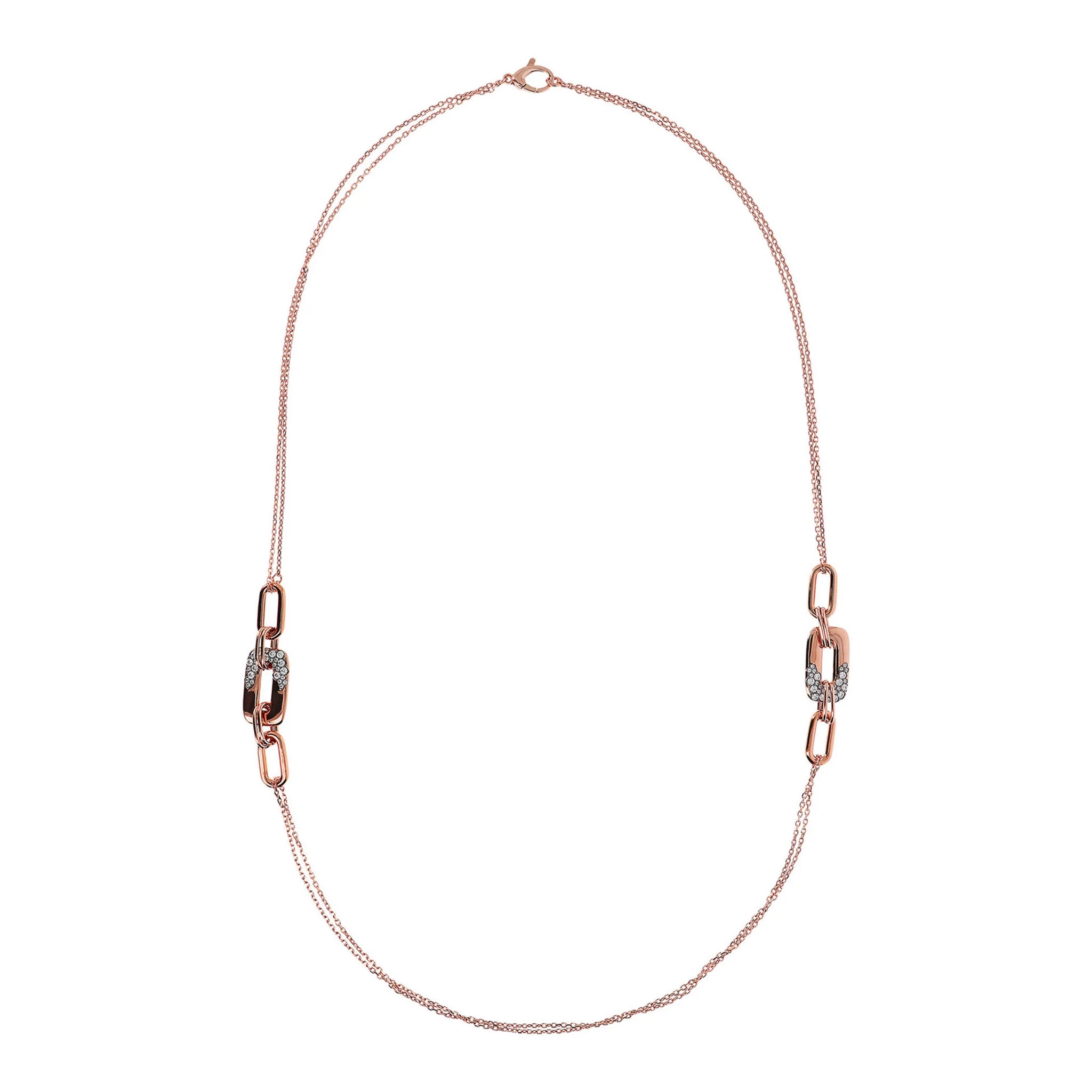 Lange Bronzallure-Halskette aus einer Golden-Rosé-Legierung, 18-Karat rosévergoldet, verziert mit Golden-Rosé-Gliedern und einem rechteckigen Glied, das sich durch ein Pavé-Detail aus hellen Nanokristallen oder Zirkonia auszeichnet