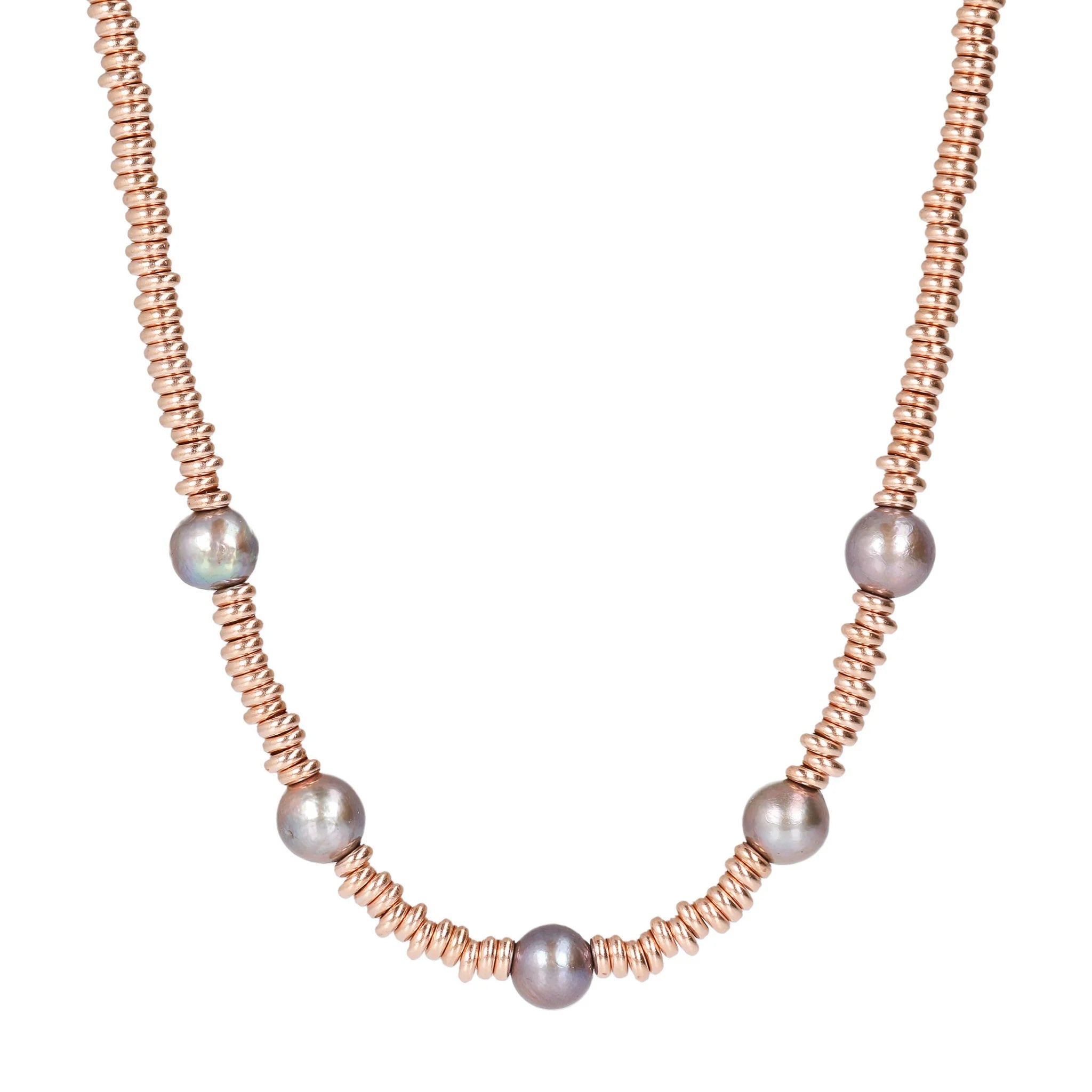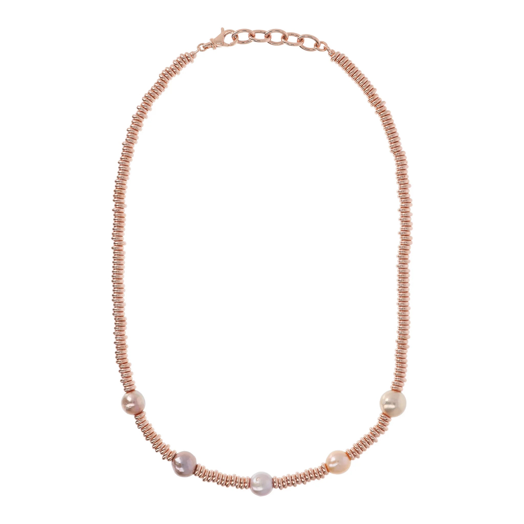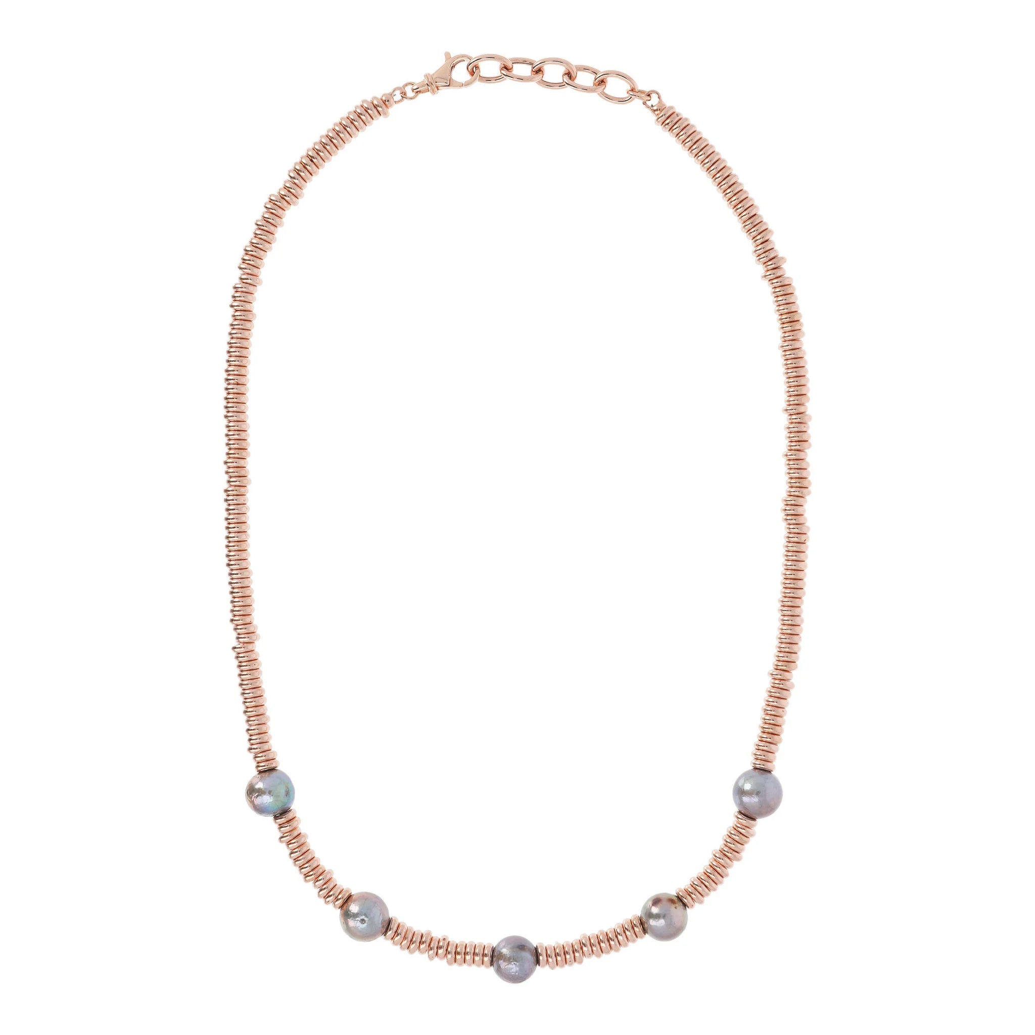 Bronzallure-Halskette aus Golden-Rosé-Legierung, 18-Karat rosévergoldet, verziert mit Golden-Rosé-Scheiben im Wechsel mit grauen, rosafarbenen oder weißen Süßwasser-Zuchtperlen mit einem Durchmesser von 11 mm und runder Form; Karabinerverschluss mit Verlängerung.