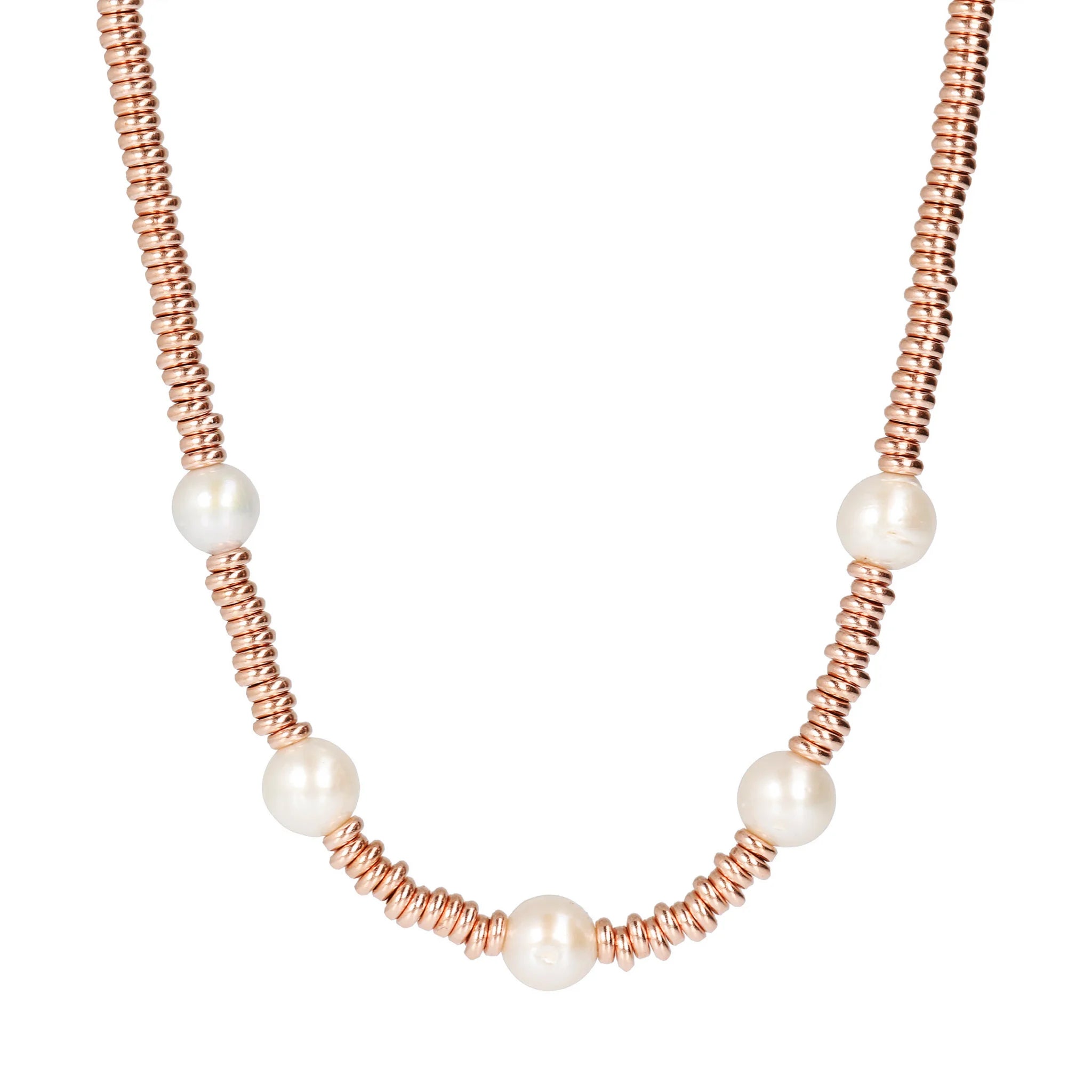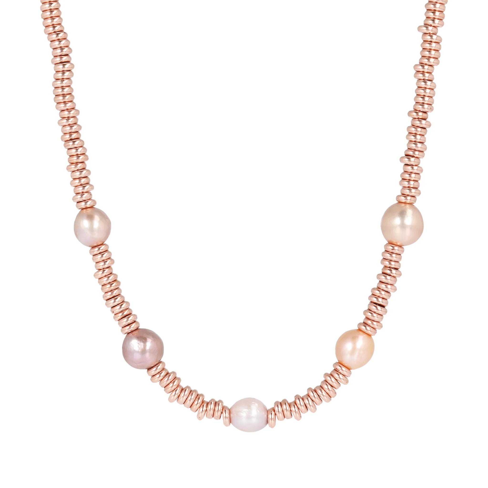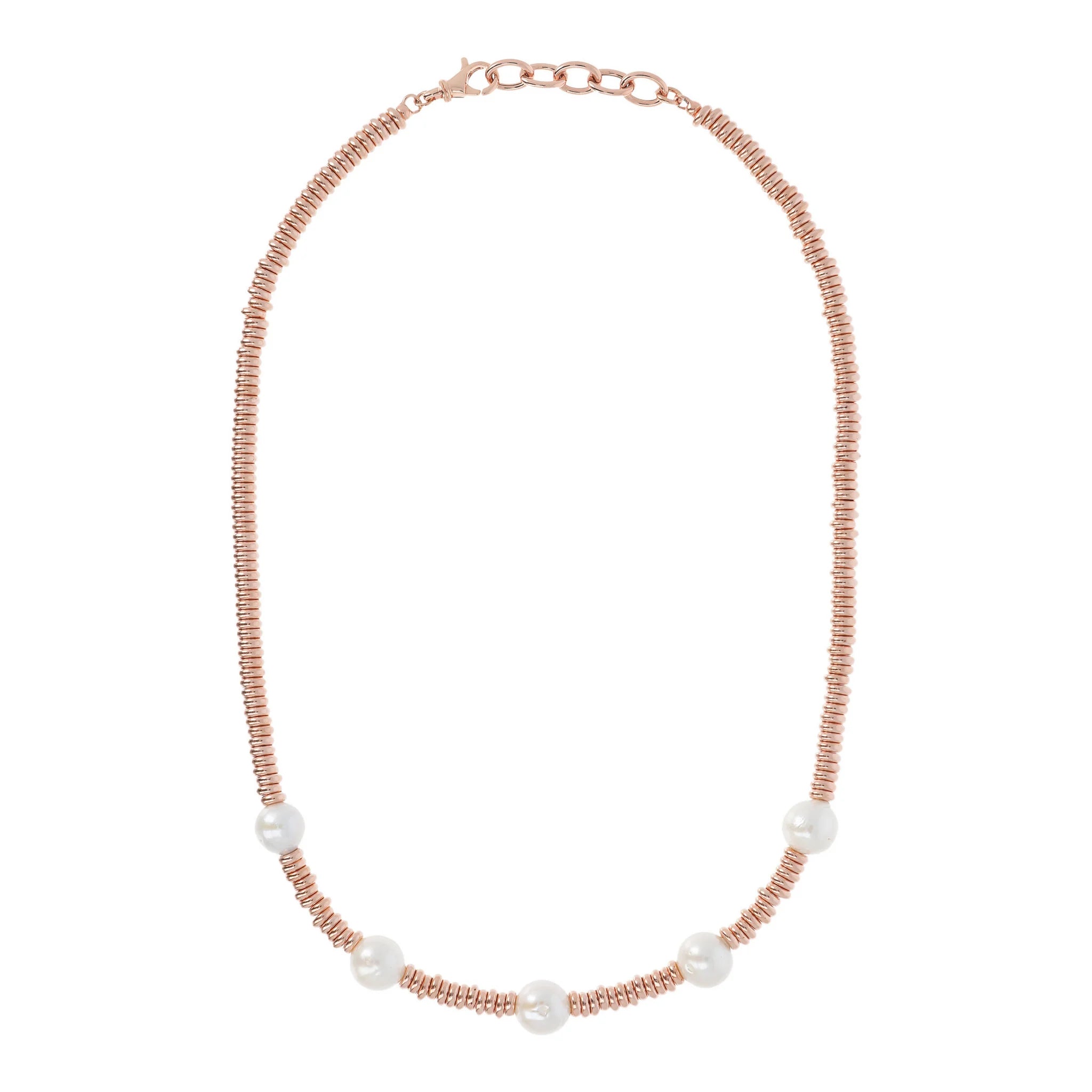 Bronzallure-Halskette aus Golden-Rosé-Legierung, 18-Karat rosévergoldet, verziert mit Golden-Rosé-Scheiben im Wechsel mit grauen, rosafarbenen oder weißen Süßwasser-Zuchtperlen mit einem Durchmesser von 11 mm und runder Form; Karabinerverschluss mit Verlängerung.