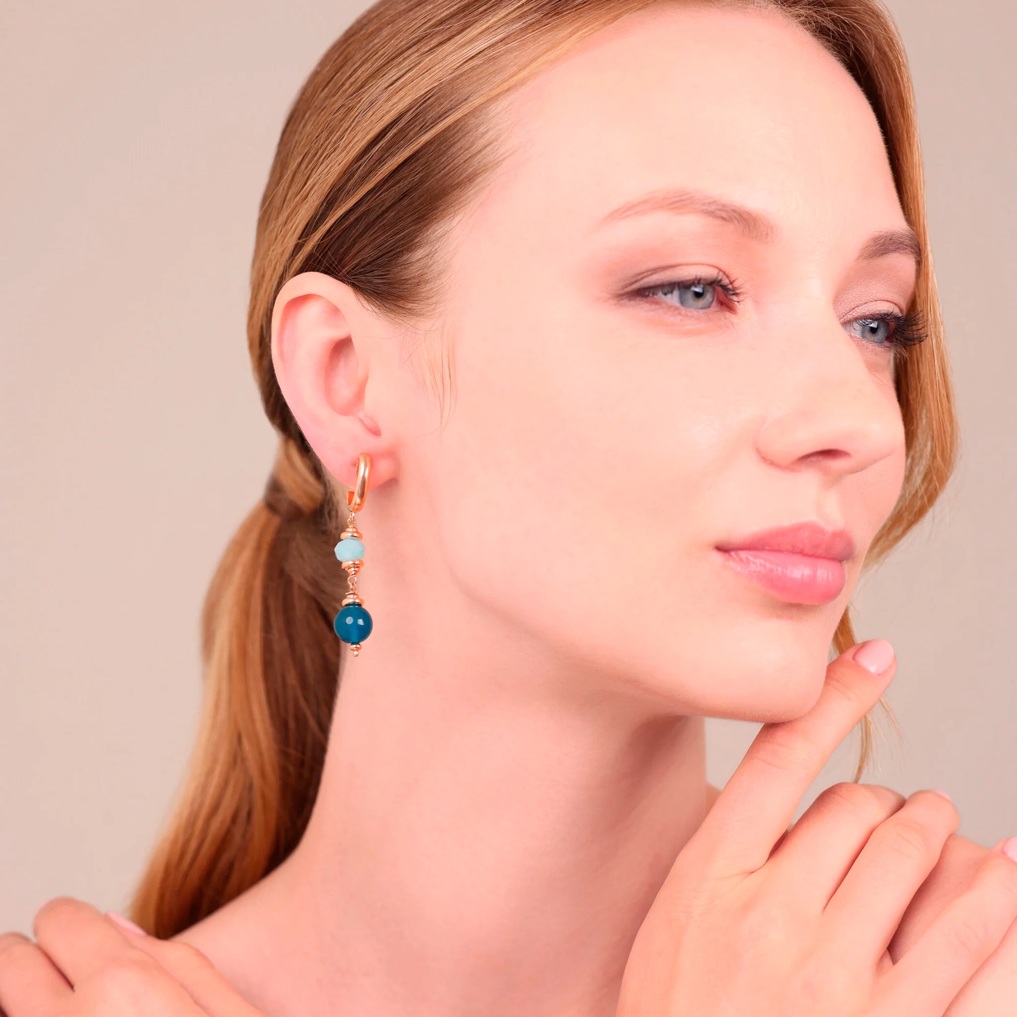 Bronzallure Hängeohrringe aus Golden Rosé Legierung, 18kt rosévergoldet, mit glänzendem Halbkreis-Top, verziert mit Rondellen (8 mm) aus himmelblauer Amazonit und Perlen (10 mm) aus blauer Quarzit. Stecker- und Schmetterlingsverschluss.