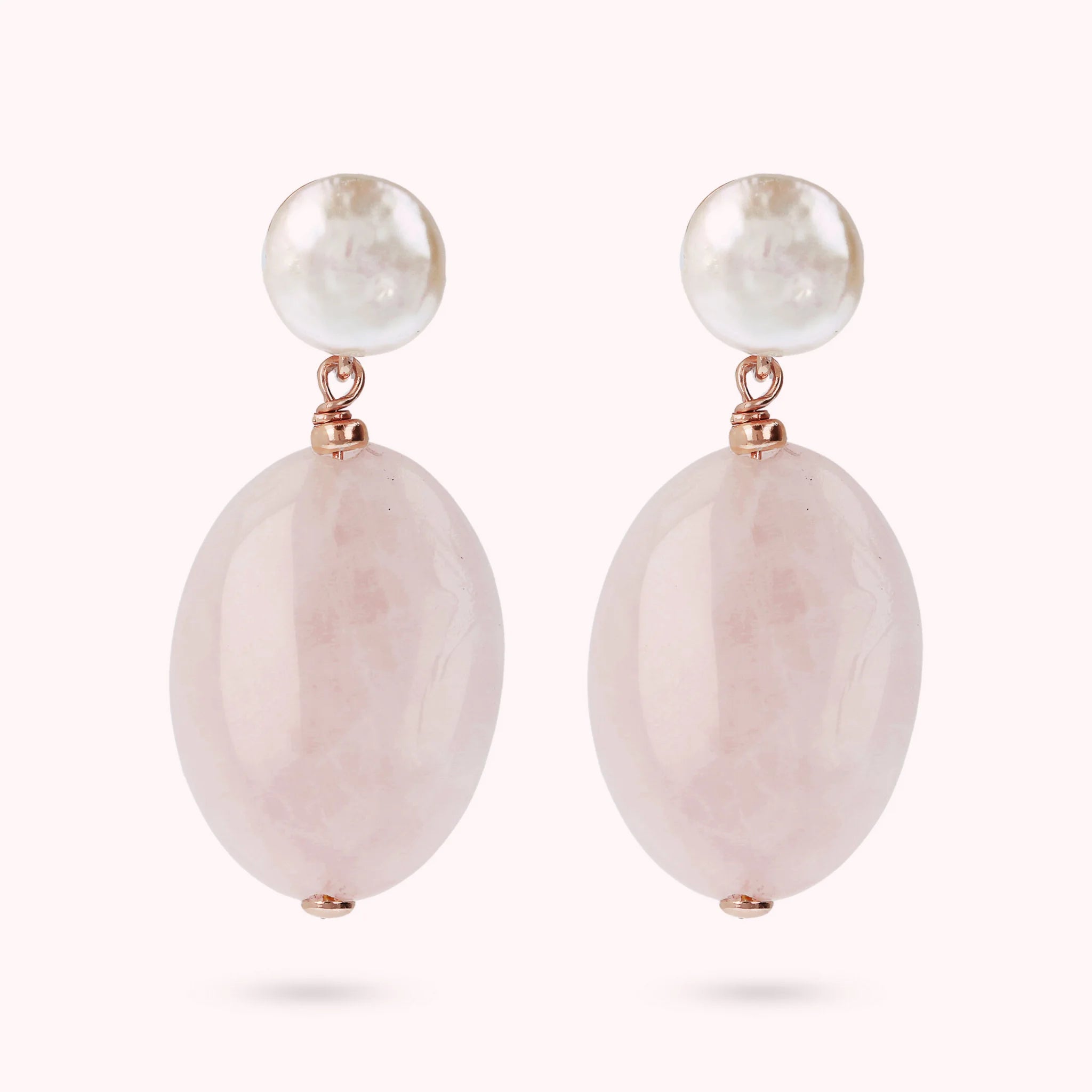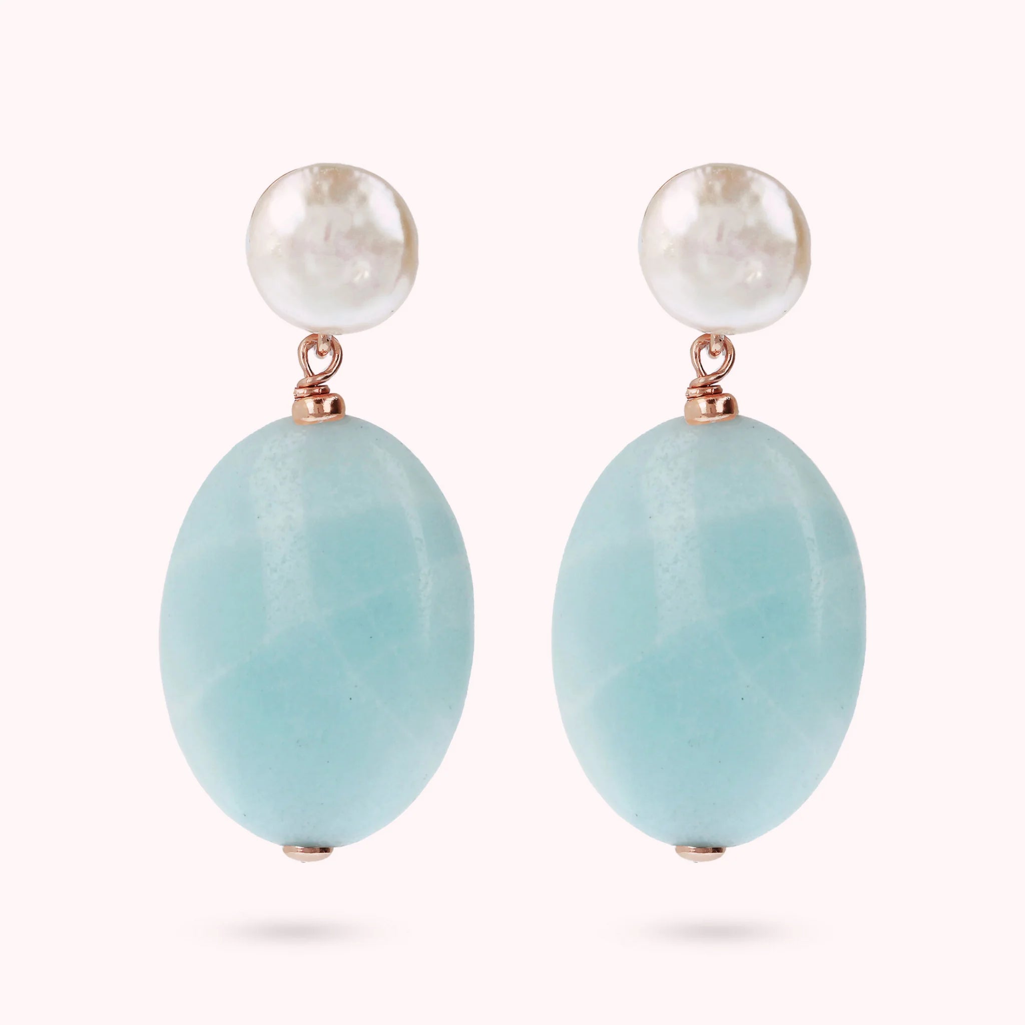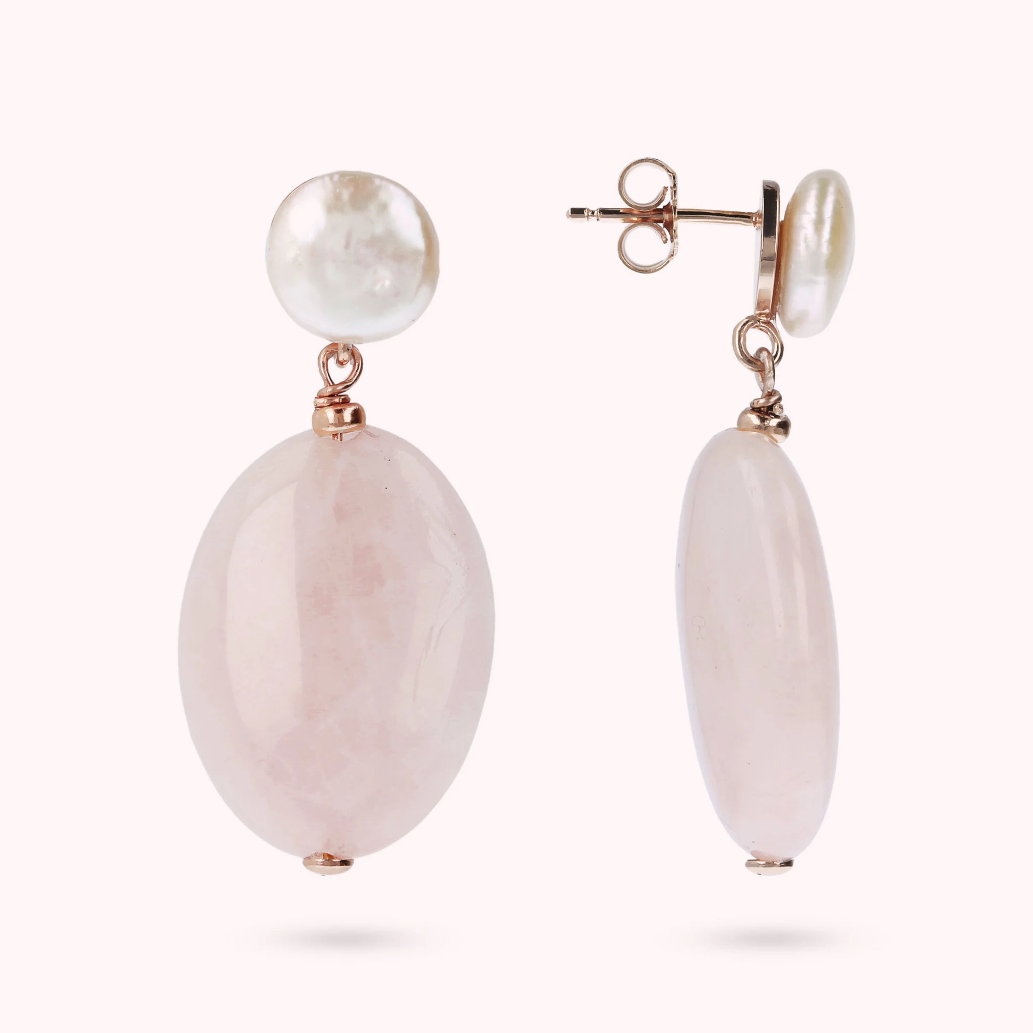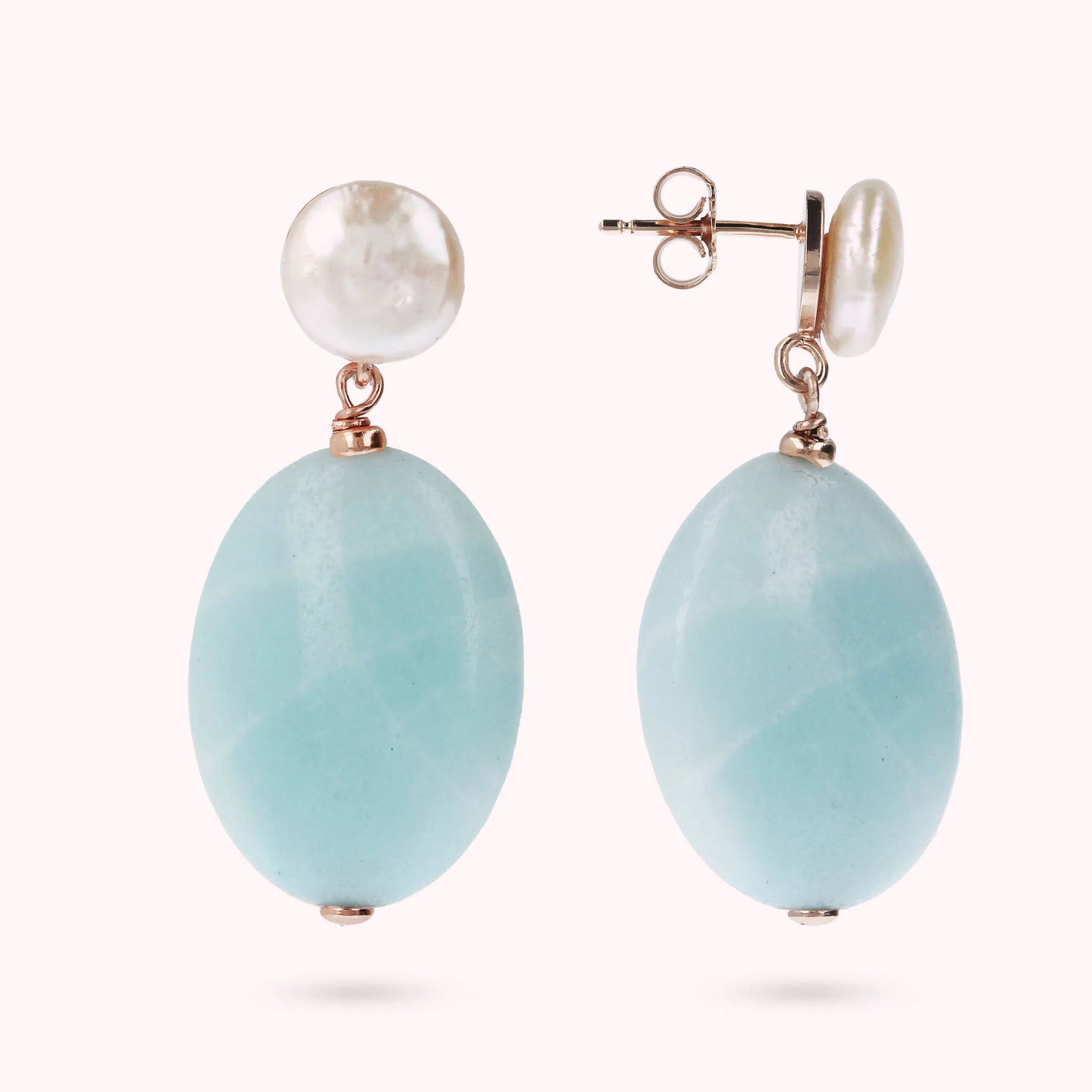 Bronzallure-Ohrringe aus einer Golden-Rosé-Legierung, 18-Karat rosévergoldet, verziert mit weißen Süßwasser-Zuchtperlen (14 mm) und ovalen blauen Amazonit- oder Rosenquarz-Natursteinen. Länge 3,6 cm lang.