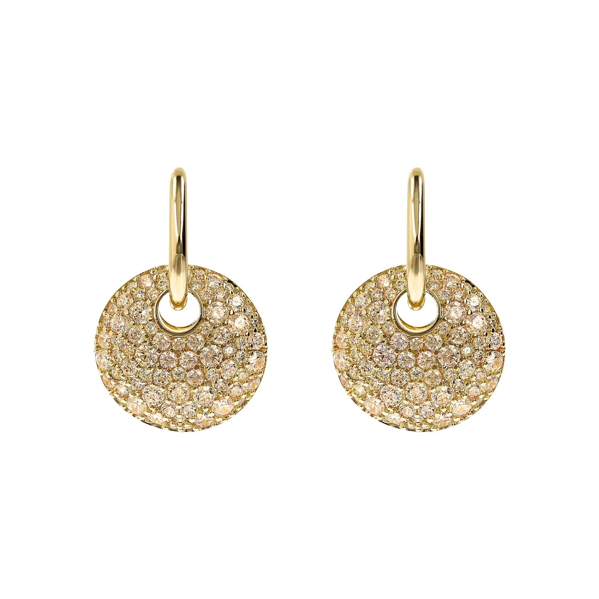 Bronzallure Hängeohrringe aus Golden Rosé Legierung, 18 Karat Gelbgold plattiert, mit einem halbkreisförmigen Gegenring, von dem ein runder Anhänger (30 mm) mit pavé Oberfläche aus kubischem Zirkonia in leuchtender Qualität und kleinen goldfarbenen Punkten hängt. Steckverschluss mit Schmetterlingsverschluss. Länge 2,5 cm.
