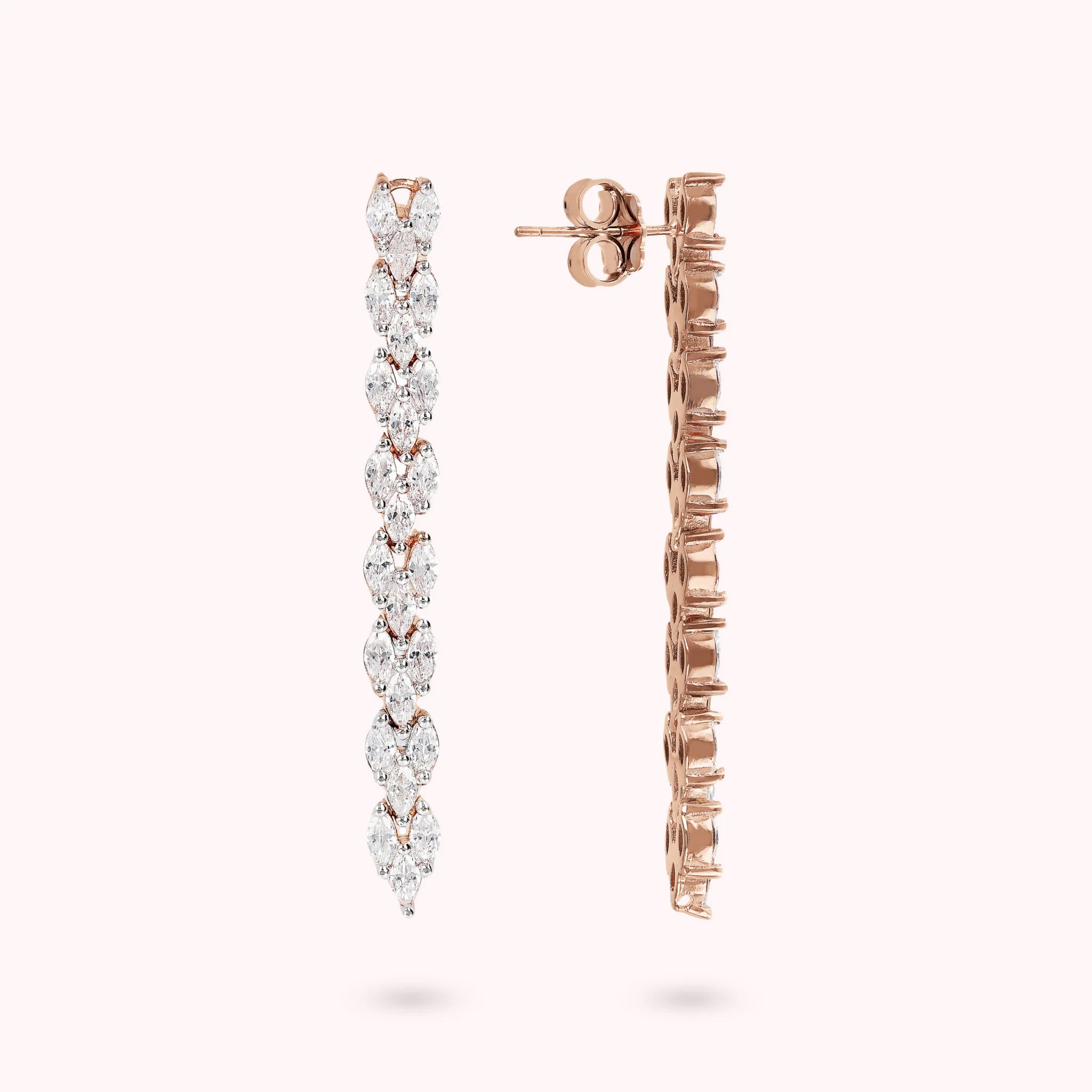 Lange Ohrringe von Bronzallure, hergestellt auf einer Golden Rosé-Basis, 18-Karat rosévergoldet, verziert mit einer Reihe kubischer Zirkonia, 5 cm lang.