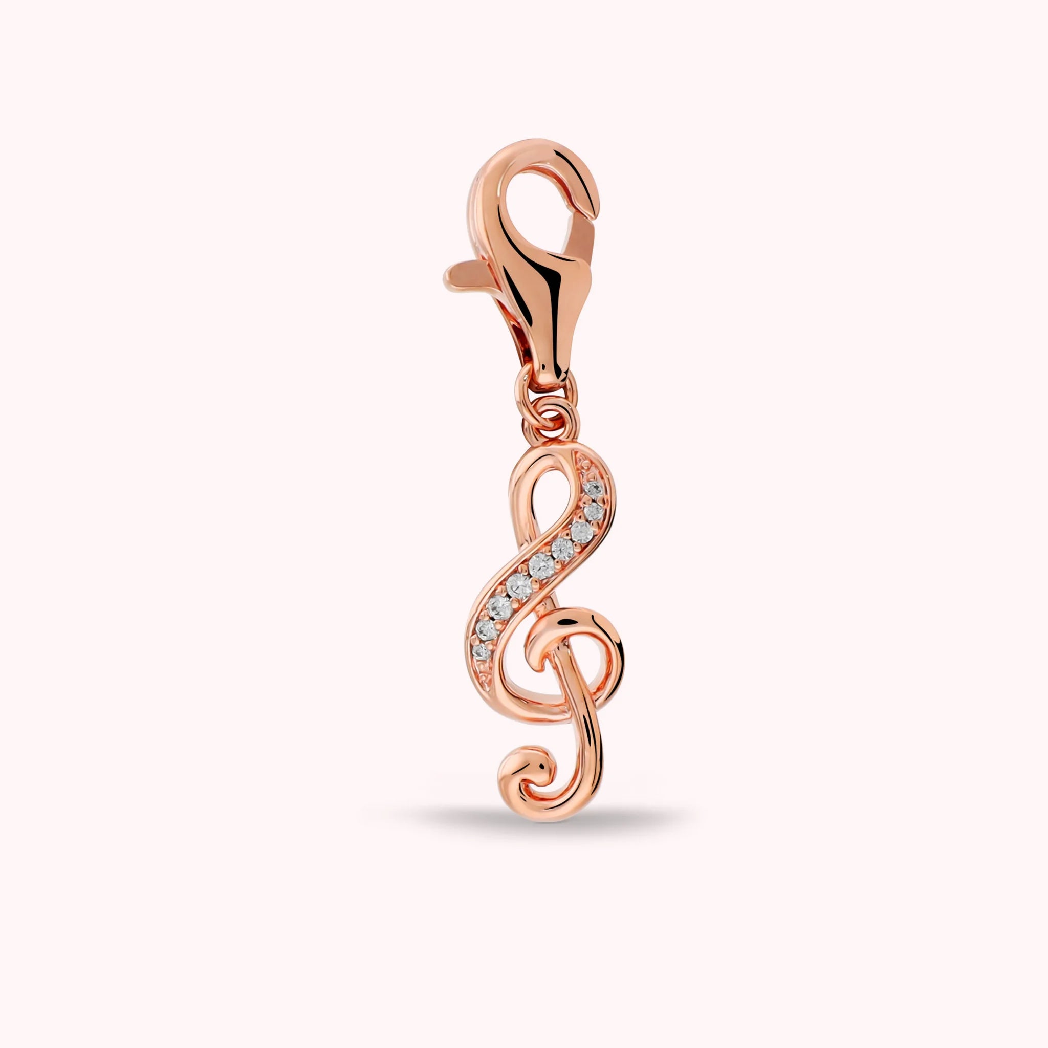 Bronzallure Geigenschlüssel-Anhänger aus der Legierung Golden Rosé, mit 18 Karat Gold überzogen, besetzt mit funkelnden Zirkonia-Steinen. Ausgestattet mit Karabinerhaken. Passend zum Charms-Armband mit abwechselnden Gliedern.