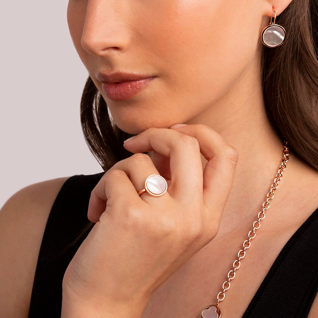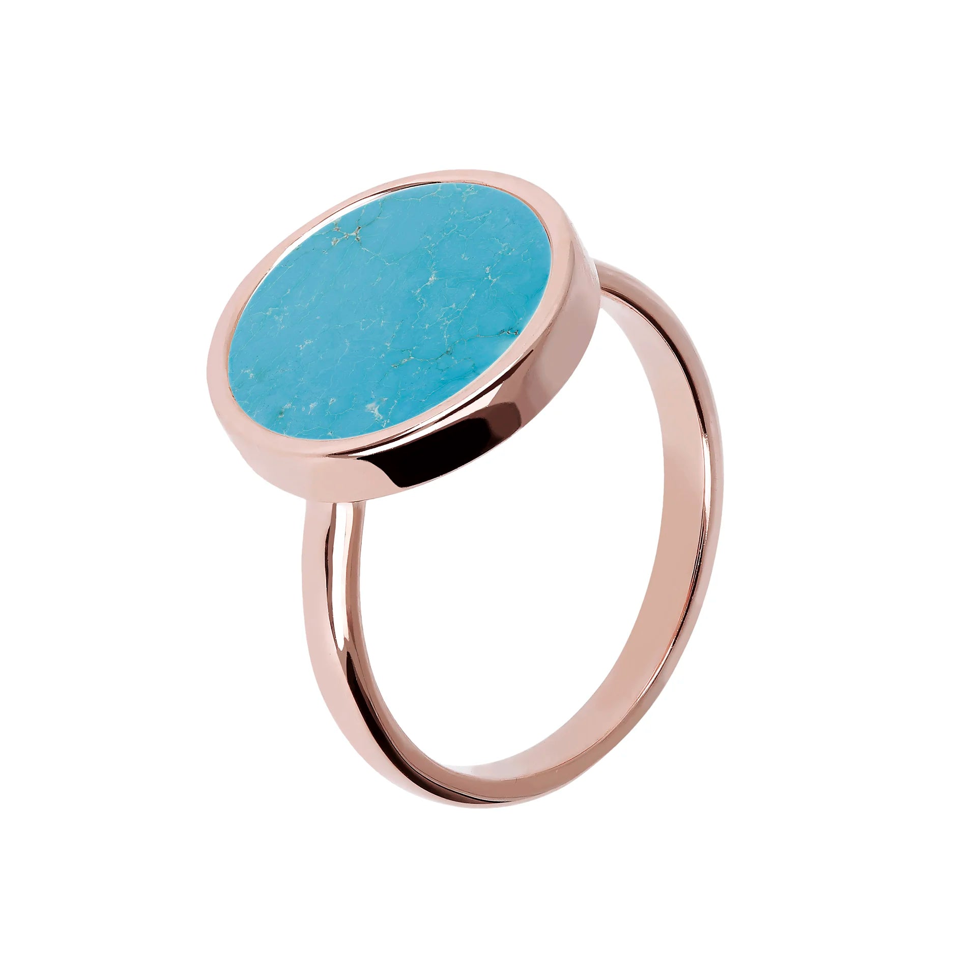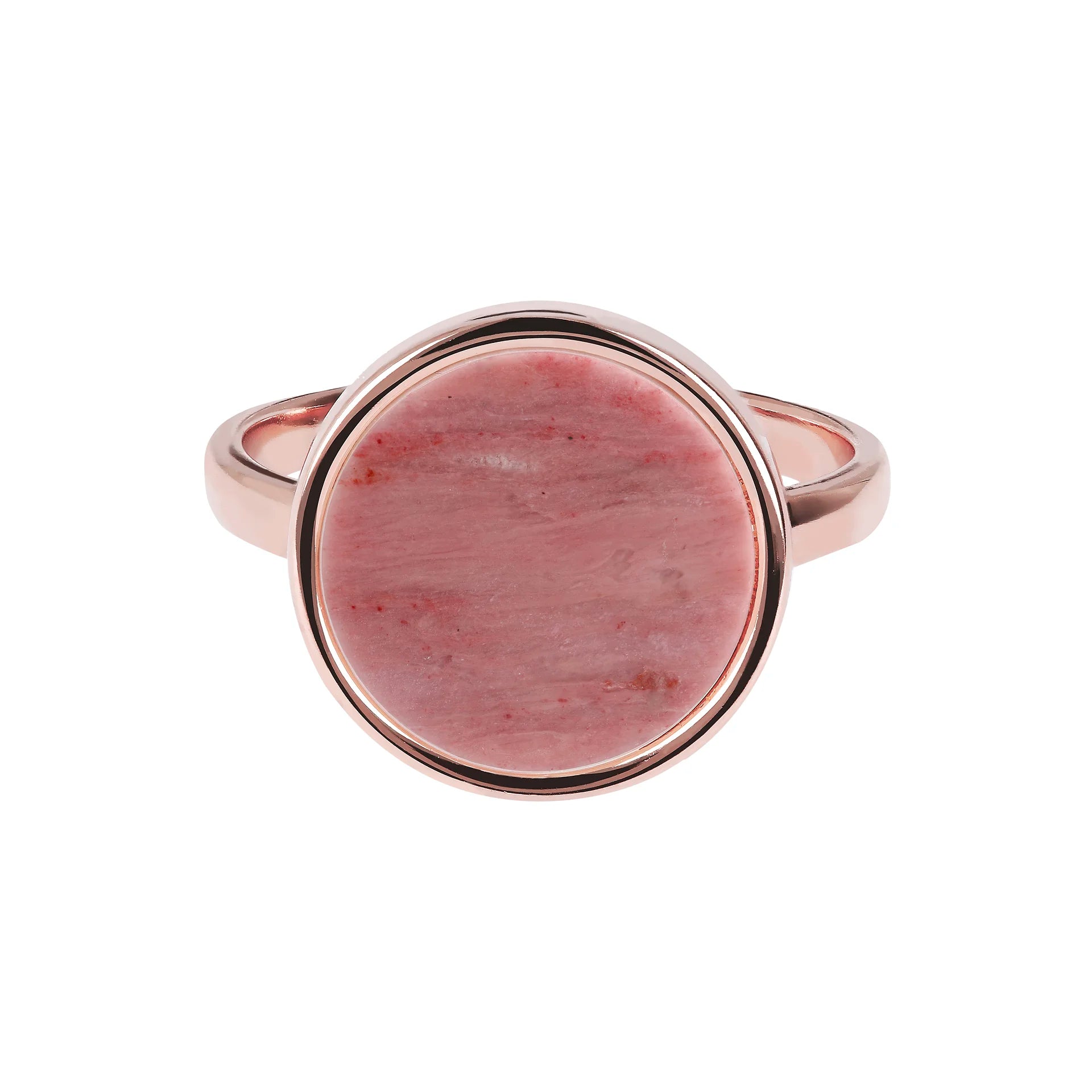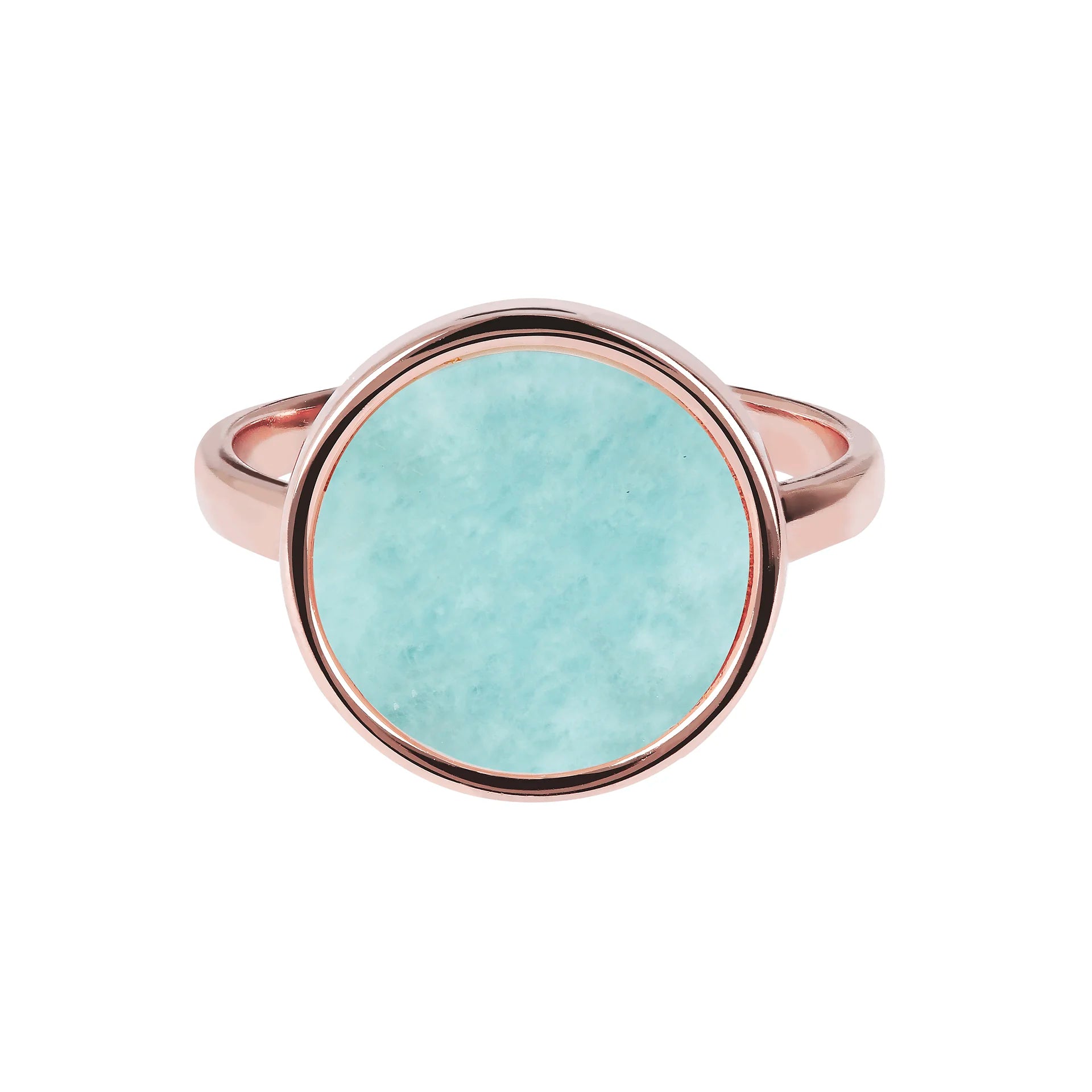 Bronzallure-Cocktailring aus einer Golden-Rosé-Legierung, 18-karätig rosévergoldet, verziert mit einem runden (1,2 cm) in der Mitte positionierten Naturstein in leuchtenden Farben.