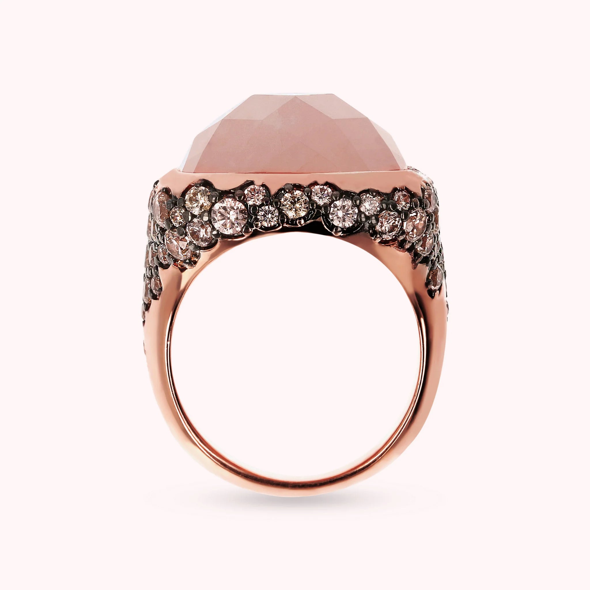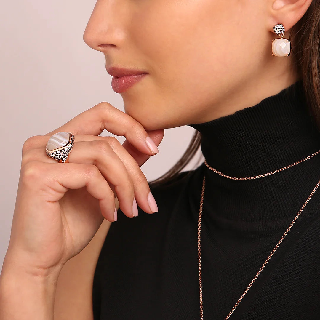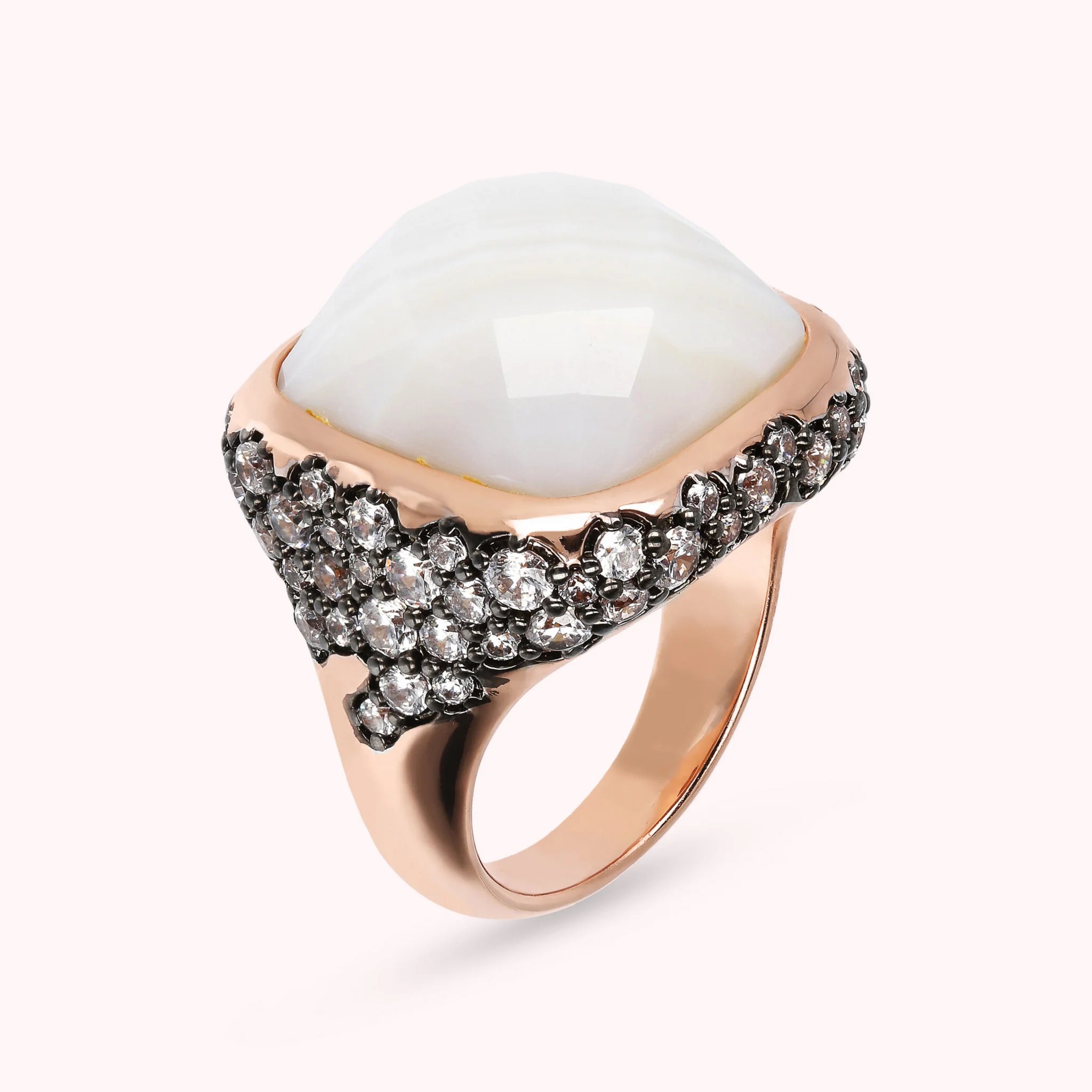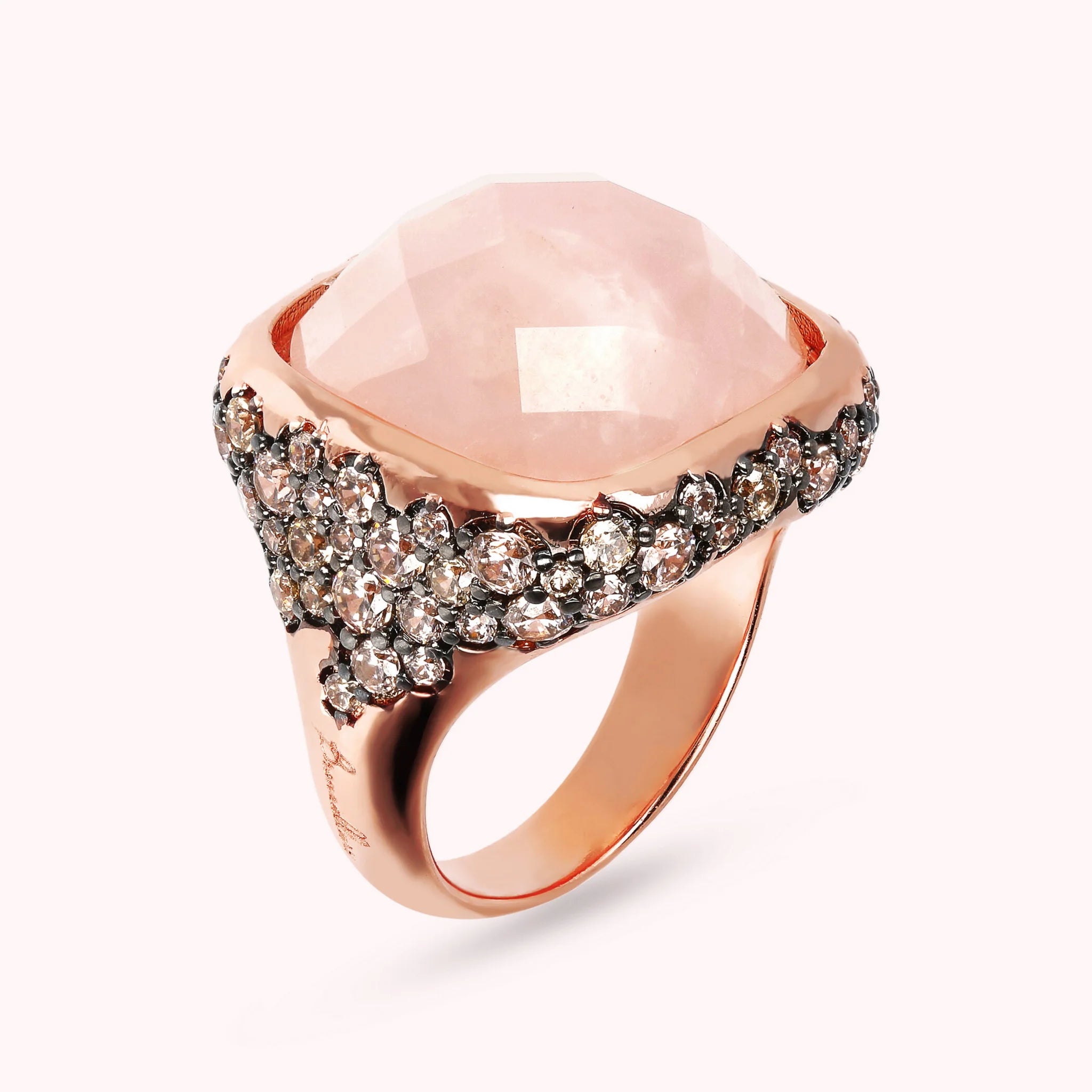 Bronzallure Chevalier-Ring auf Golden Rosé-Basis, 18 Karat Roségold vergoldet, mit quadratischem Naturstein (16 x 16 mm), mit Facettenschliff. Der darunter liegende Teil ist mit Pavé aus kleinen runden Natursteinen oder Zirkonia bedeckt.