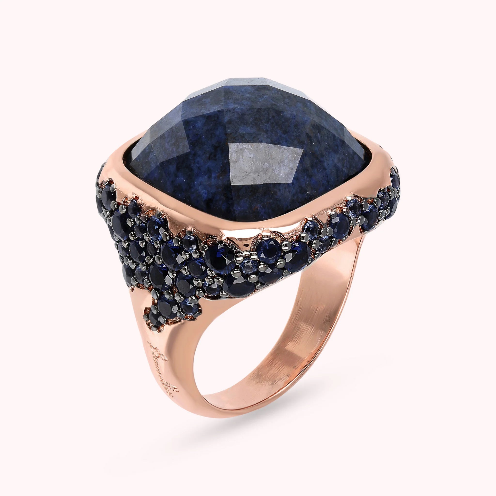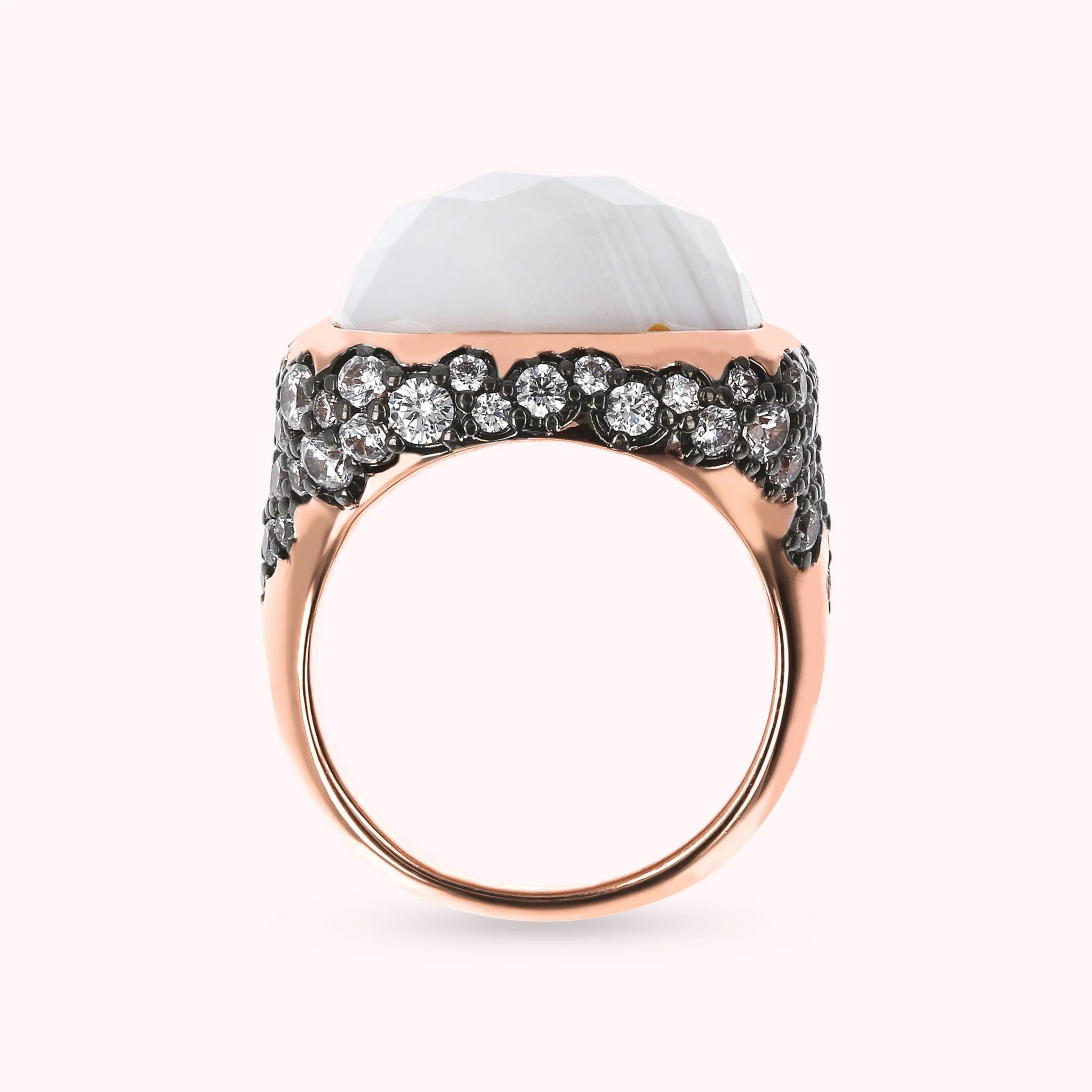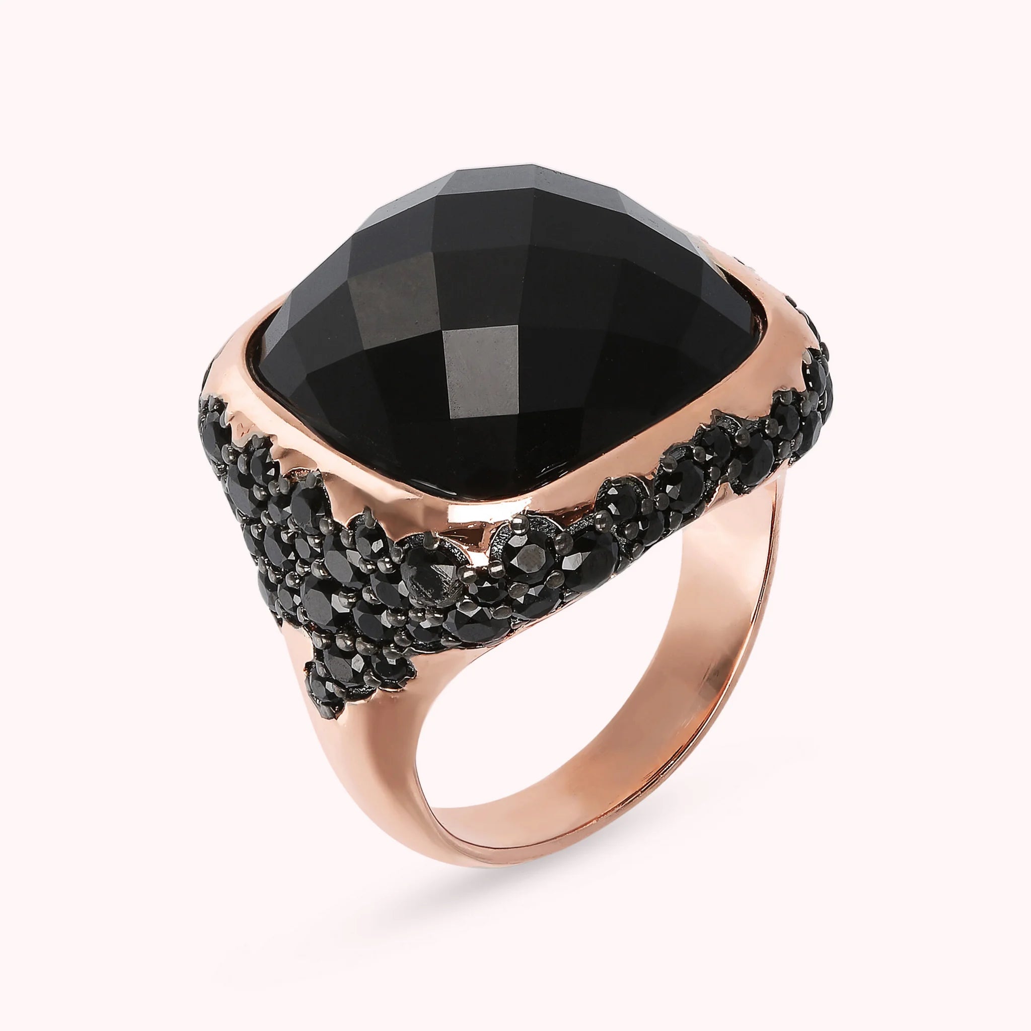 Bronzallure Chevalier-Ring auf Golden Rosé-Basis, 18 Karat Roségold vergoldet, mit quadratischem Naturstein (16 x 16 mm), mit Facettenschliff. Der darunter liegende Teil ist mit Pavé aus kleinen runden Natursteinen oder Zirkonia bedeckt.