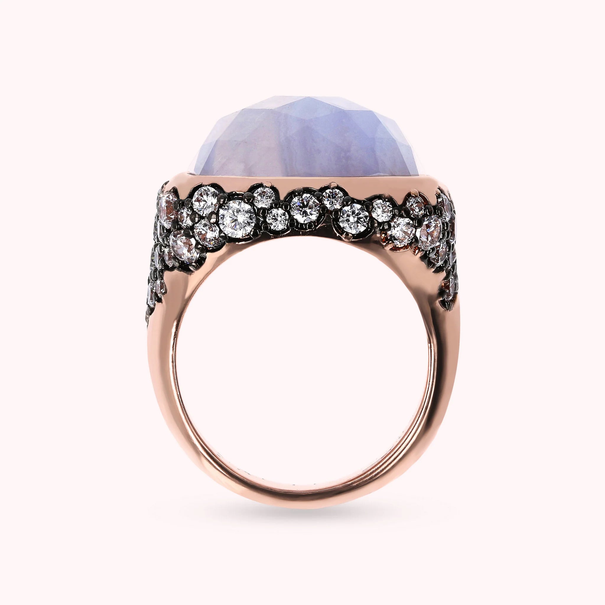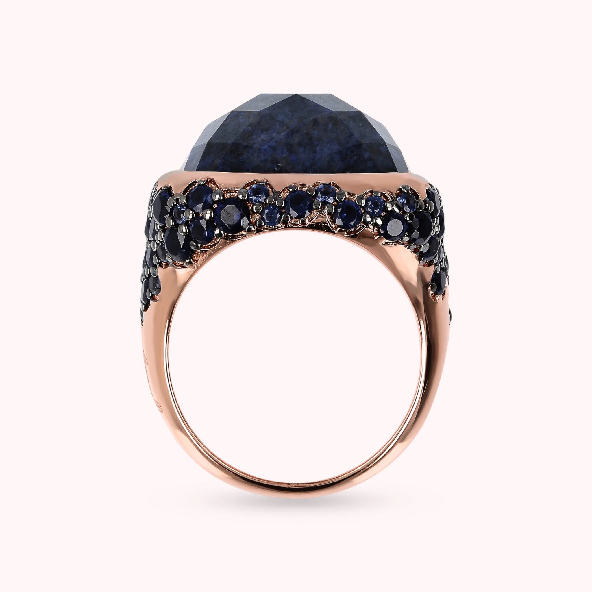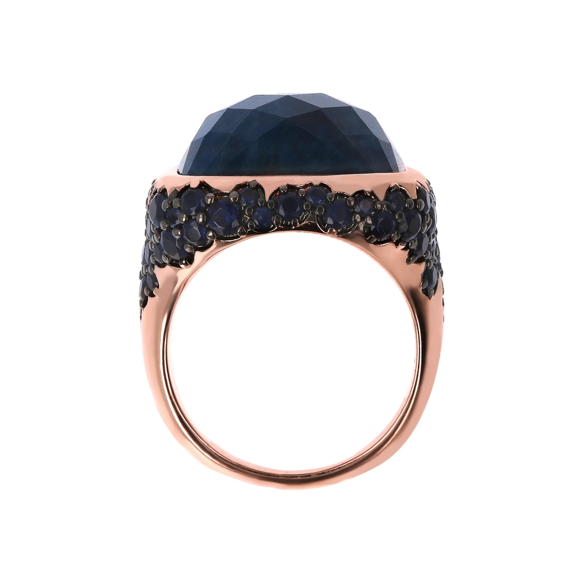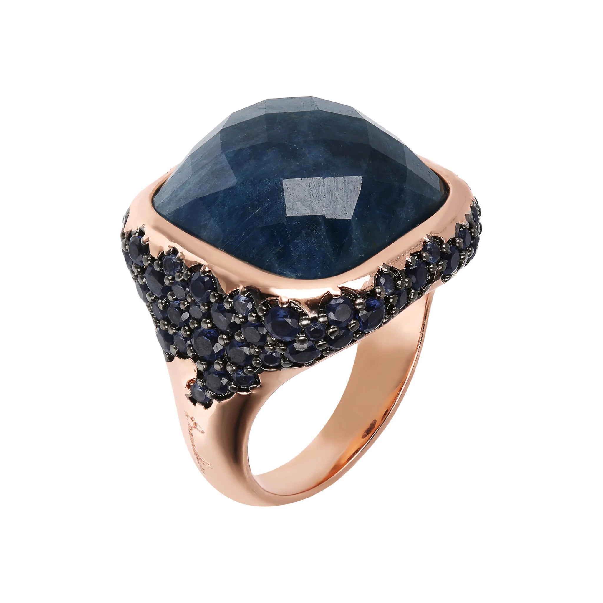 Bronzallure Chevalier-Ring auf Golden Rosé-Basis, 18 Karat Roségold vergoldet, mit quadratischem Naturstein (16 x 16 mm), mit Facettenschliff. Der darunter liegende Teil ist mit Pavé aus kleinen runden Natursteinen oder Zirkonia bedeckt.