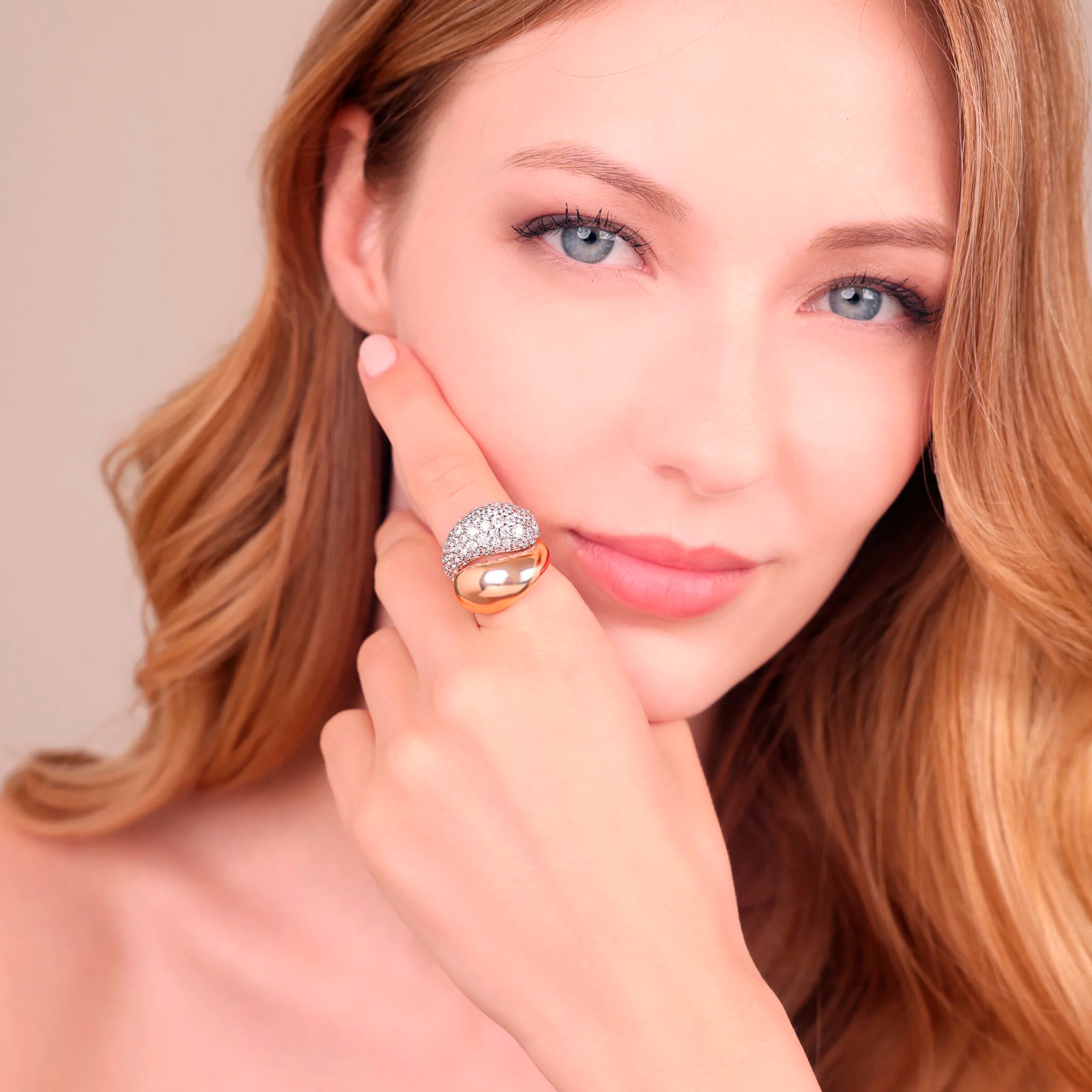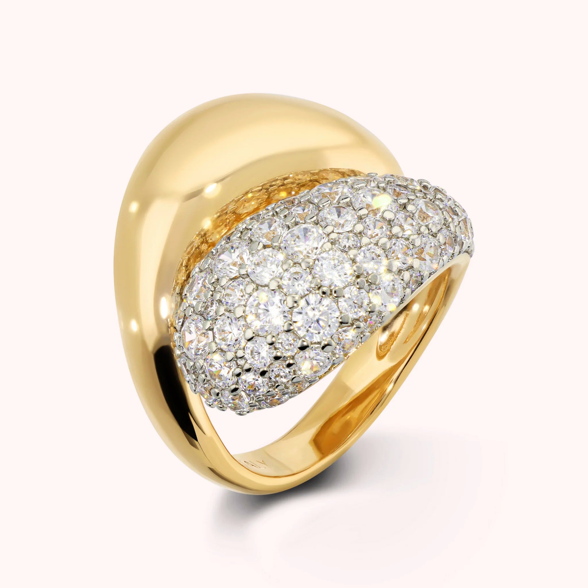 Linee eleganti che si incontrano, con estremità lucide e scintillanti in pavé, per un anello che gioca con luce e movimento.
