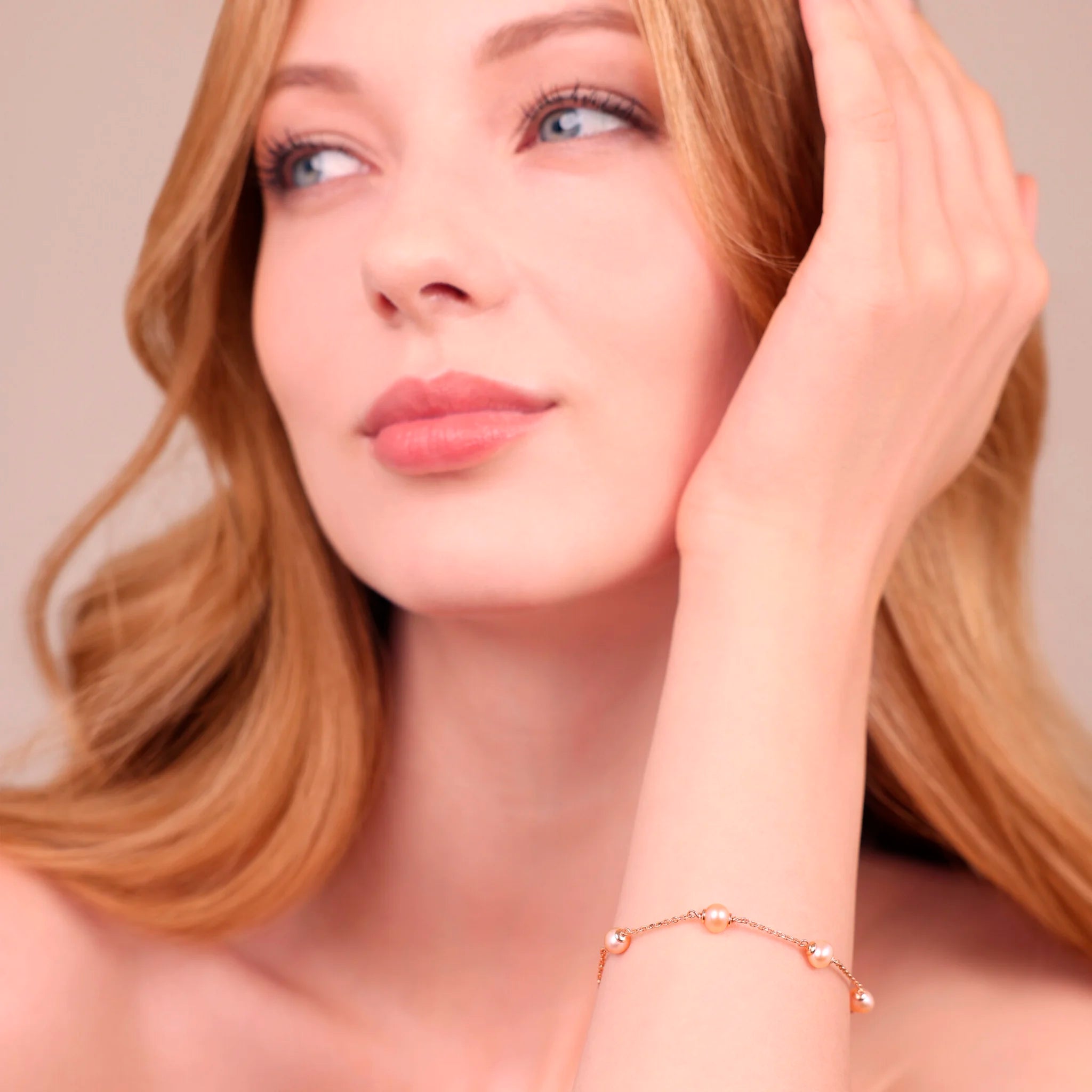 Bracciale Bronzallure in Argento placcato Oro, arricchito da sei piccole perle rosa coltivate d’acqua dolce. Un accessorio elegante e discreto, perfetto per un tocco di femminilità quotidiana.