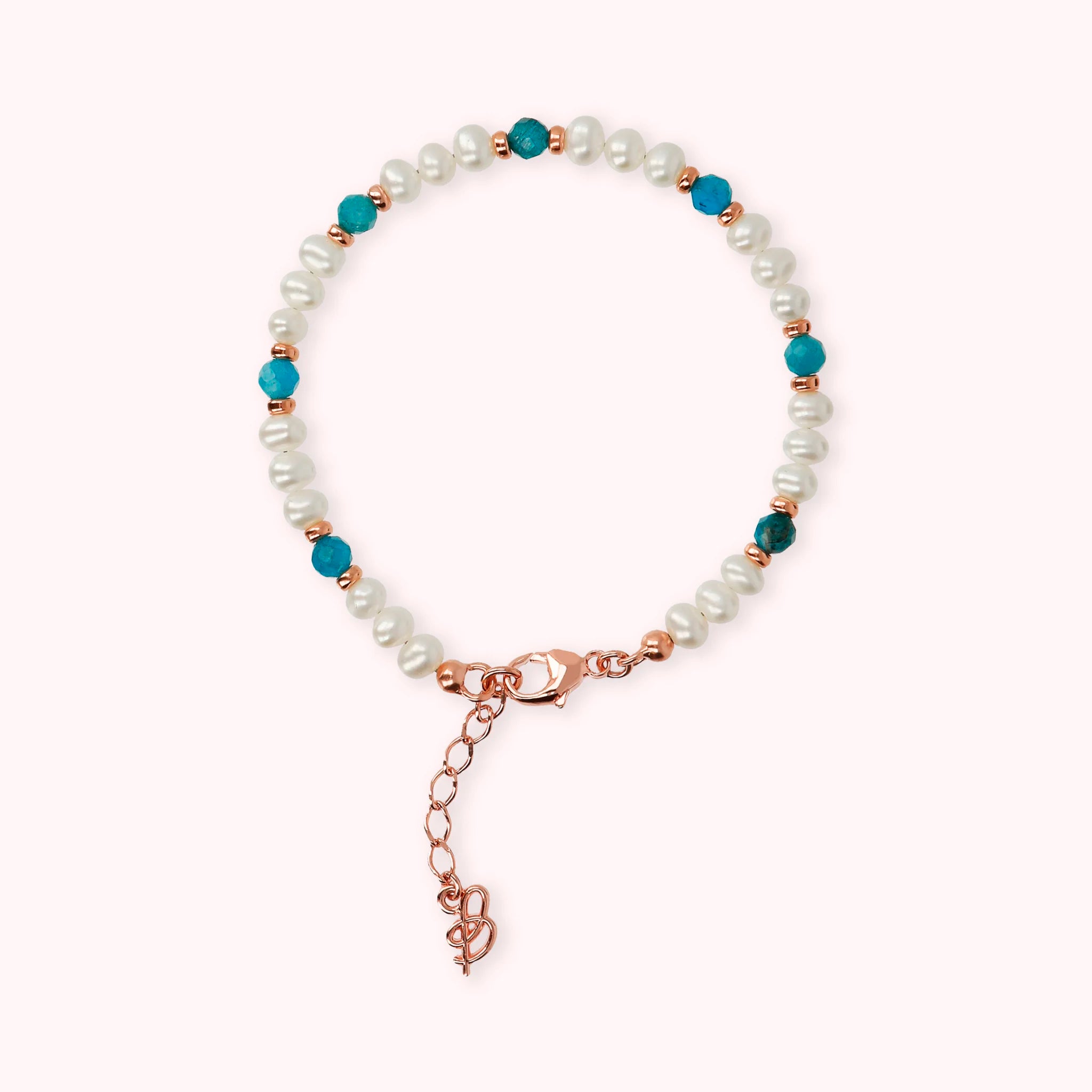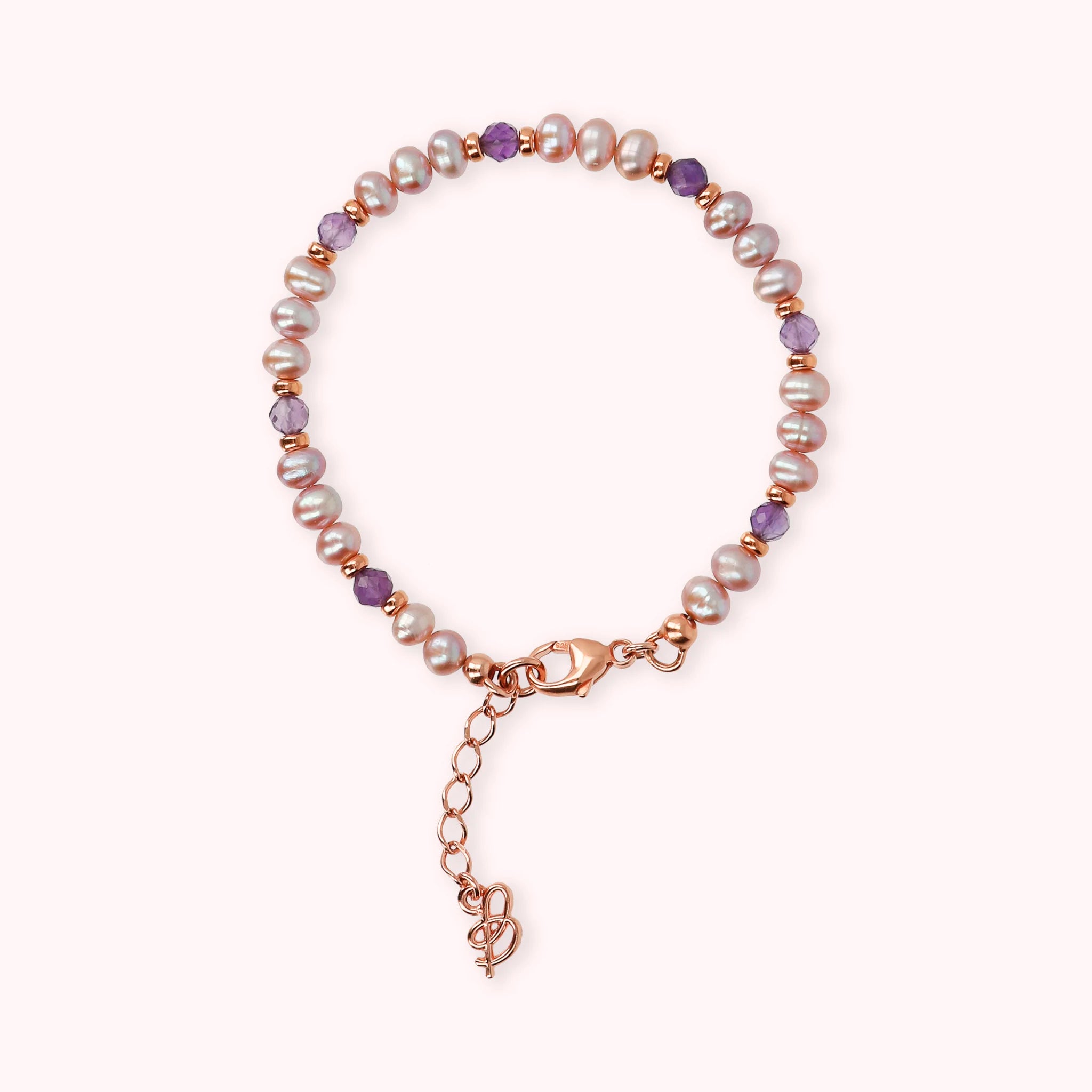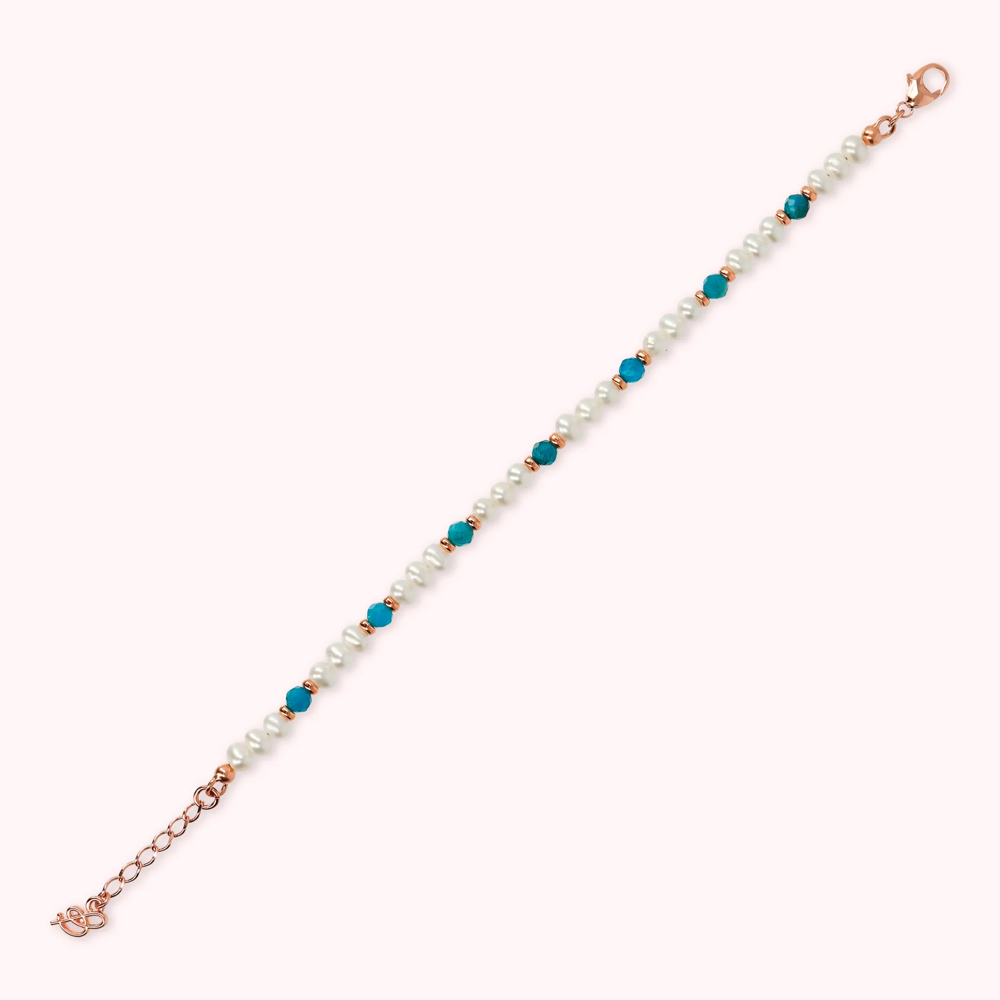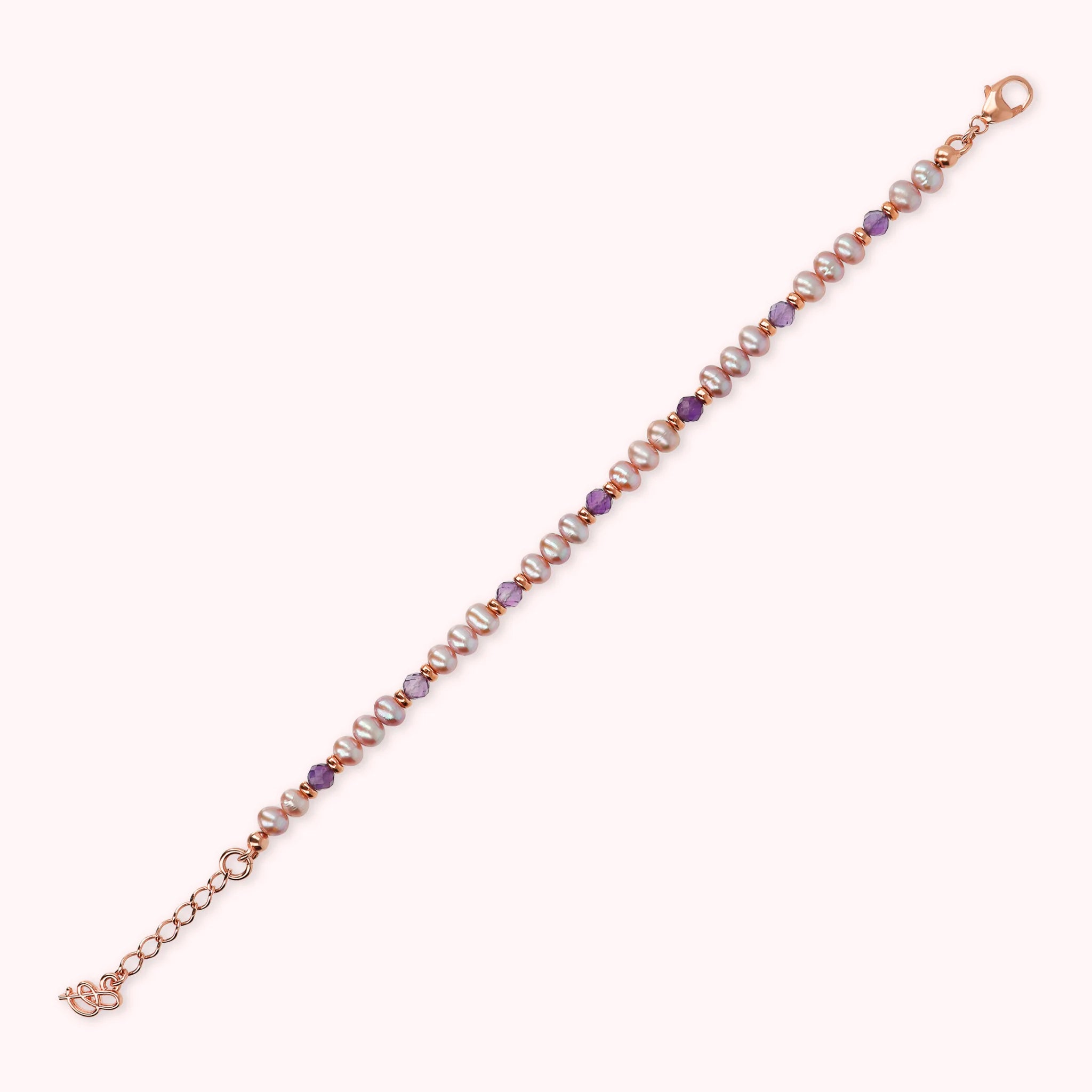 Bronzallure-Armband auf Basis von Golden Rosé, 18 Karat rosévergoldet, abwechselnd verziert mit kleinen facettierten Natursteinen (4 mm) und Süßwasser-Zuchtperlen mit einem Durchmesser von ca. 4/5 mm. An den Seiten der Natursteine befinden sich kleine Golden Rosé-Scheiben; Karabinerverschluss mit Verlängerung.