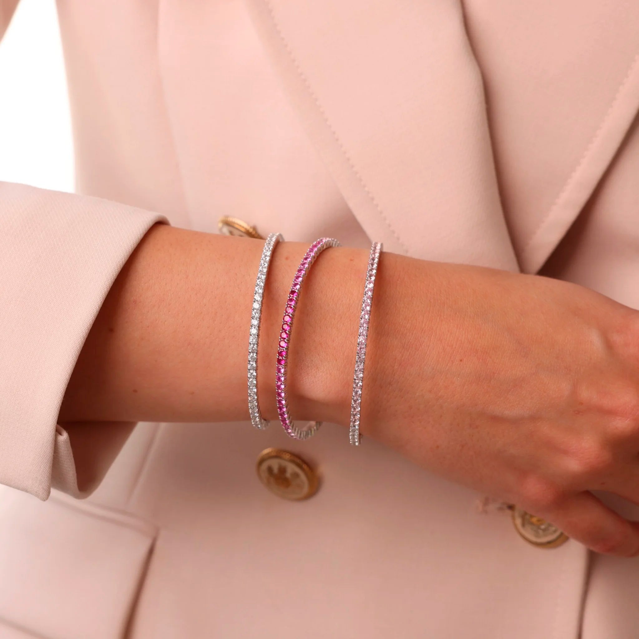 Steifer Tennisarmband Bronzallure aus Golden Rosé Legierung, rhodiniert, veredelt mit weißen Zirkonias (2,5 mm), leuchtende Qualität. Schiebverschluss. Innendurchmesser 60x50 mm.