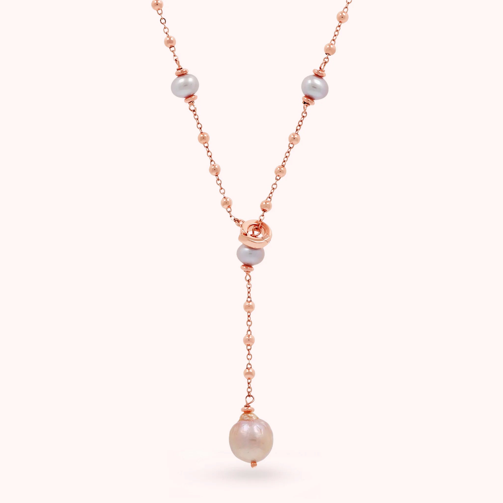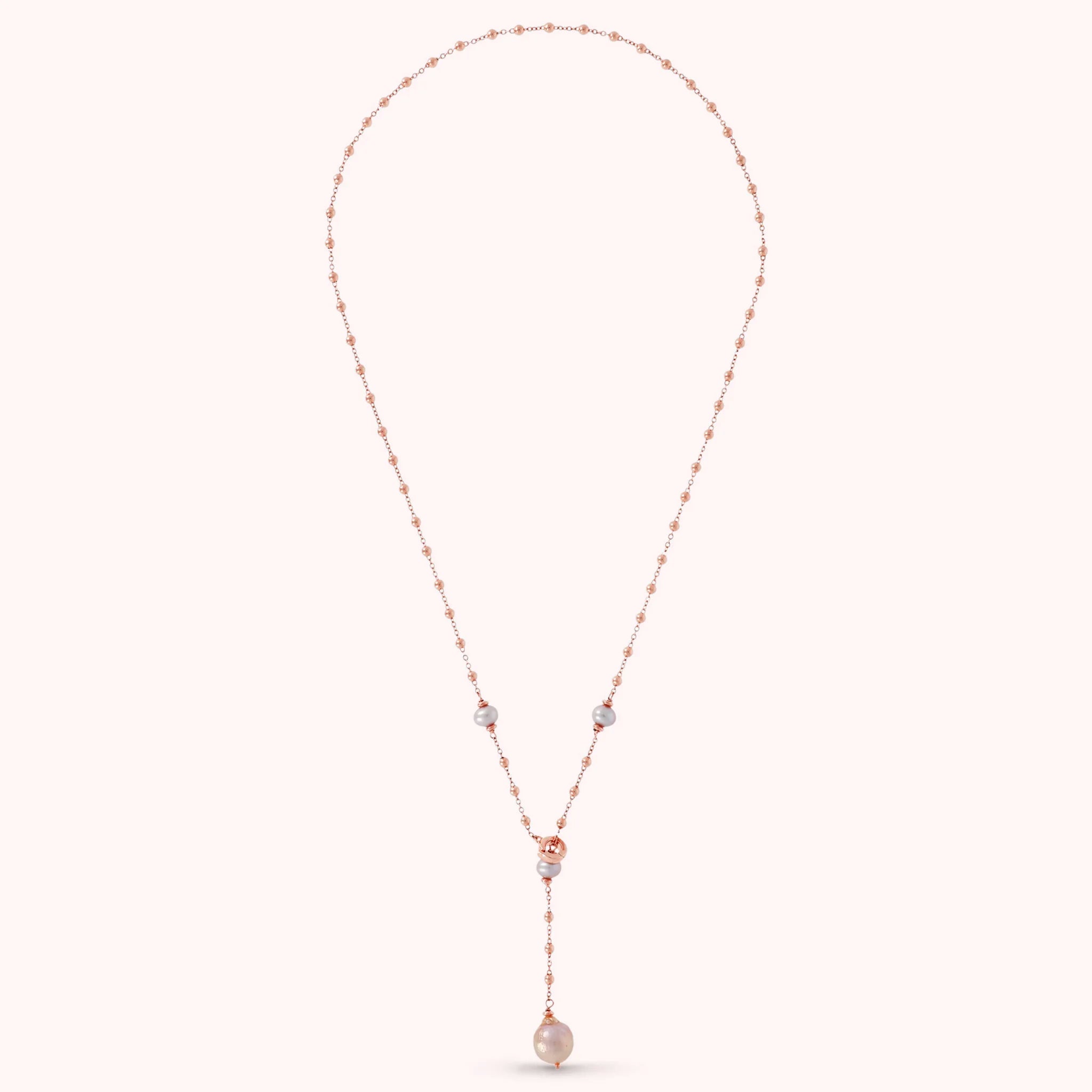 Bronzallure-Y-Halskette aus Golden-Rosé-Legierung, 18-Karat rosévergoldet, mit Rosenkranzkette, verziert mit Golden-Rosé-Kugeln und rosa und violetten Süßwasser-Zuchtperlen; Clipverschluss.
