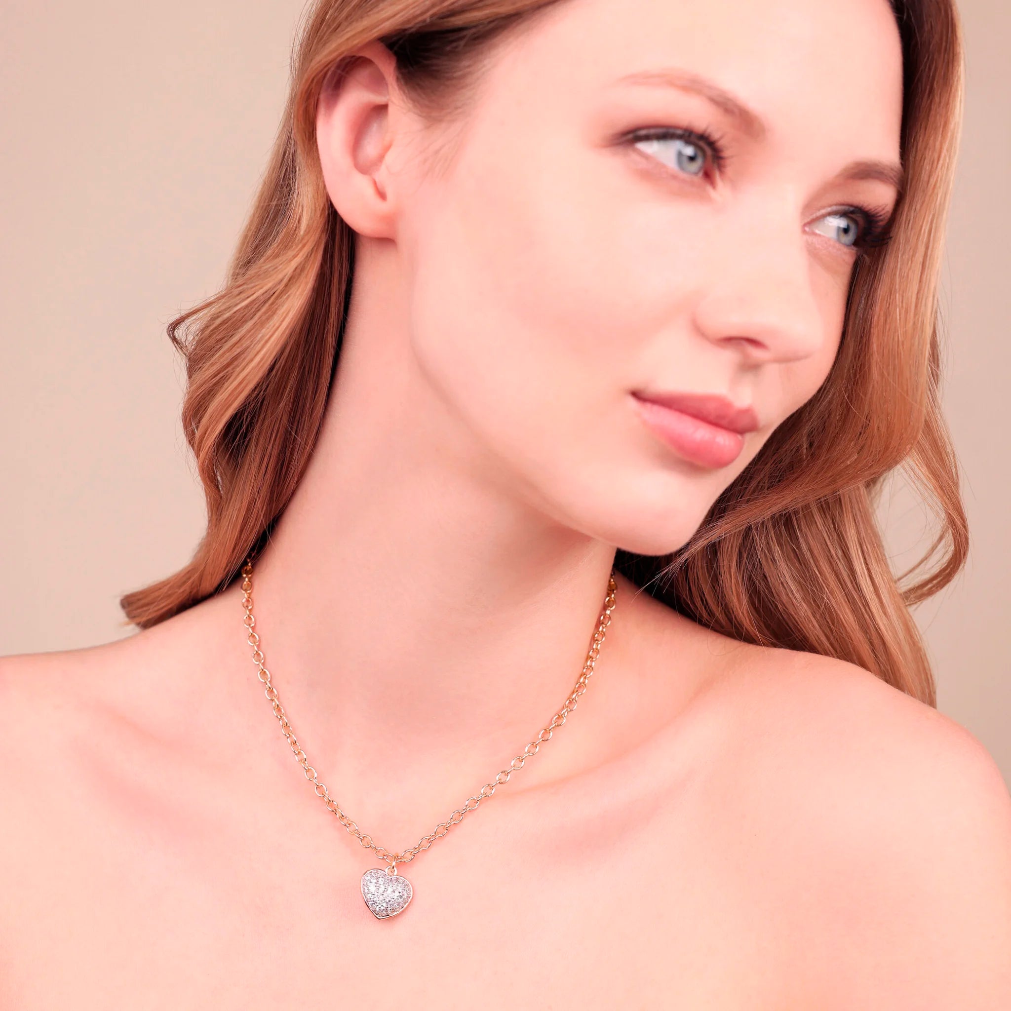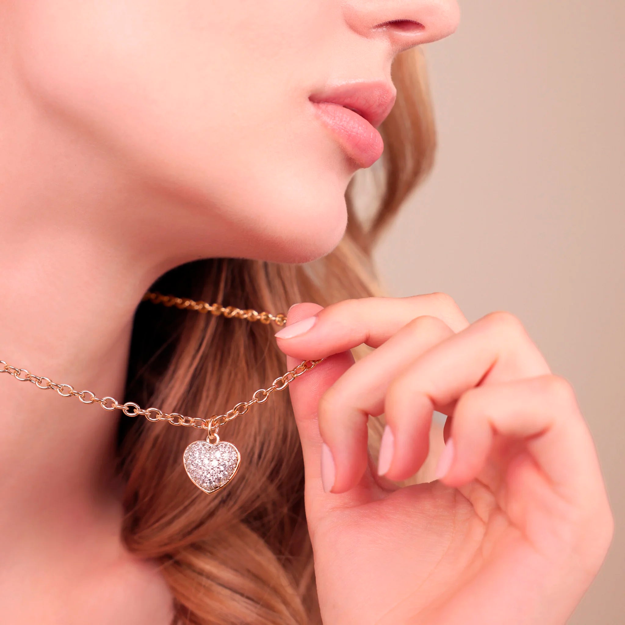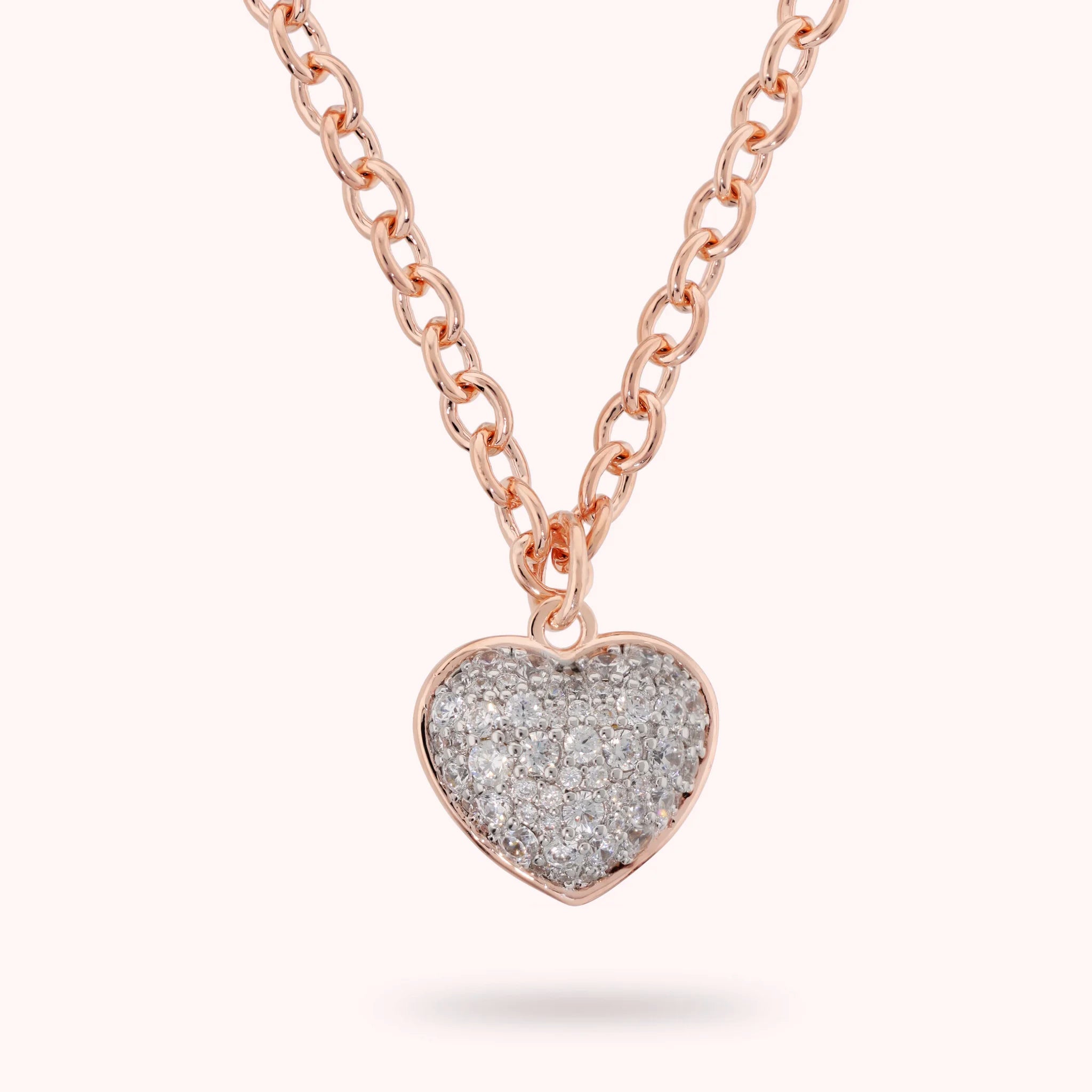 Bronzallure Halskette aus Golden Rosé Legierung, 18kt vergoldet, mit Rolo-Kette und herzförmigem Anhänger mit pavé Cubic Zirkonia in leuchtender Qualität. Karabinerverschluss.
