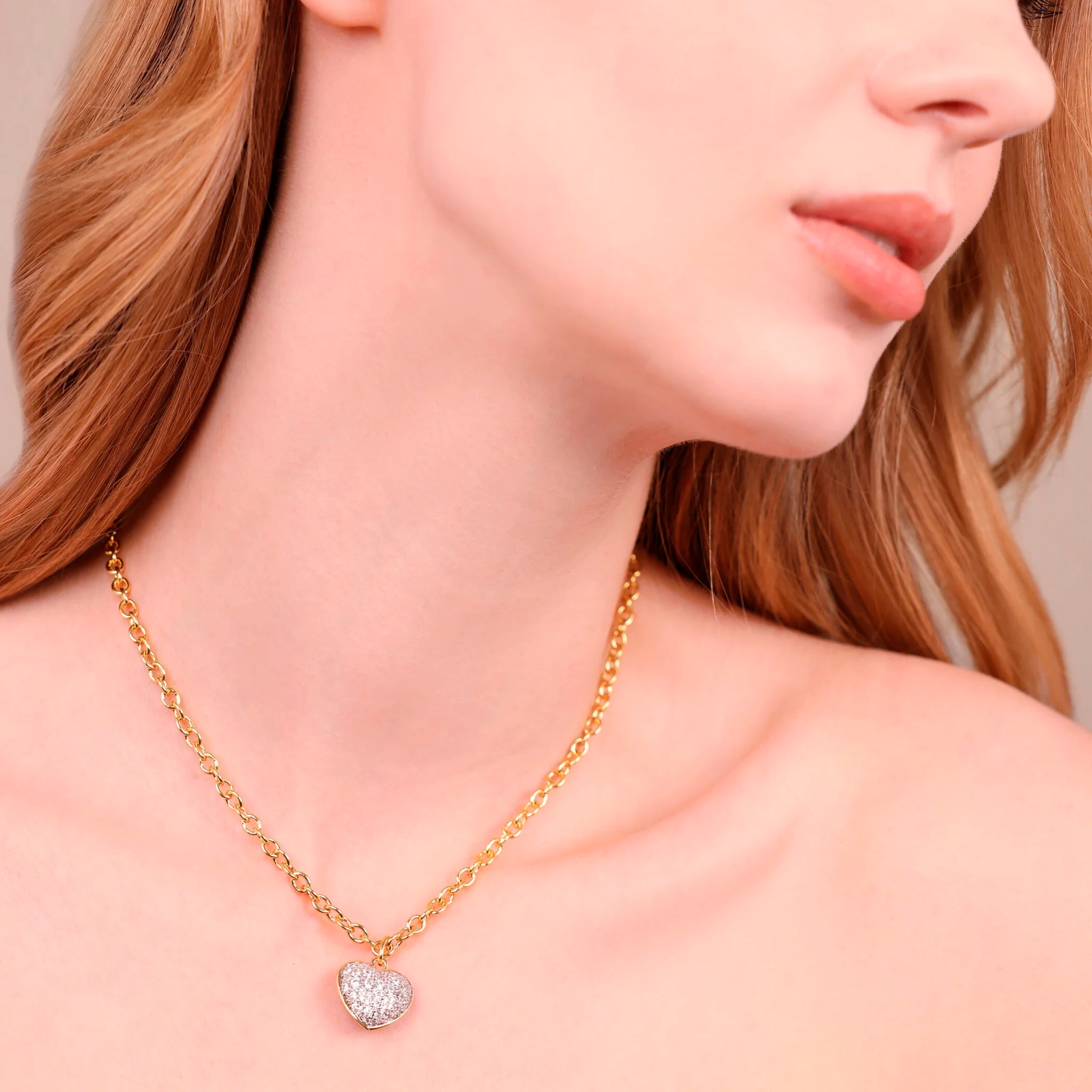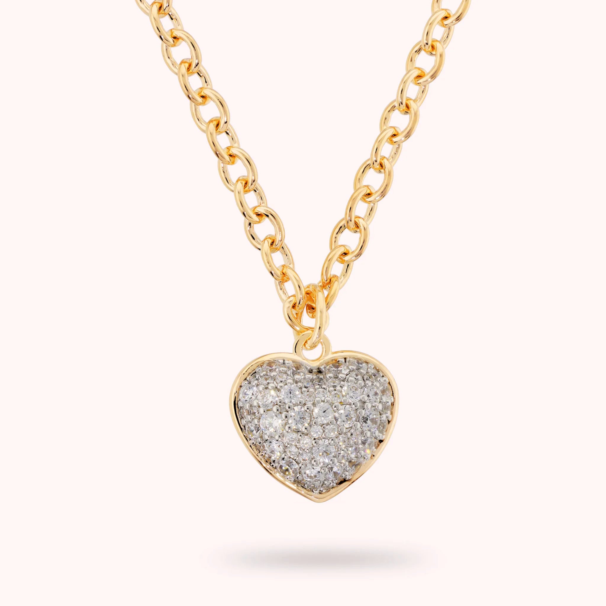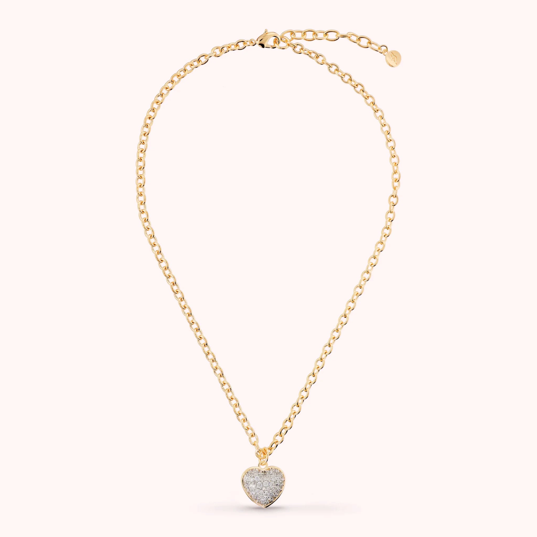Una maglia raffinata che sostiene un cuore luminoso, dove ogni dettaglio in pavé cattura lo sguardo: un simbolo di luce e stile da indossare ogni giorno.