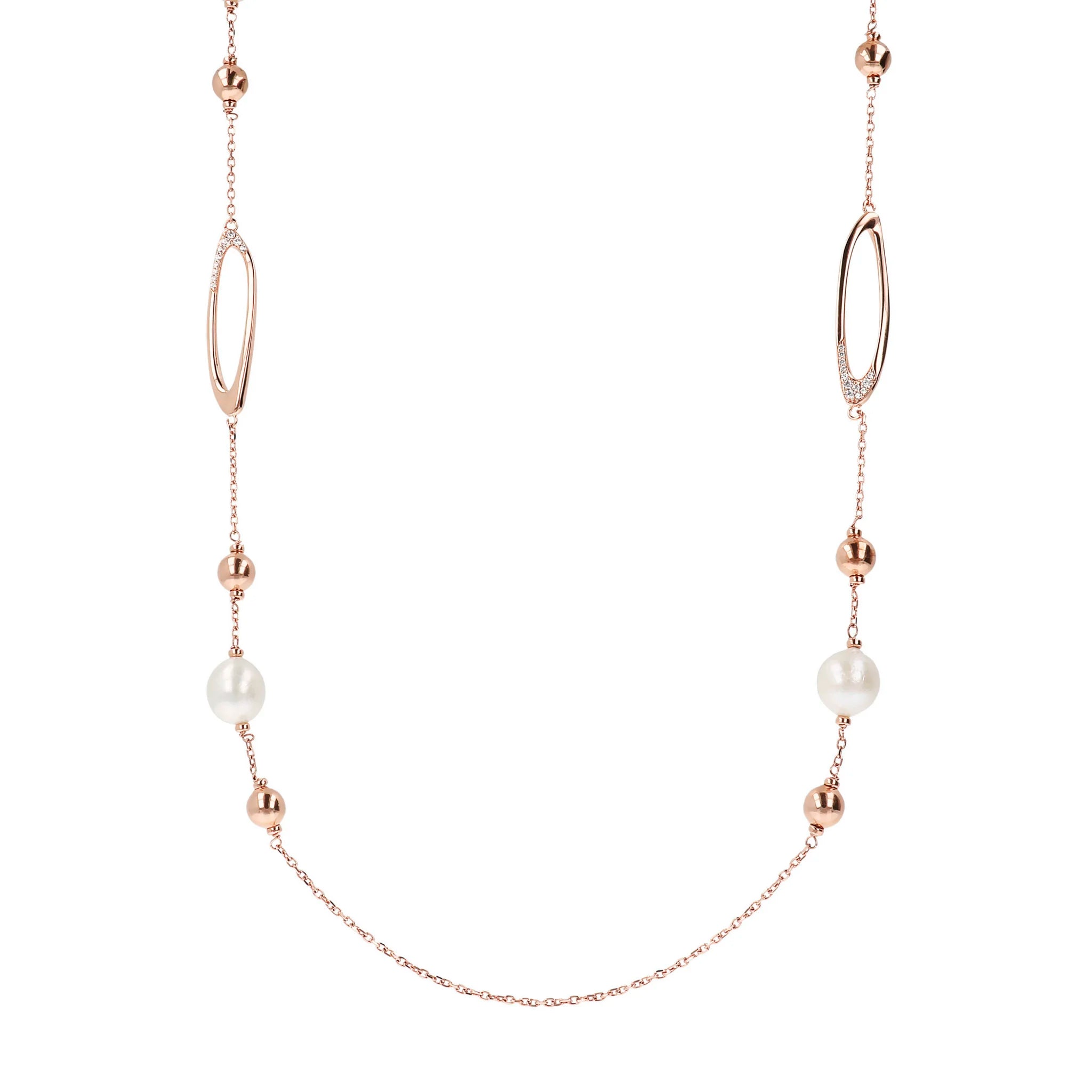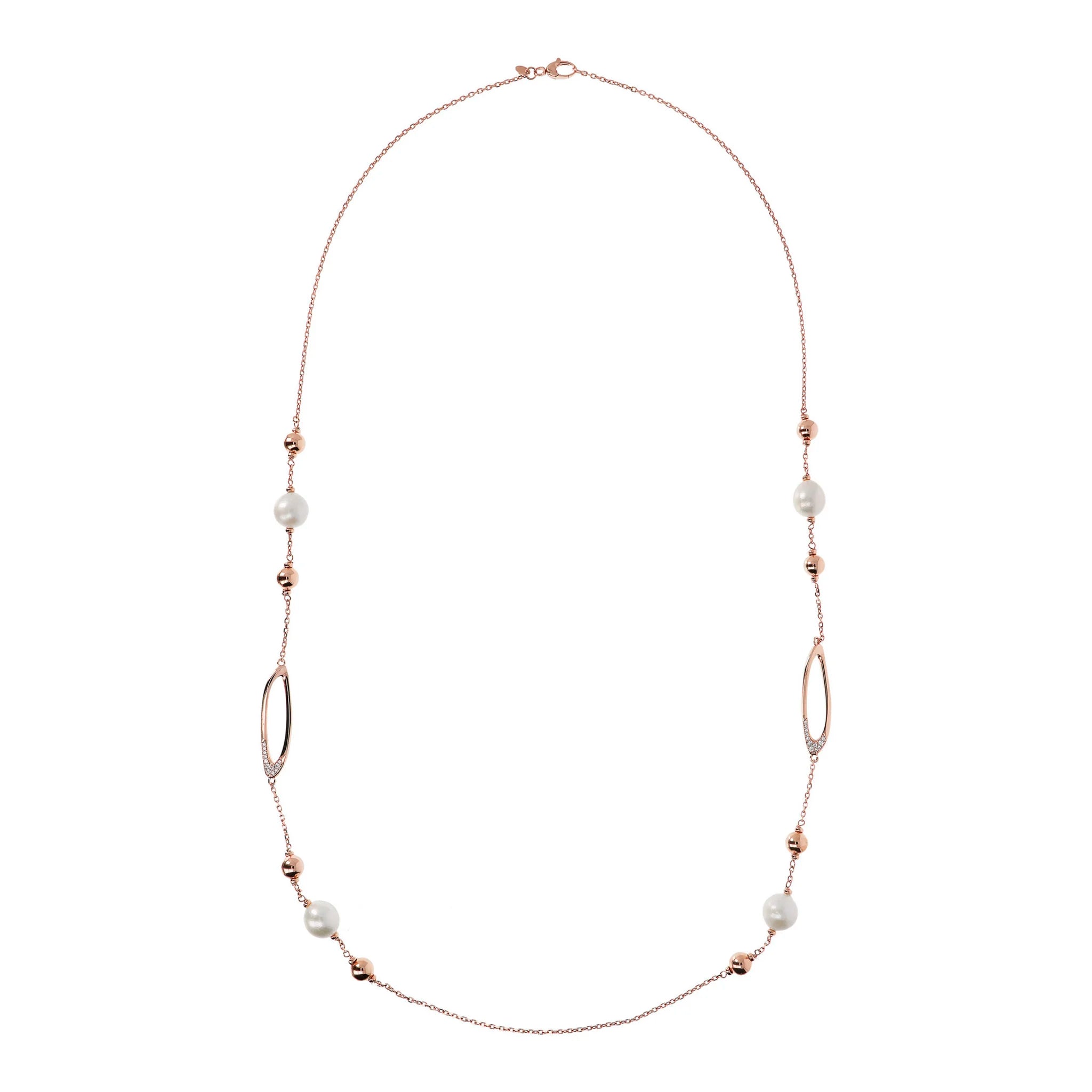 Lange Halskette aus einer Golden-Rosé-Legierung, 18-Karat rosévergoldet, verziert mit ovalen Details mit Zirkonia und kleinen Kugeln aus Golden-Rosé und Süßwasser-Zuchtperlen (ca. 12 mm).