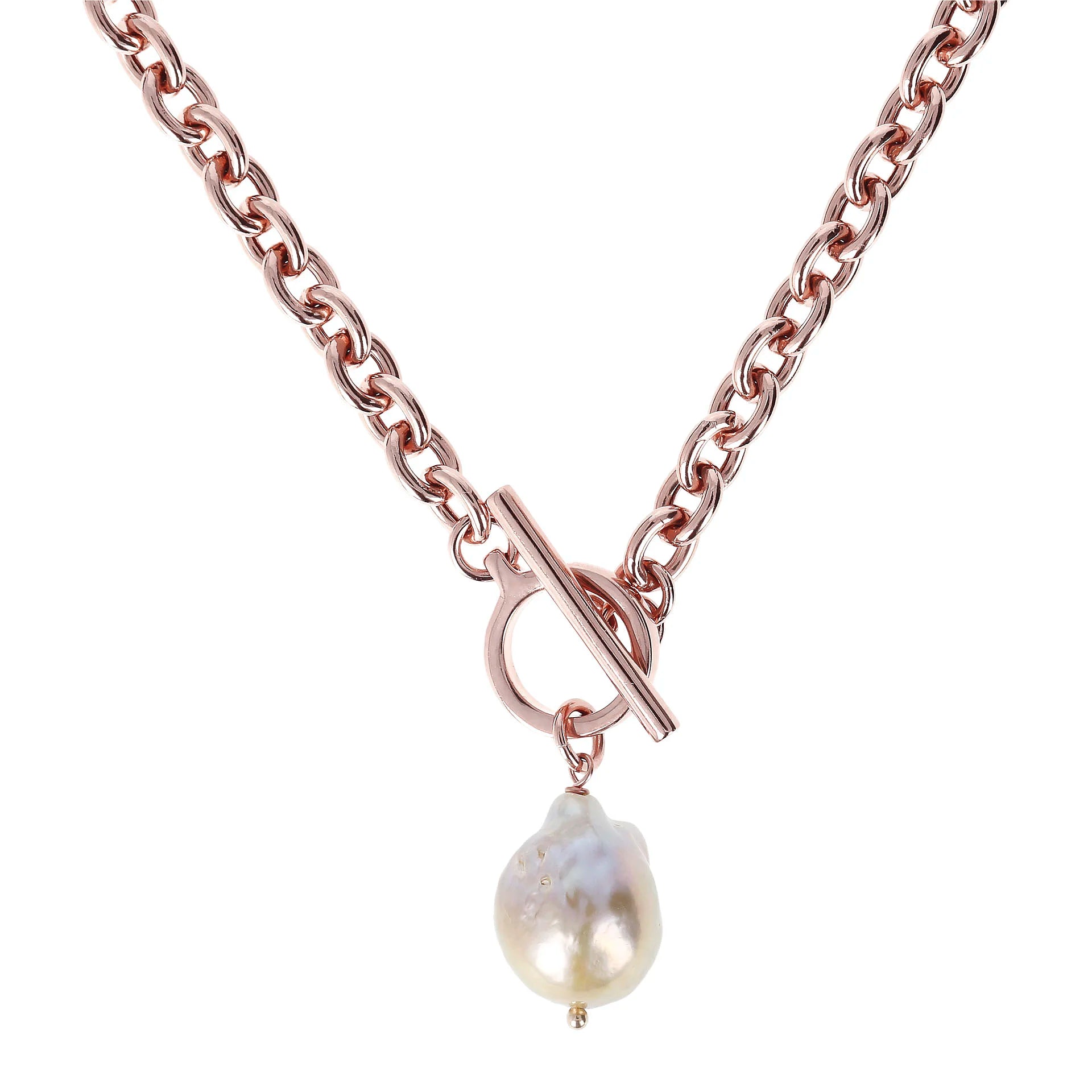Bronzallure Halskette aus Golden Rosé Legierung, 18kt rosévergoldet, mit glänzendem ovalem Rolo-Glied und verziert mit einem Anhänger aus weißer Süßwasser-Zuchtperle (15x11mm) Verschluss mit T-Bar.