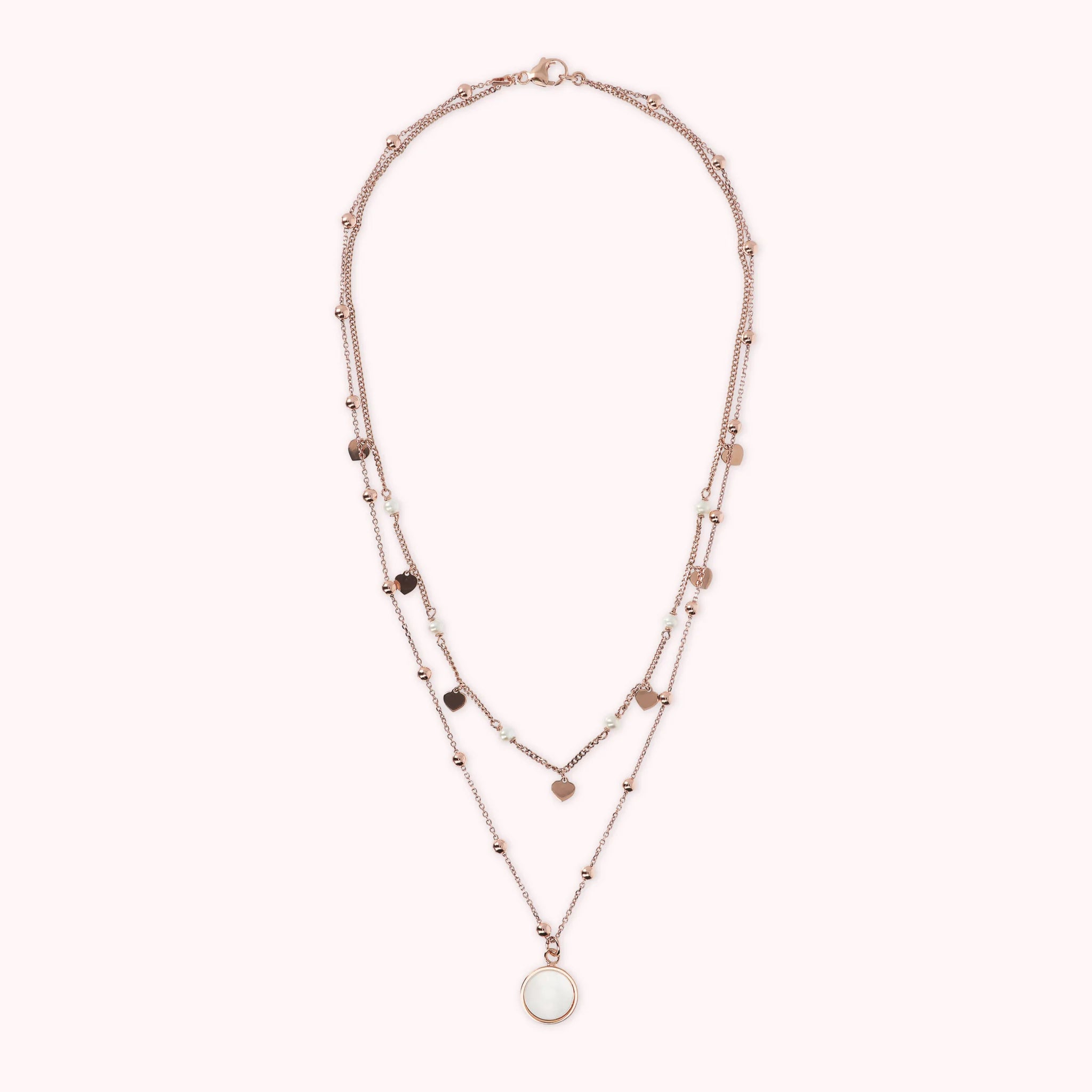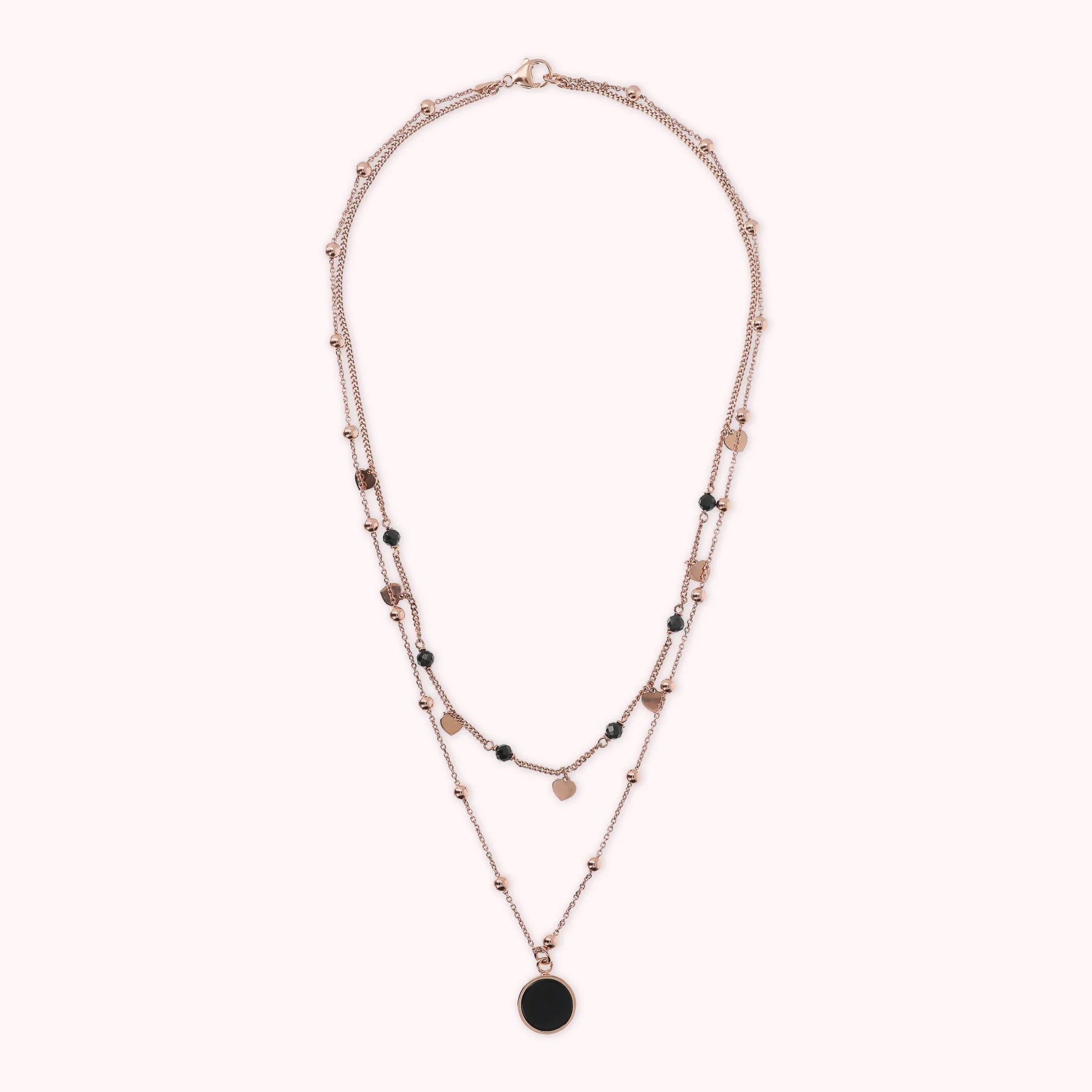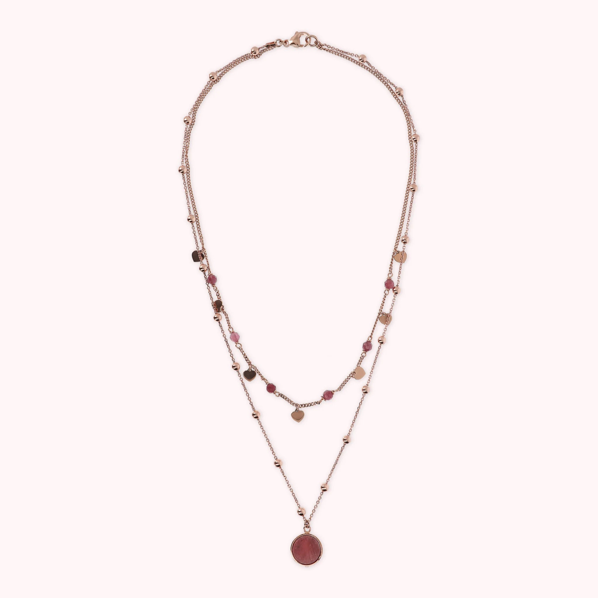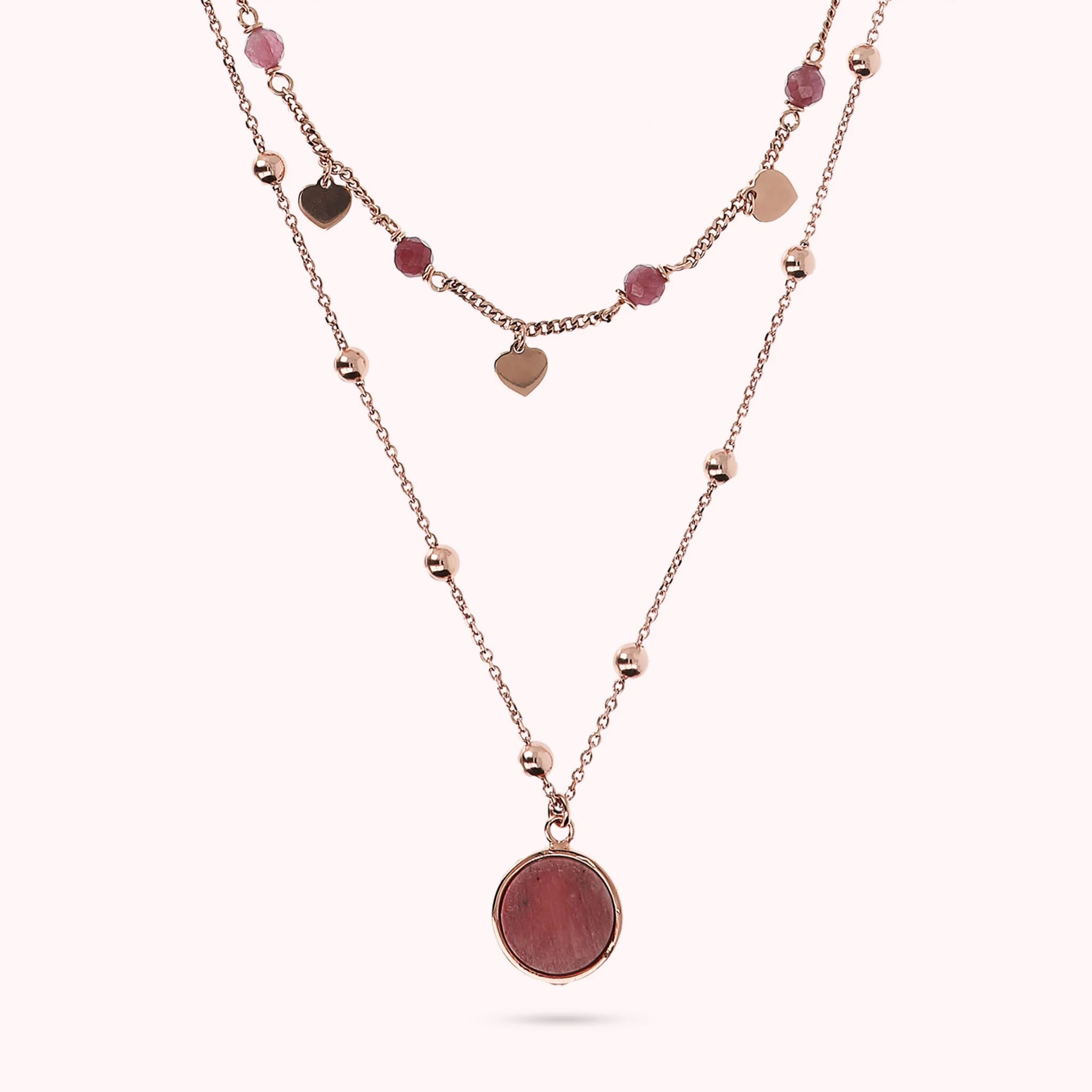 Zweireihige Bronzallure-Halskette aus einer Golden-Rosé-Legierung, 18-Karat rosévergoldet. Die erste Rosenkranzkette besteht aus kleinen Herzen in Golden Rosé, die sich mit kleinen Natursteinen abwechseln. Die zweite Rosenkranzkette besteht aus kleinen Kugeln in Golden Rosé mit einem runden Anhänger aus Naturstein.