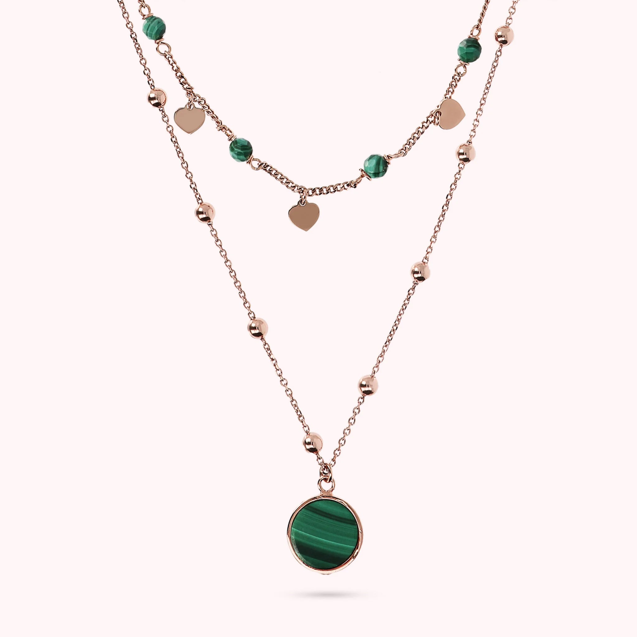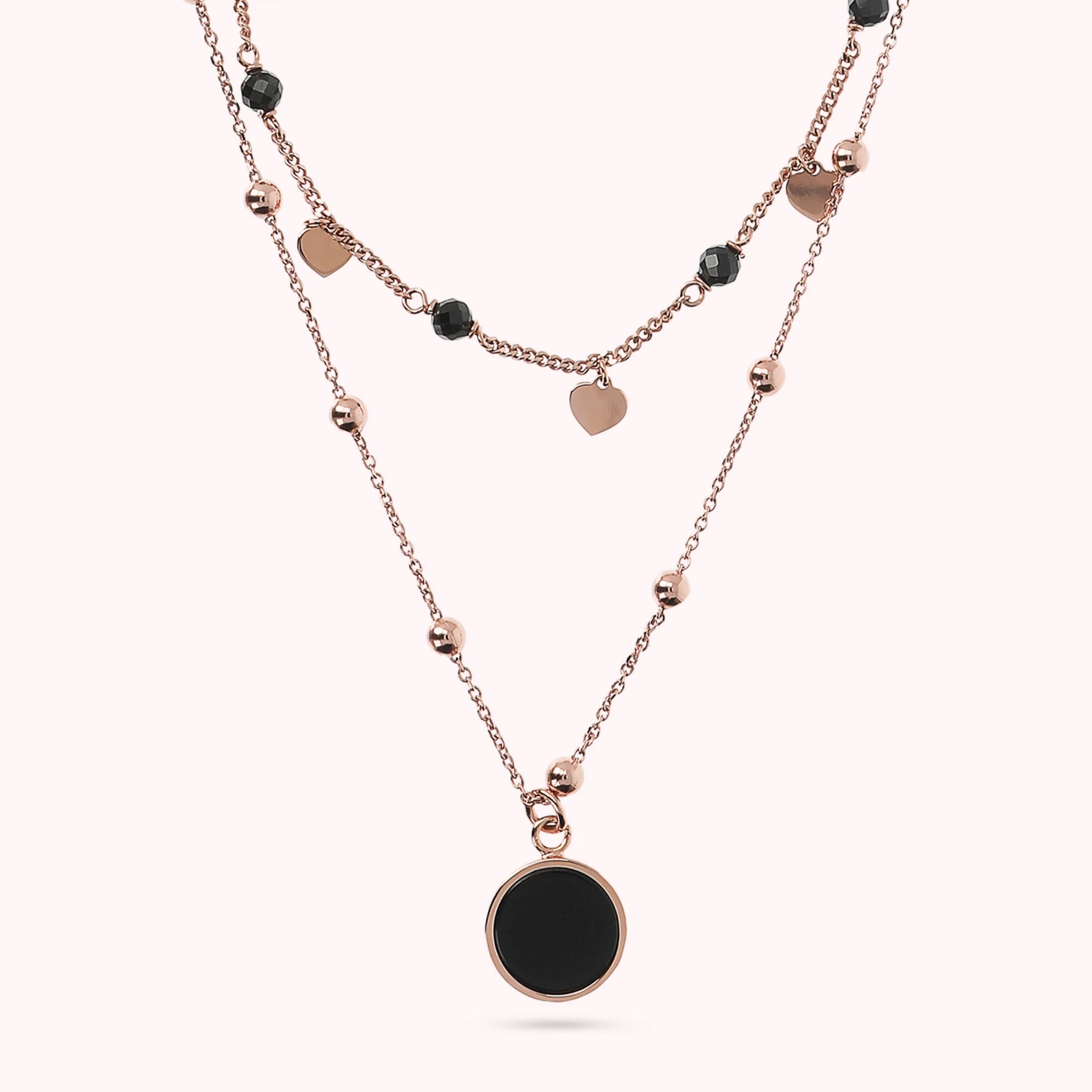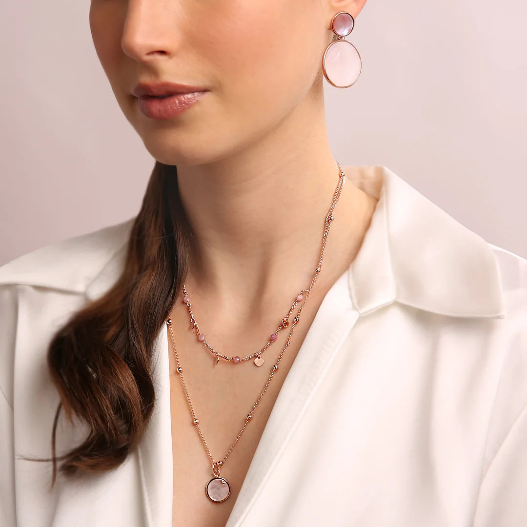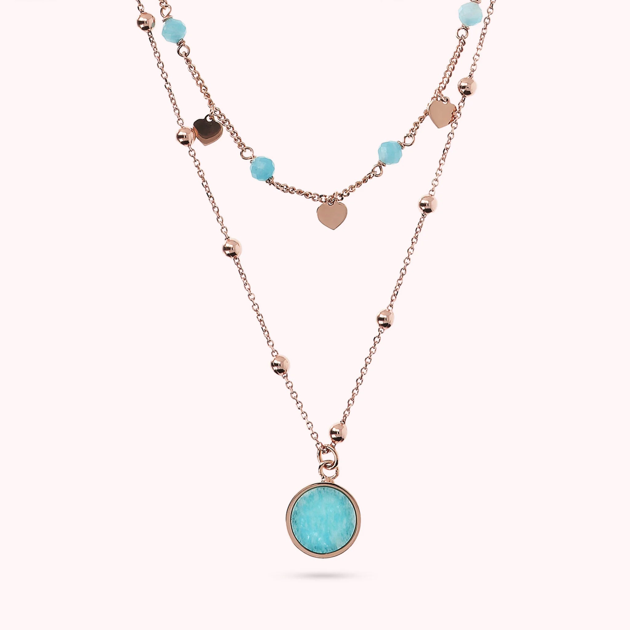 Zweireihige Bronzallure-Halskette aus einer Golden-Rosé-Legierung, 18-Karat rosévergoldet. Die erste Rosenkranzkette besteht aus kleinen Herzen in Golden Rosé, die sich mit kleinen Natursteinen abwechseln. Die zweite Rosenkranzkette besteht aus kleinen Kugeln in Golden Rosé mit einem runden Anhänger aus Naturstein.