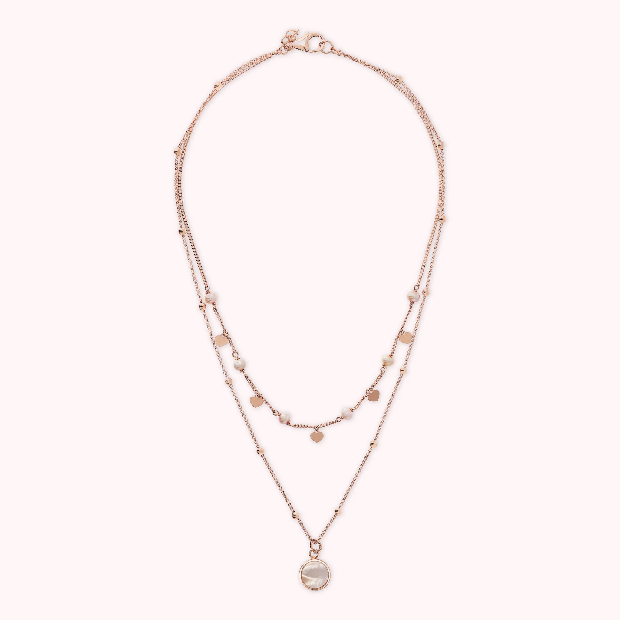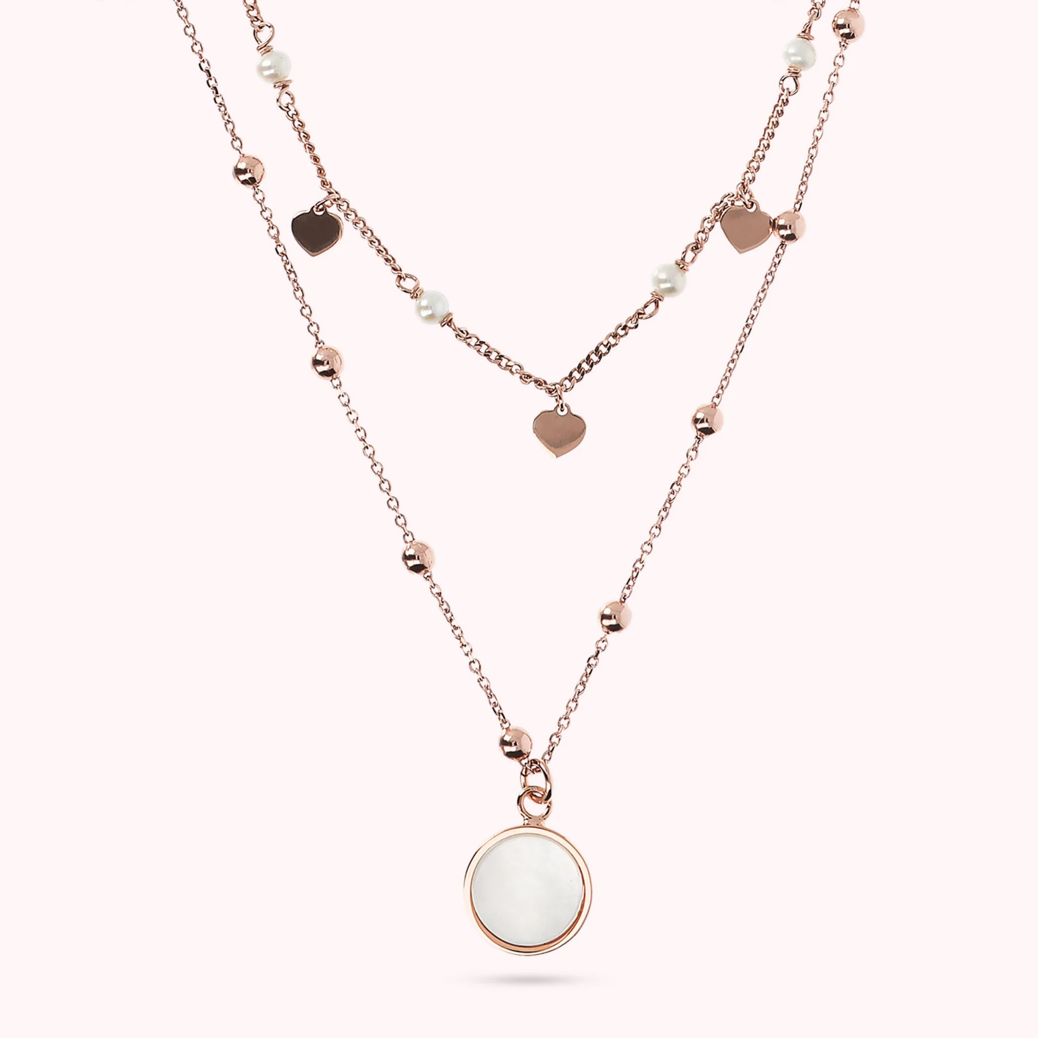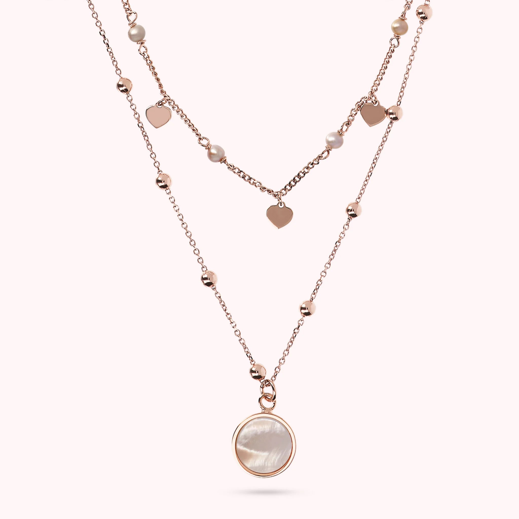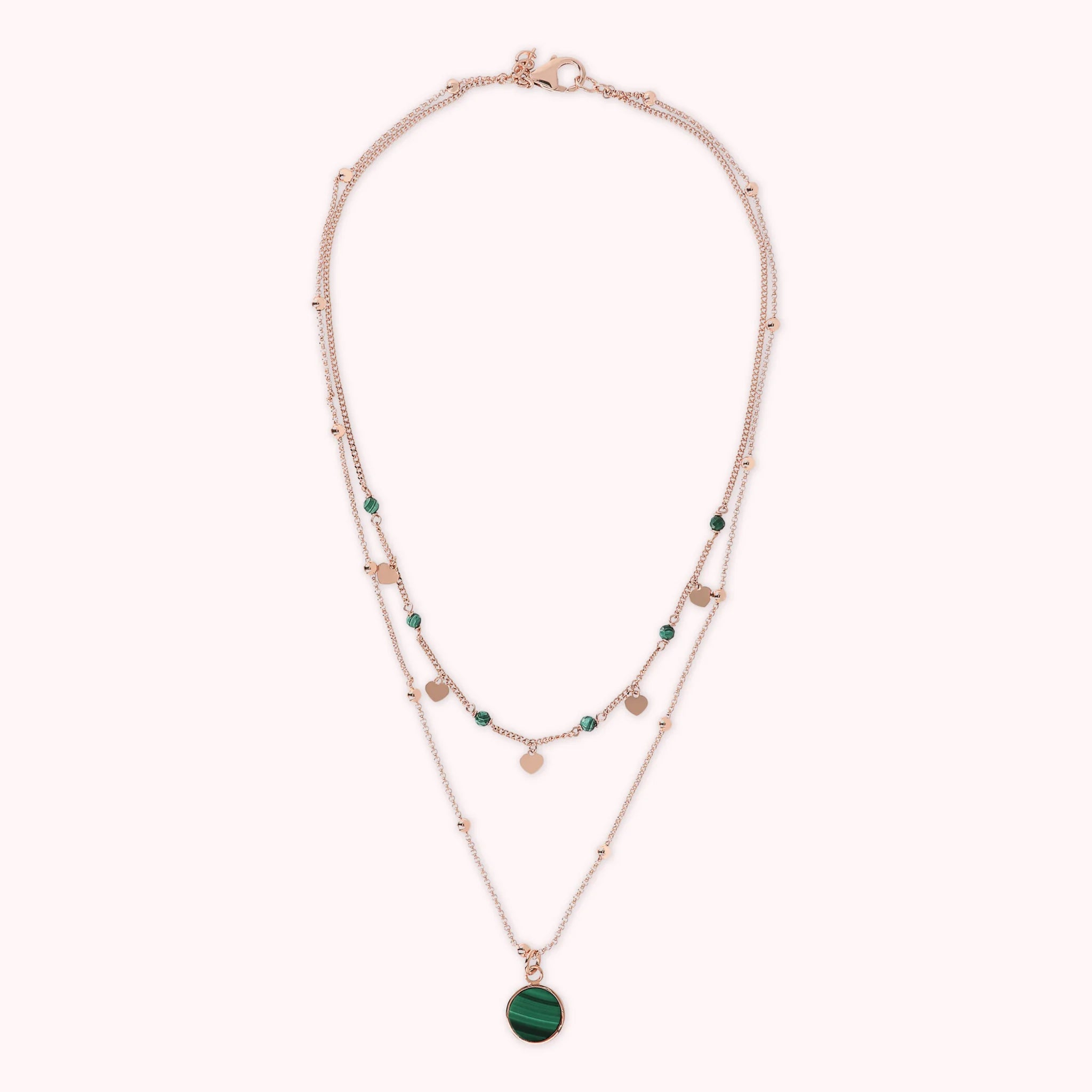 Zweireihige Bronzallure-Halskette aus einer Golden-Rosé-Legierung, 18-Karat rosévergoldet. Die erste Rosenkranzkette besteht aus kleinen Herzen in Golden Rosé, die sich mit kleinen Natursteinen abwechseln. Die zweite Rosenkranzkette besteht aus kleinen Kugeln in Golden Rosé mit einem runden Anhänger aus Naturstein.