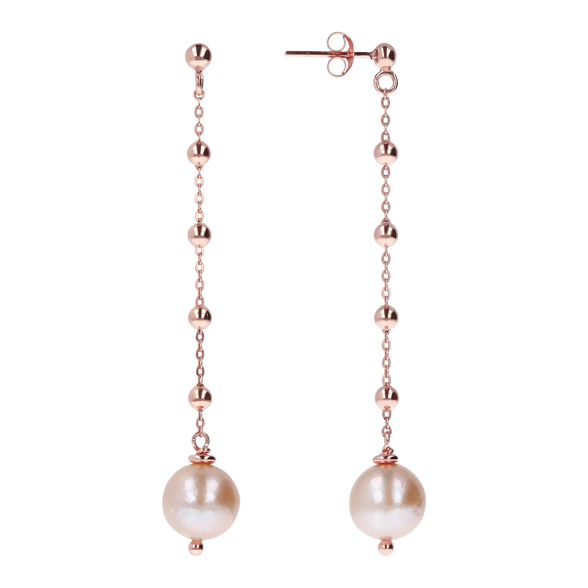 Bronzallure-Ohrringe aus einer Golden-Rosé-Legierung, mit 18-Karat Roségold plattiert, verziert mit einer Reihe kleiner Golden Rosé-Kugeln und einem Anhänger aus rosa Süßwasser-Ming-Zuchtperle (ca. 10 mm). Länge 5,7 cm lang.