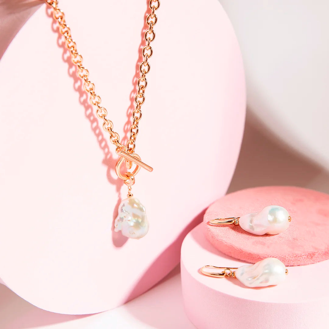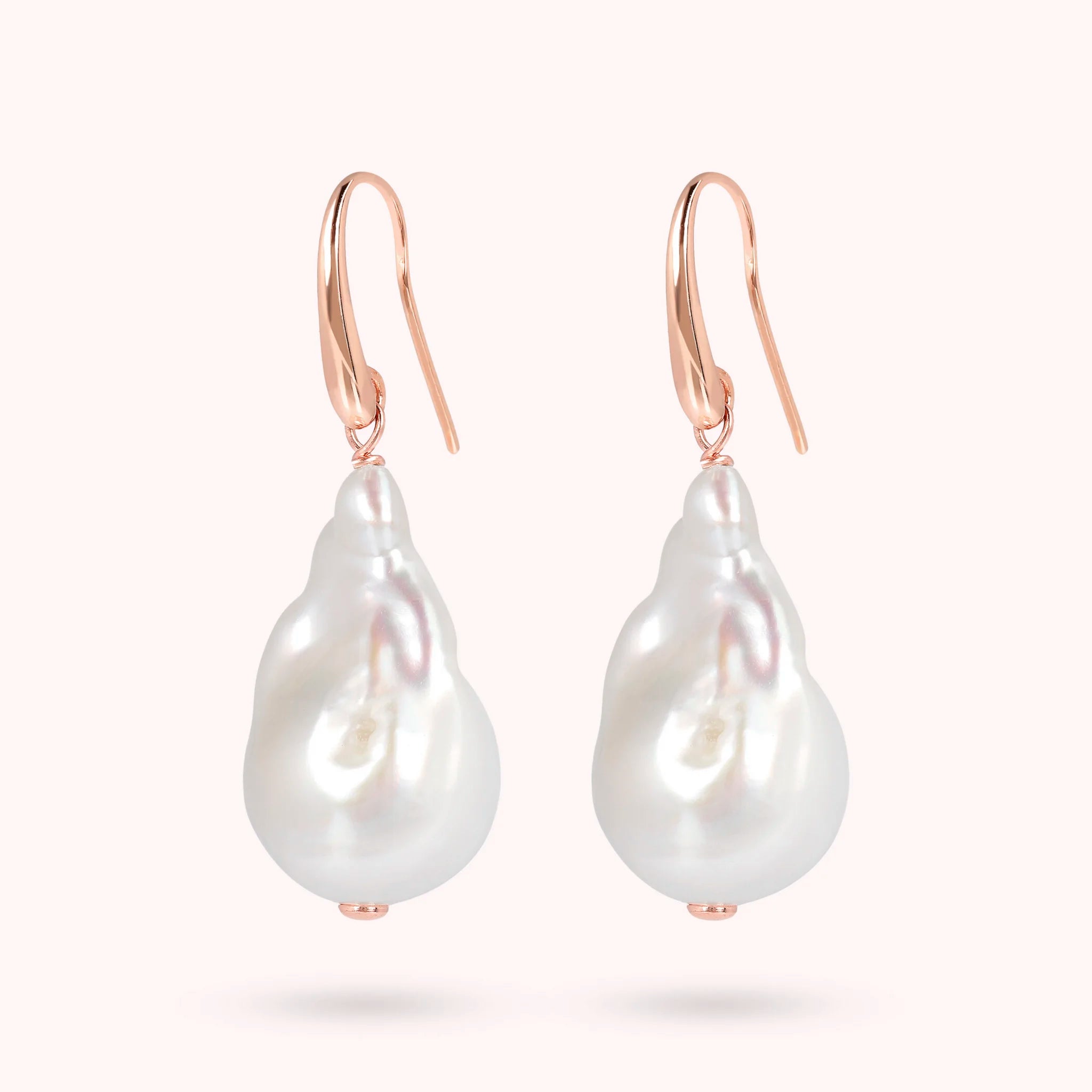 Bronzallure-Ohrringe aus einer Golden-Rosé-Legierung, 18-Karat rosévergoldet, verziert mit weißen Süßwasser-Barock-Zuchtperle (ca. 13 mm) in unregelmäßiger Tropfenform. Der Ohrring hat einen Hakenverschluss, Länge 3,2 cm.