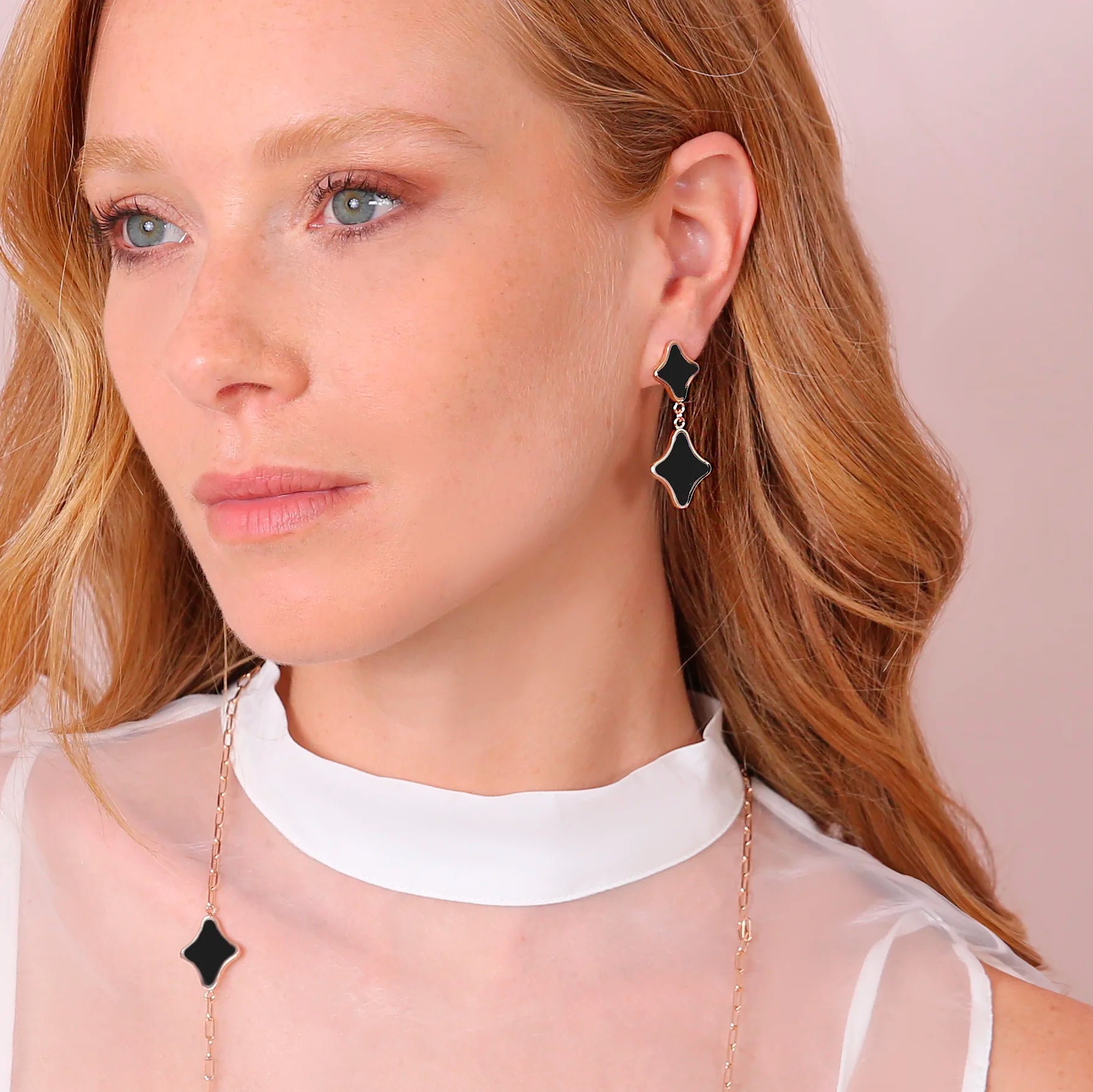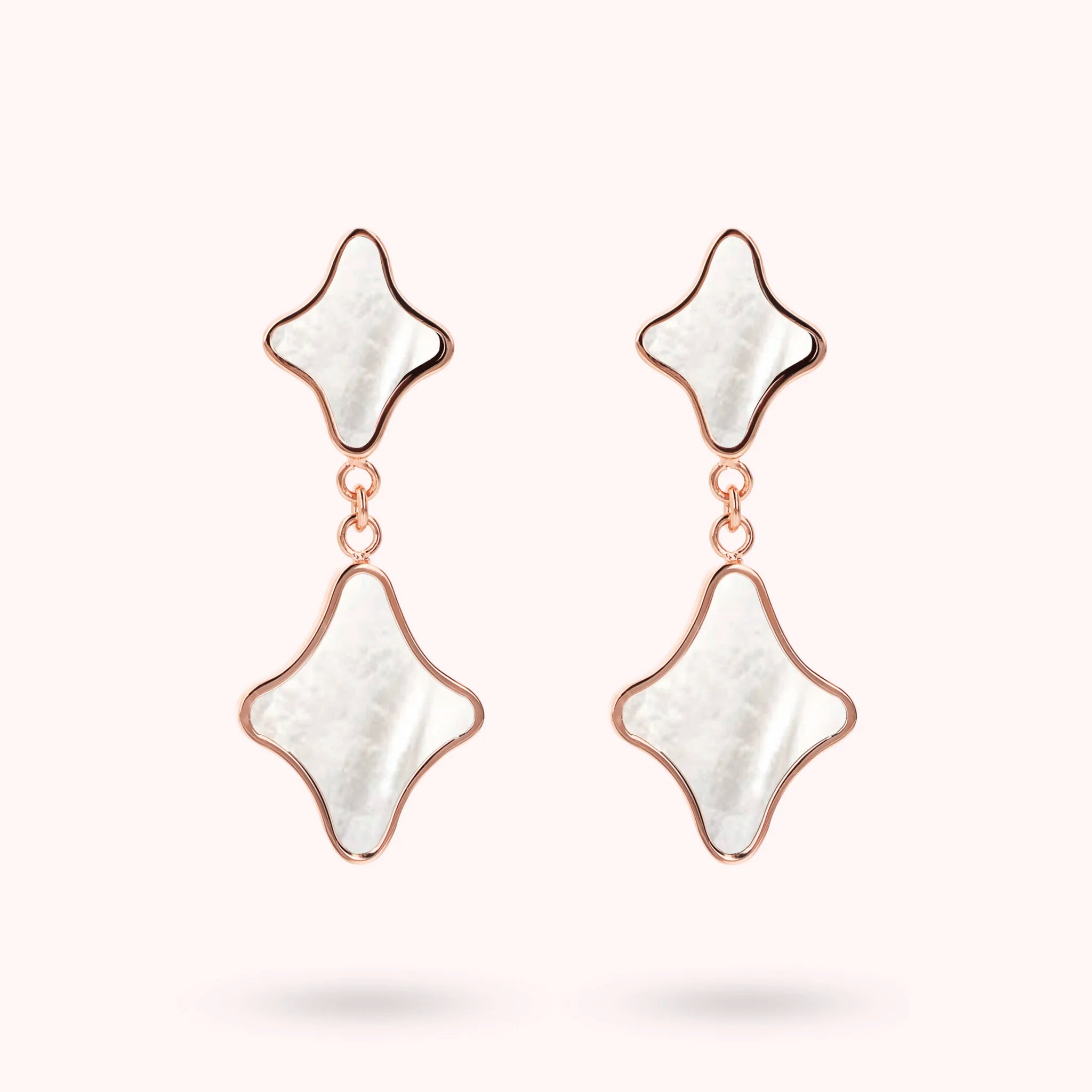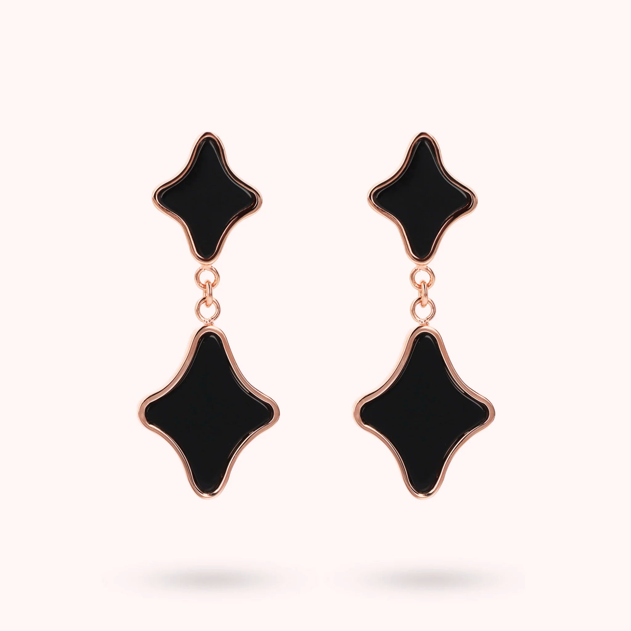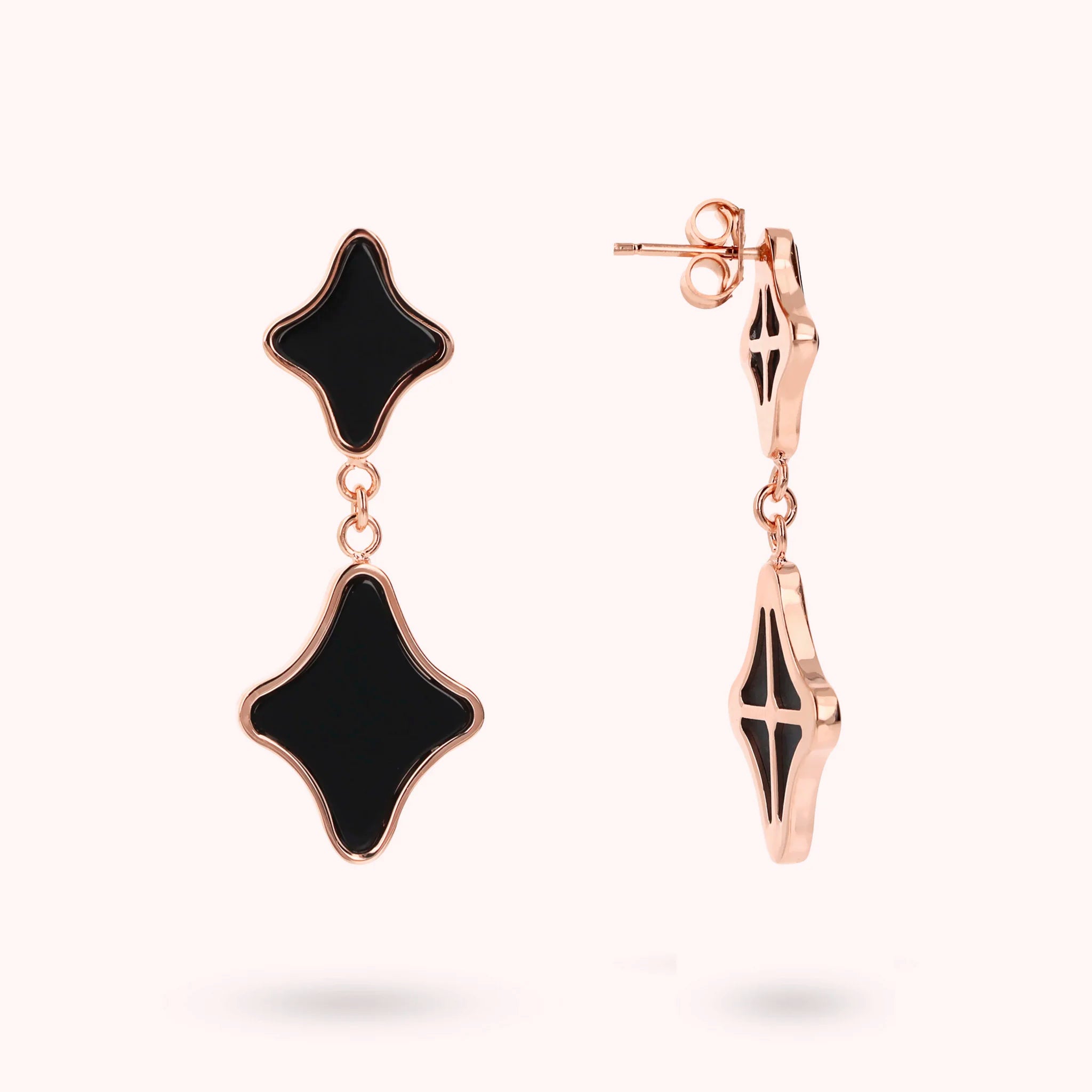 Bronzallure-Ohrringe aus einer Golden Rosé-Legierung, 18 Karat rosévergoldet, verziert mit zwei étoile-Elementen, einem kleinen (14,5 x 11,5 mm) und einem großen (19,5 x 15,5 mm) aus schwarzem Onyx-Naturstein oder weißem Perlmutt.