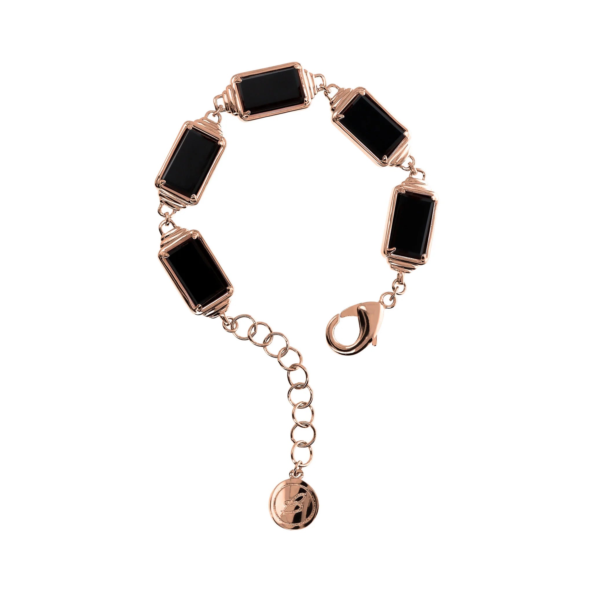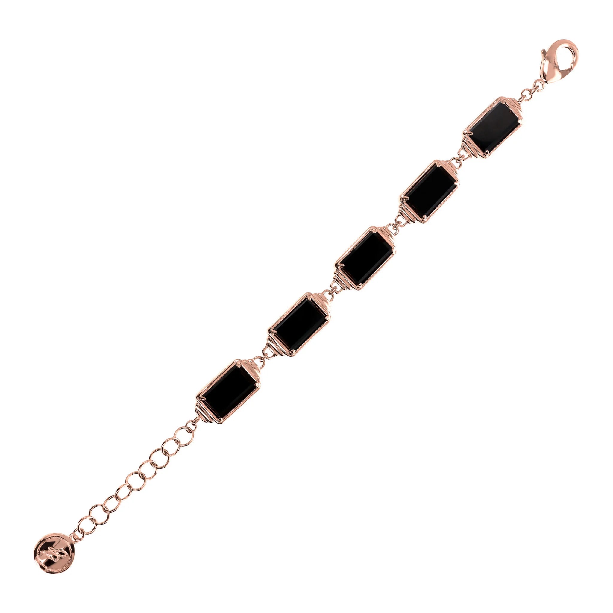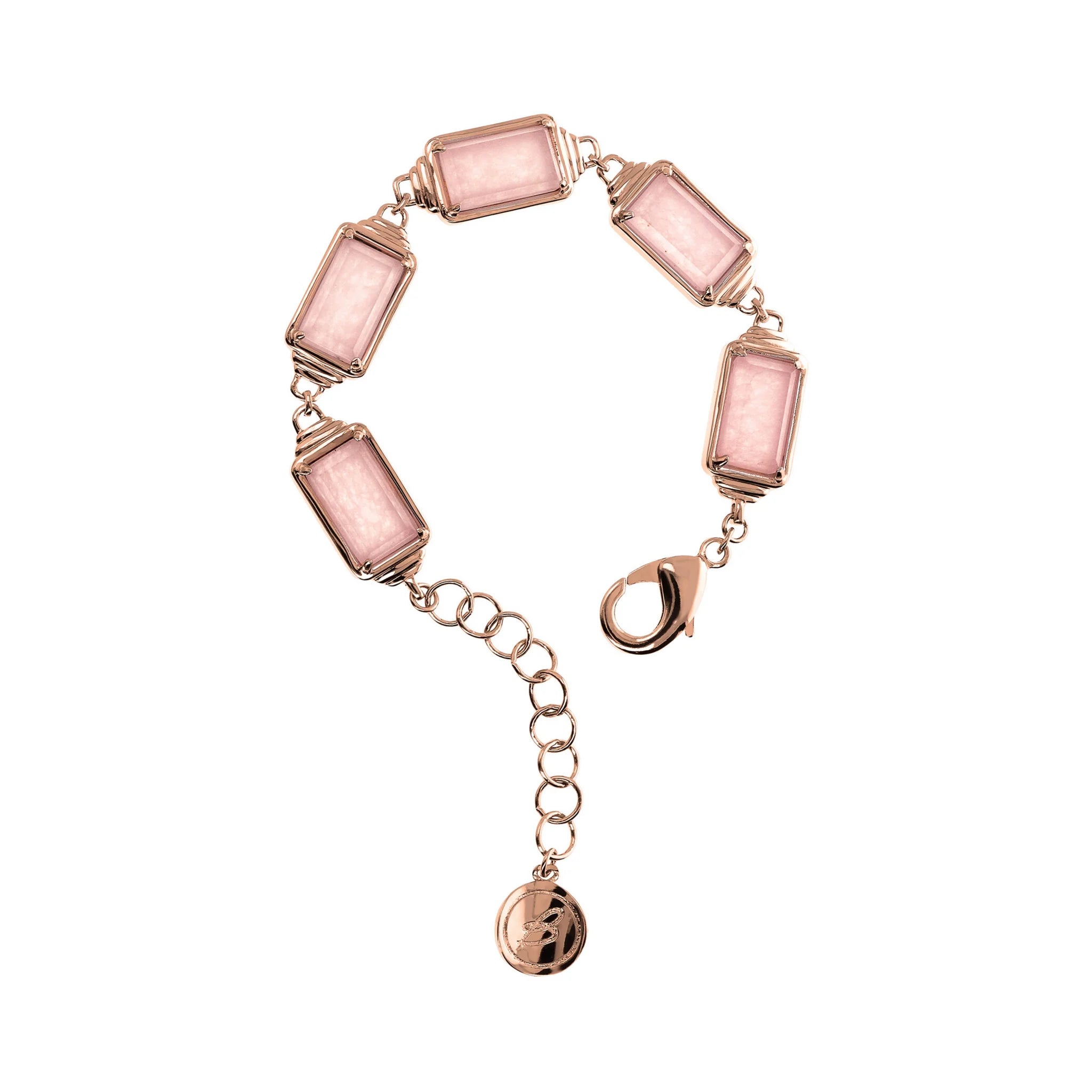 Bronzallure bracelet made of Golden Rosé alloy, 18kt rose gold plated, embellished with elaborate bezels on which rectangular natural stones (14.5x8.5 mm) with an emerald cut are positioned; lobster clasp with extender.