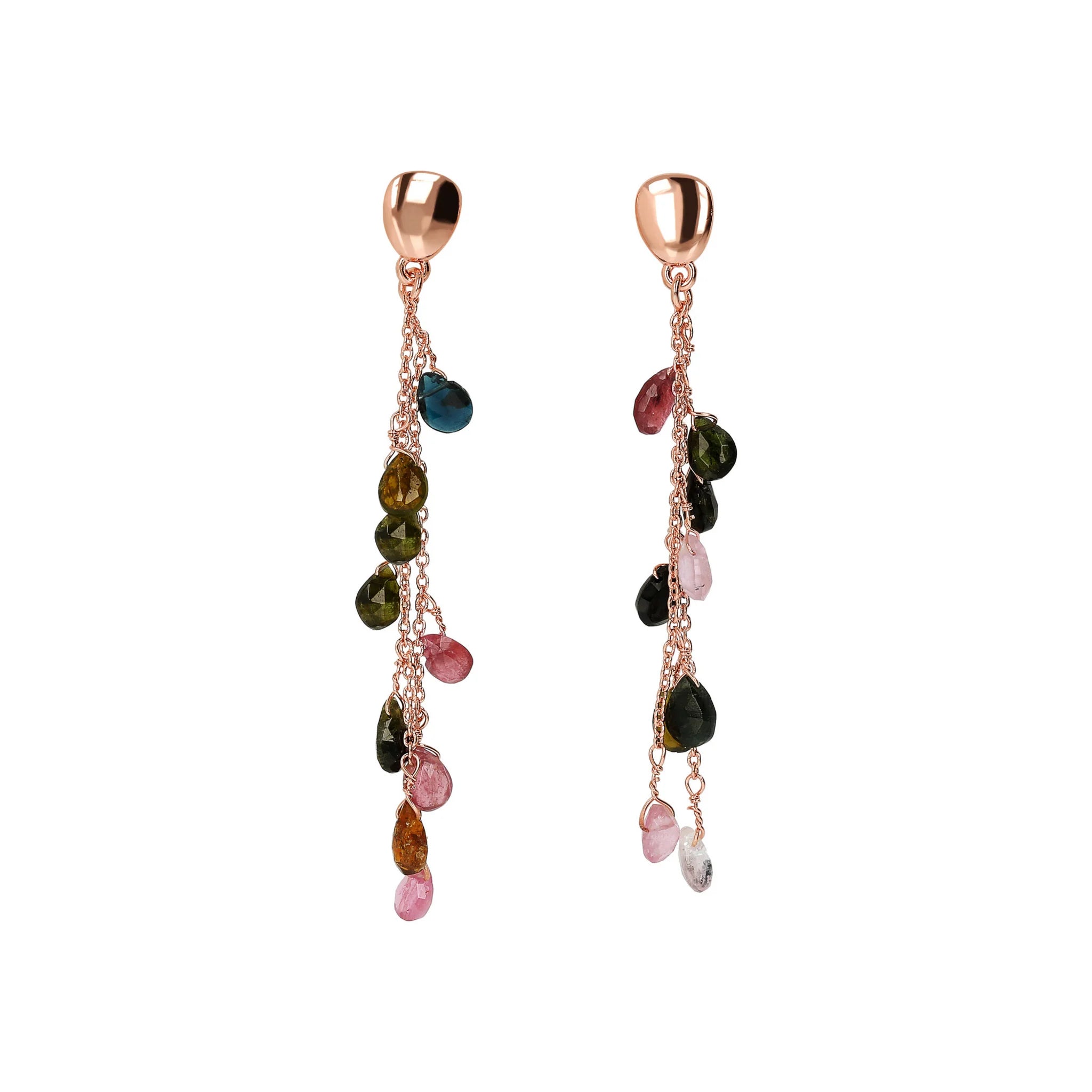 Bronzallure dangle earrings made on a Golden Rosé base, 18kt Rose Gold plated, with rolo chain strands embellished with small natural tourmaline stone drops in pastel colors; butterfly stud clasp.