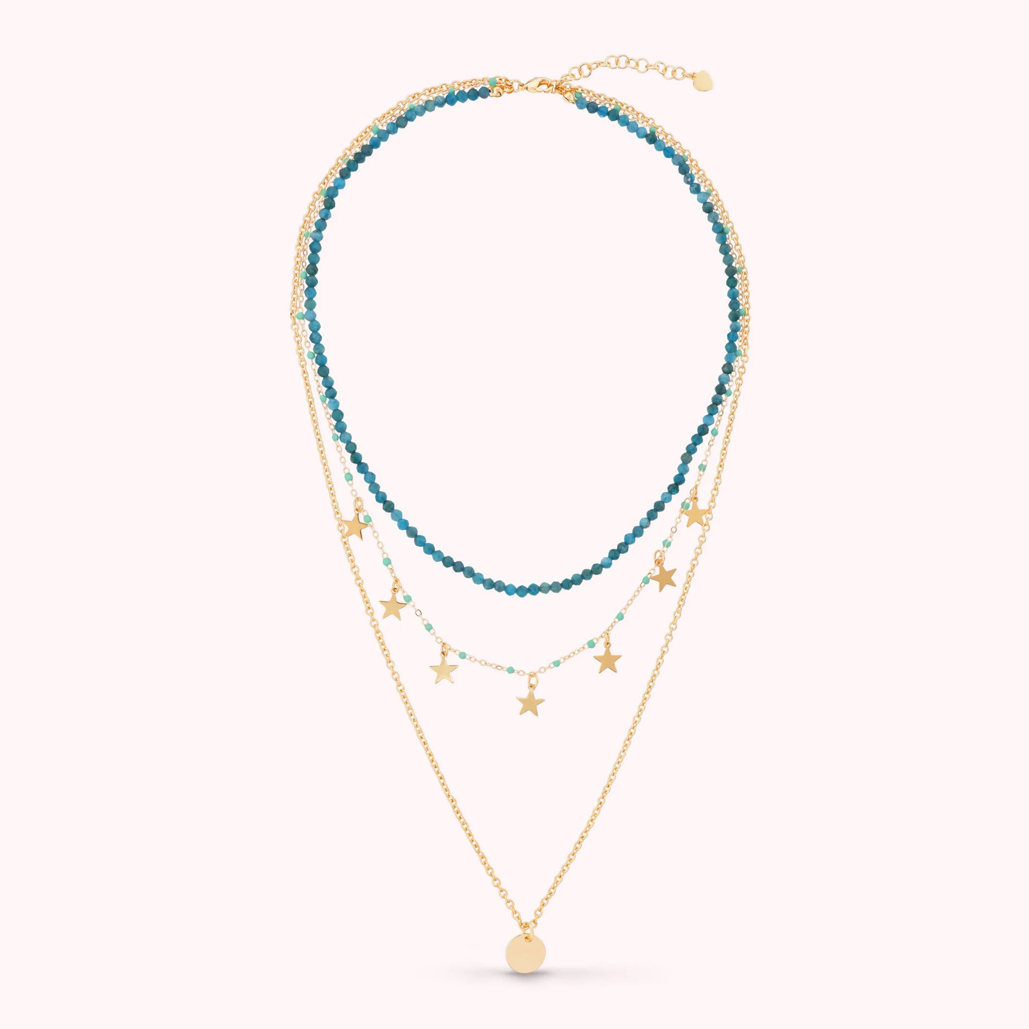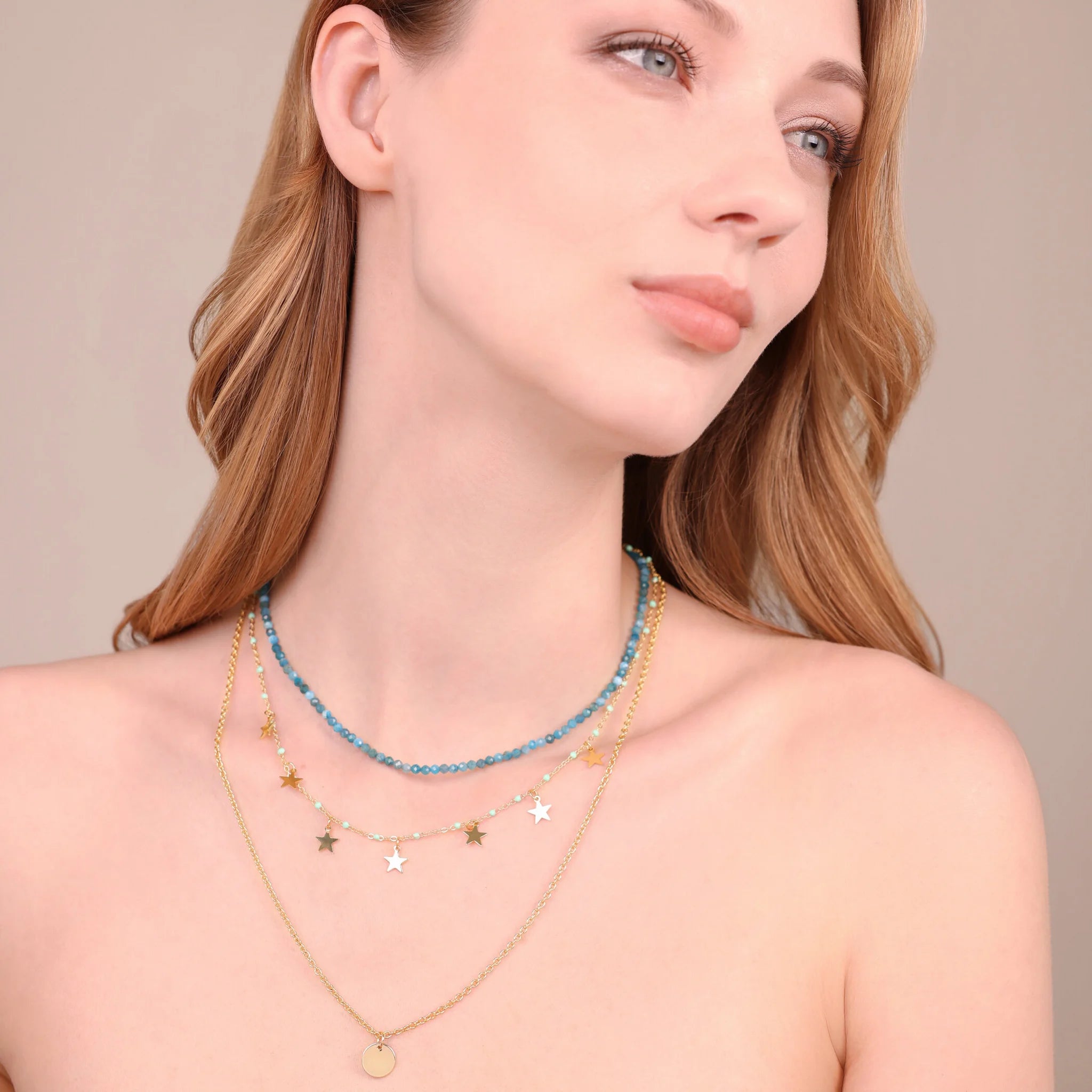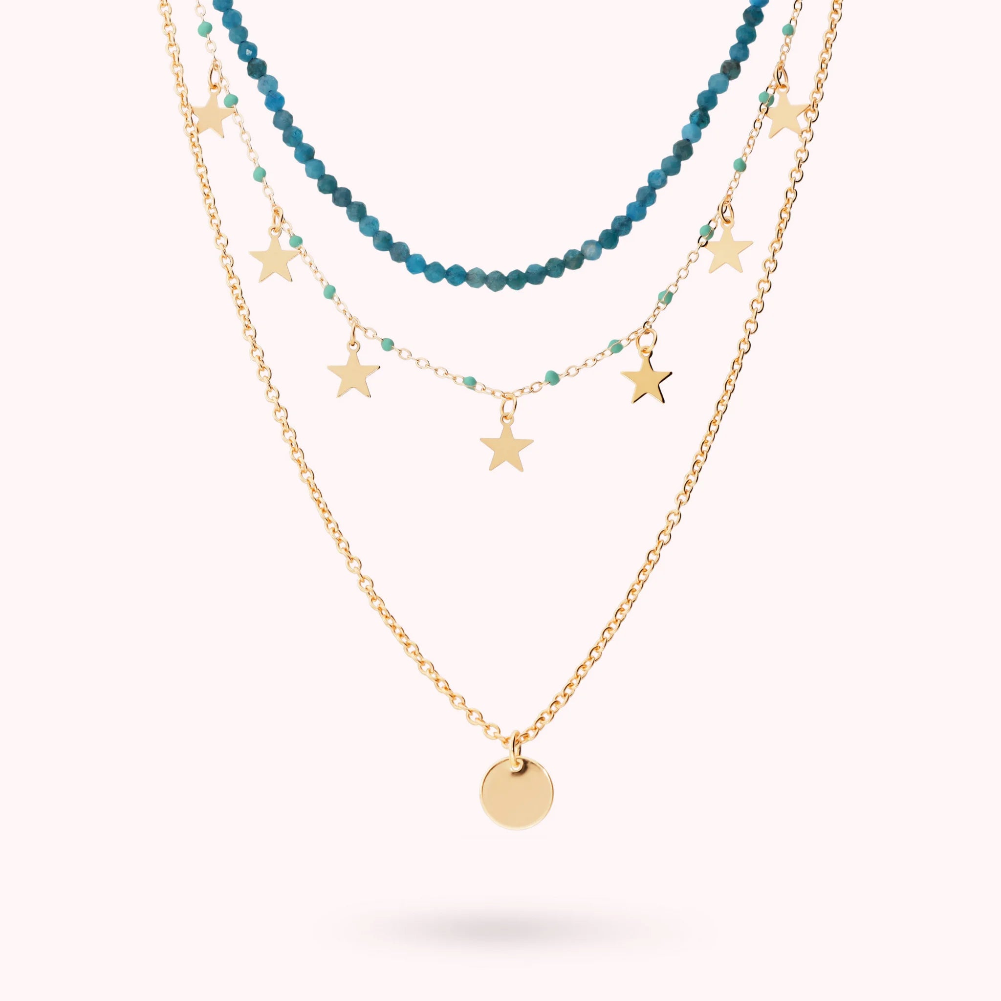 Tre fili, tre modi di brillare: pietre naturali che accarezzano il collo, una catena punteggiata di stelle e piccoli tocchi di colore, e un bottone lucido che scivola leggero sul décolleté.