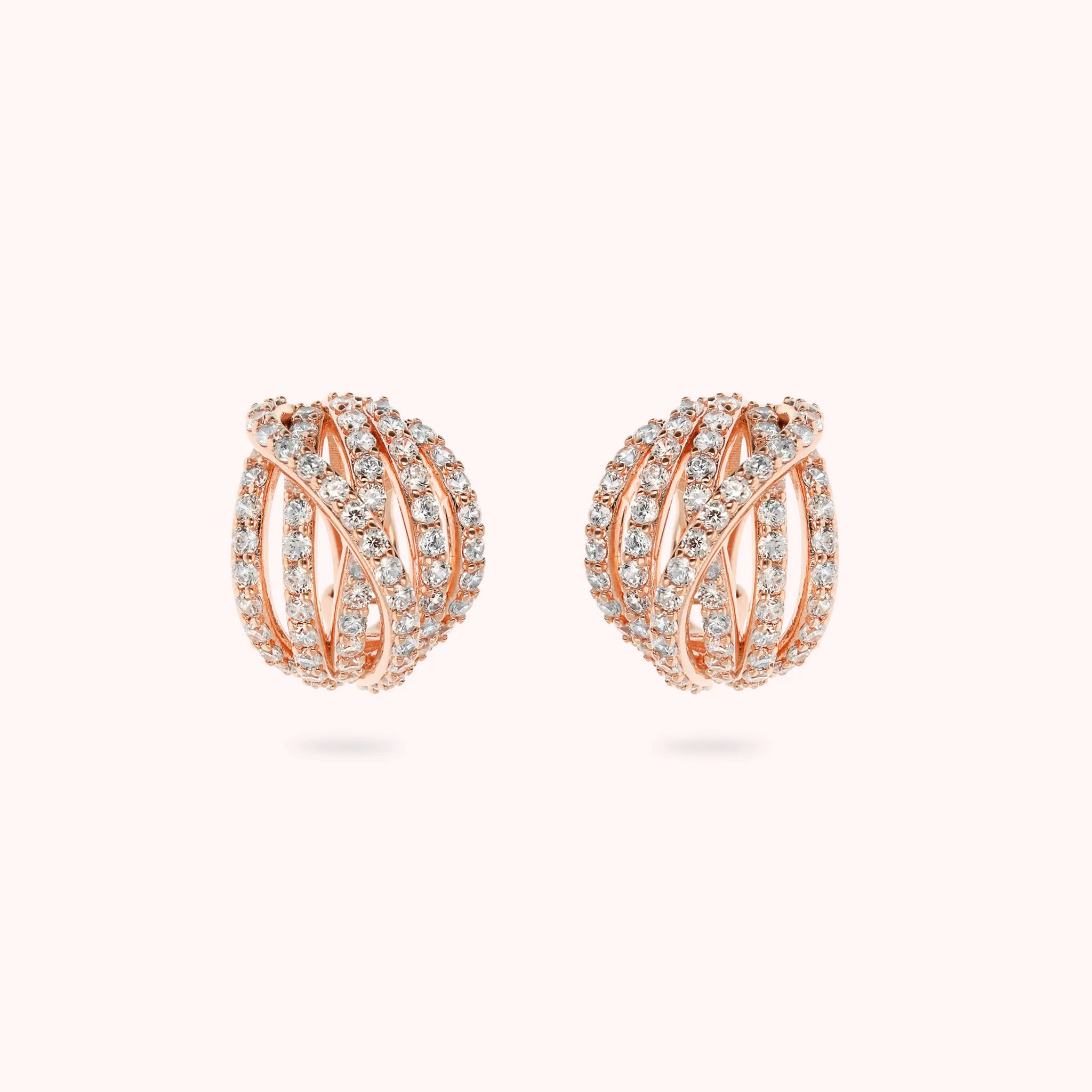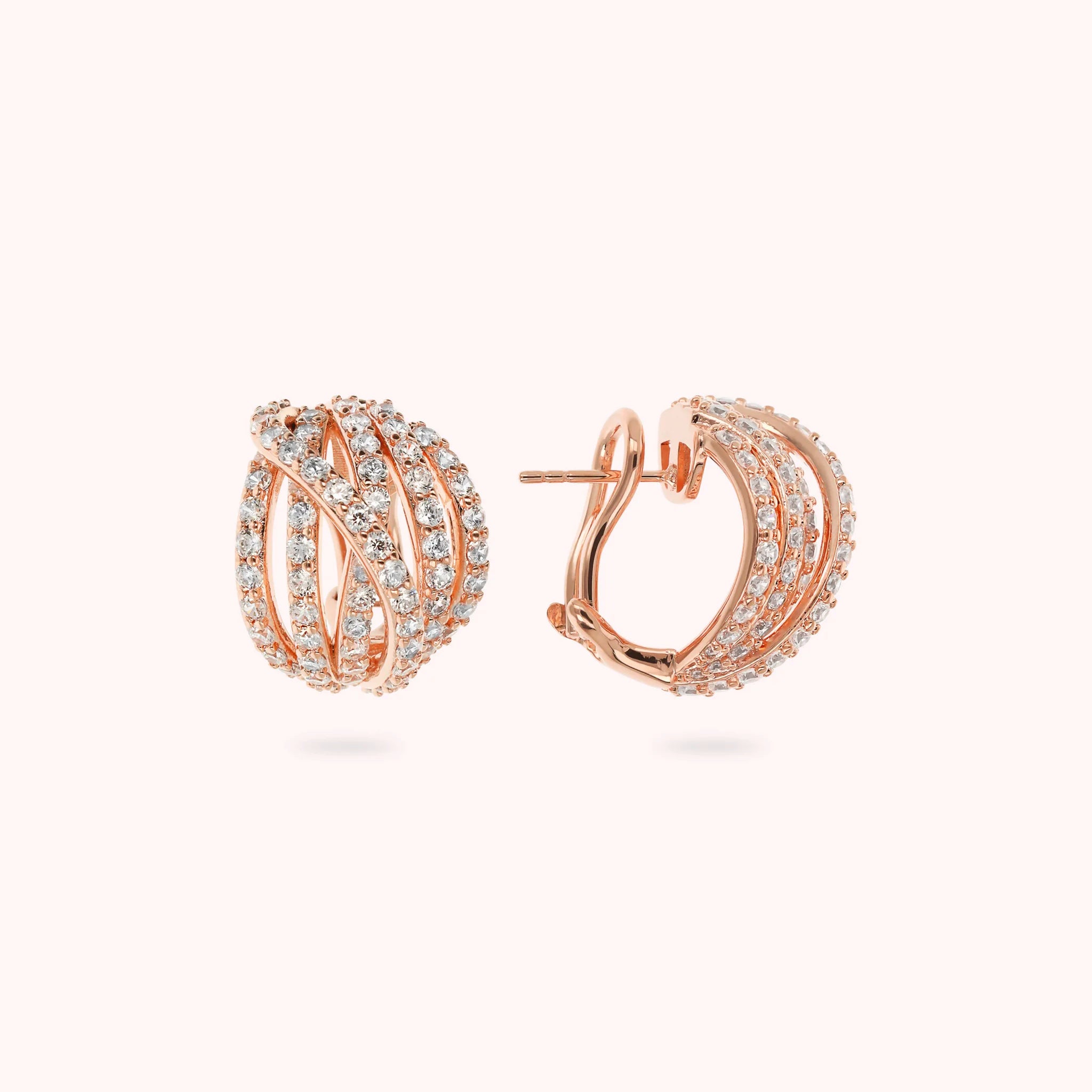 Bronzallure stud earrings made of Golden Rosé alloy, plated with 18kt rose gold, featuring a spherical design with a multi-strand crossed surface in pavé cubic zirconia, luminous quality. Closure with pin and clip.