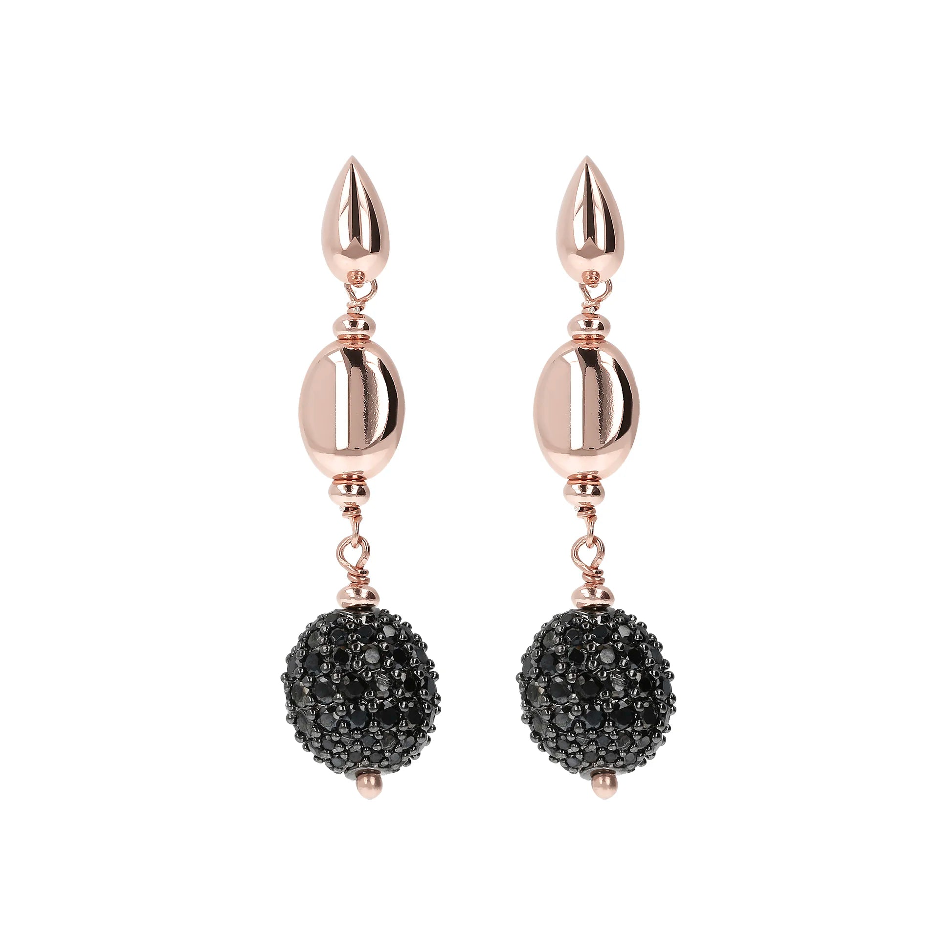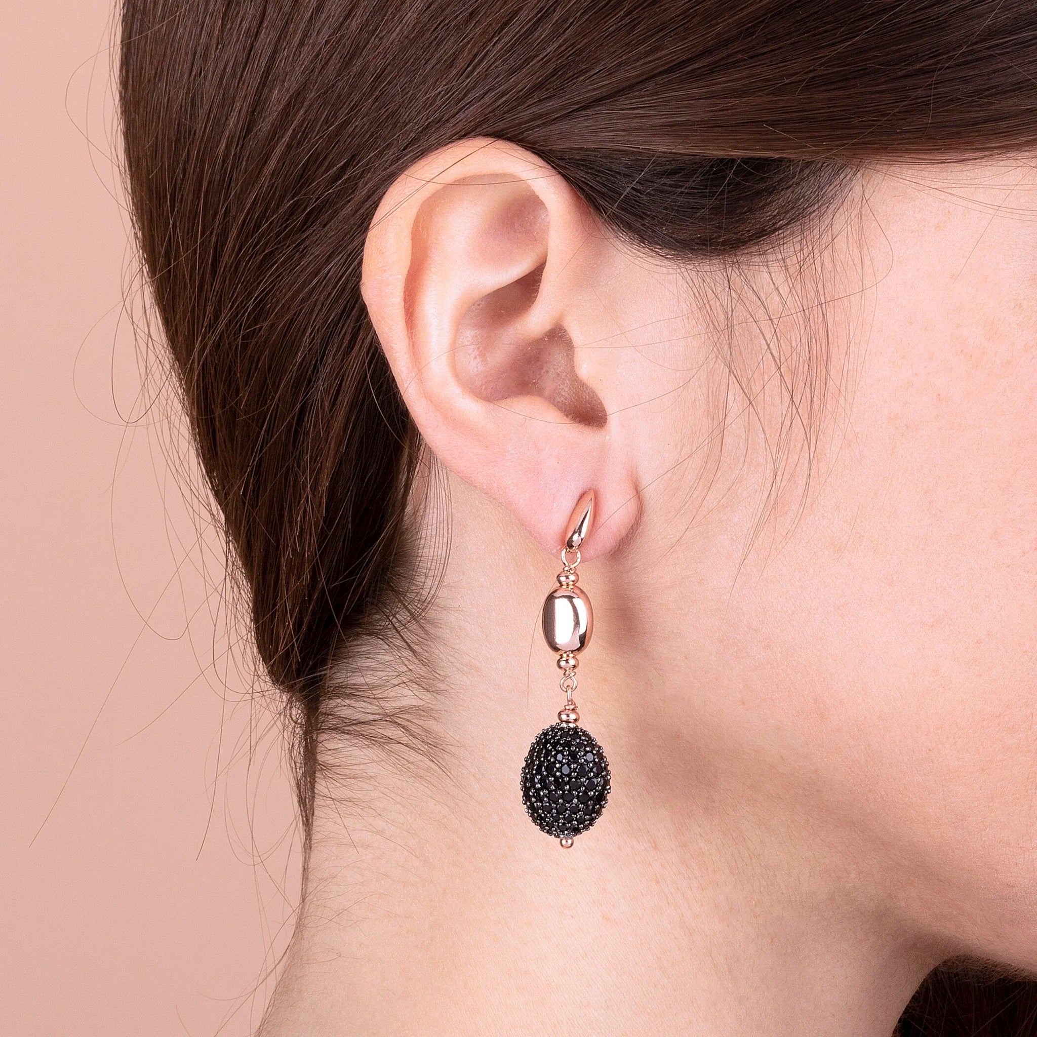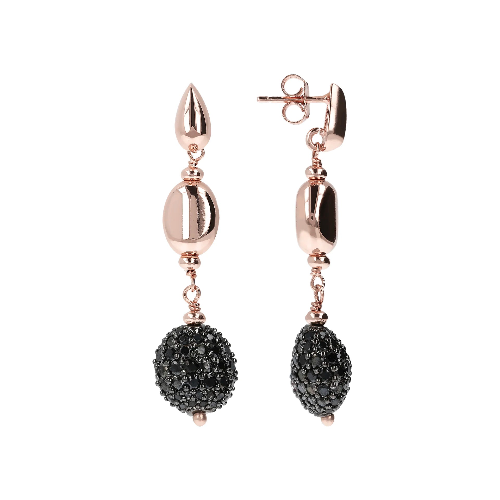 Bronzallure pendant earrings, made on a Golden Rosé base, 18kt rose gold plated, composed of a golden rosé nugget and a final pendant in bright cubic zirconia pavé or black spinel; stud and butterfly closure. Elegant creation, with a perfect design to give brightness to the face.