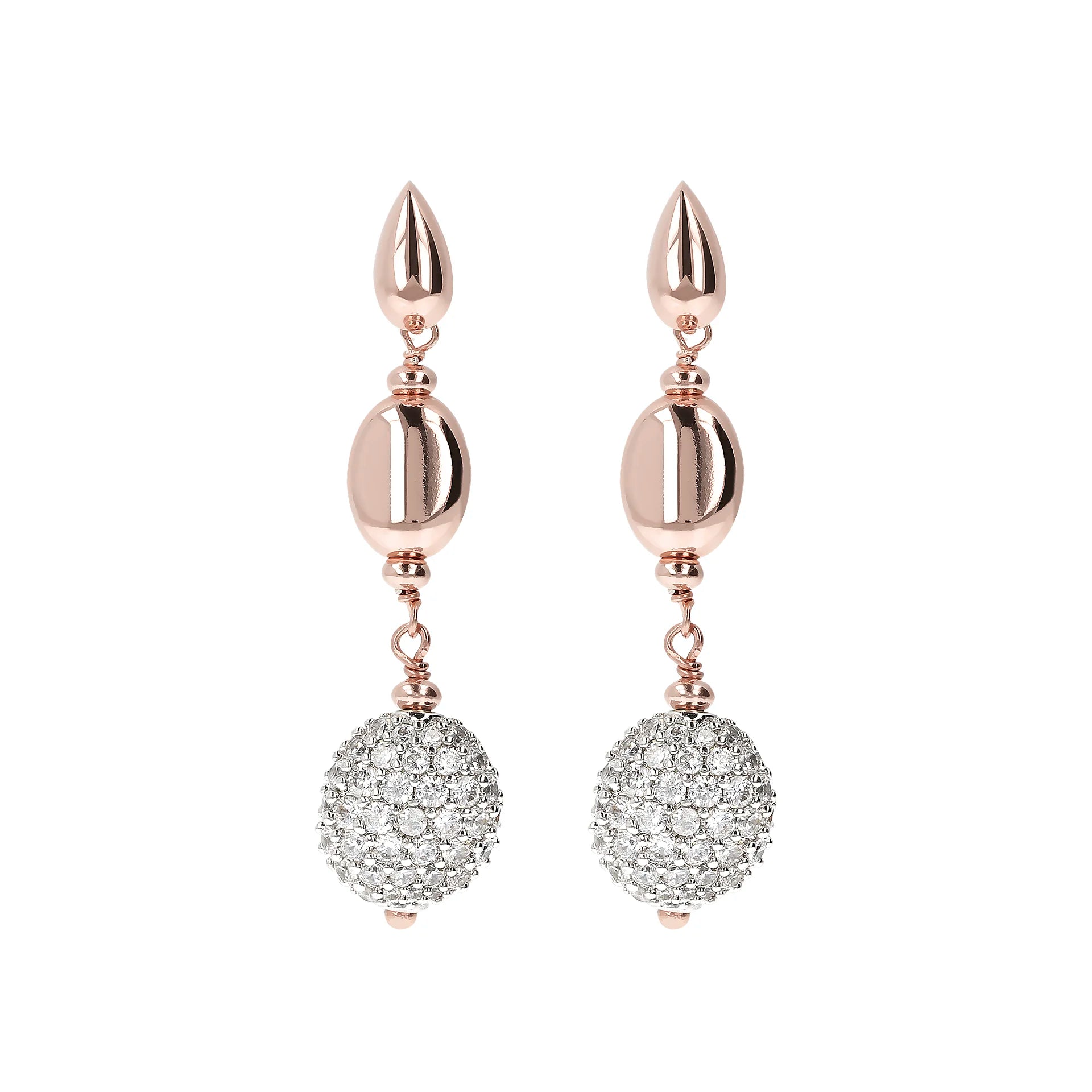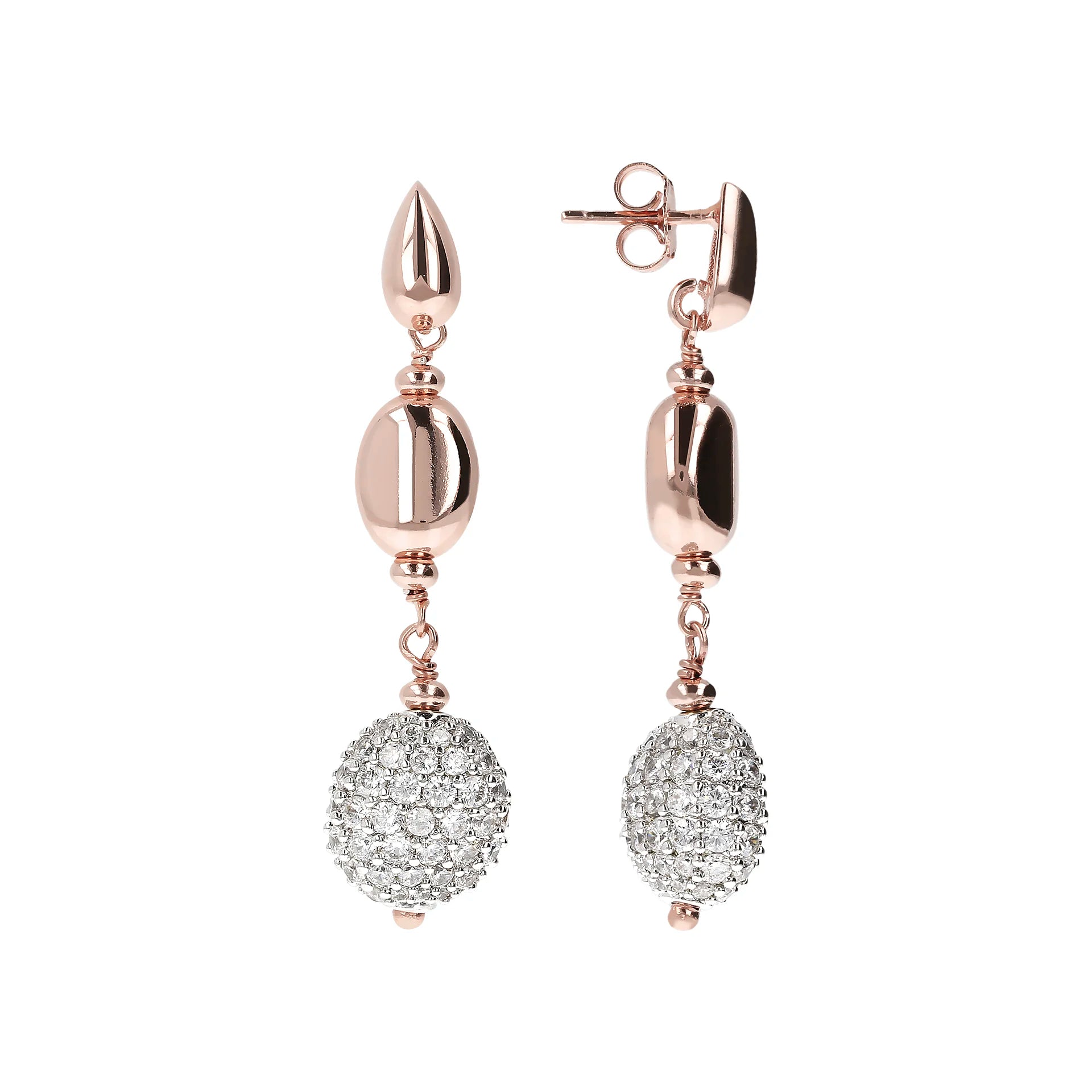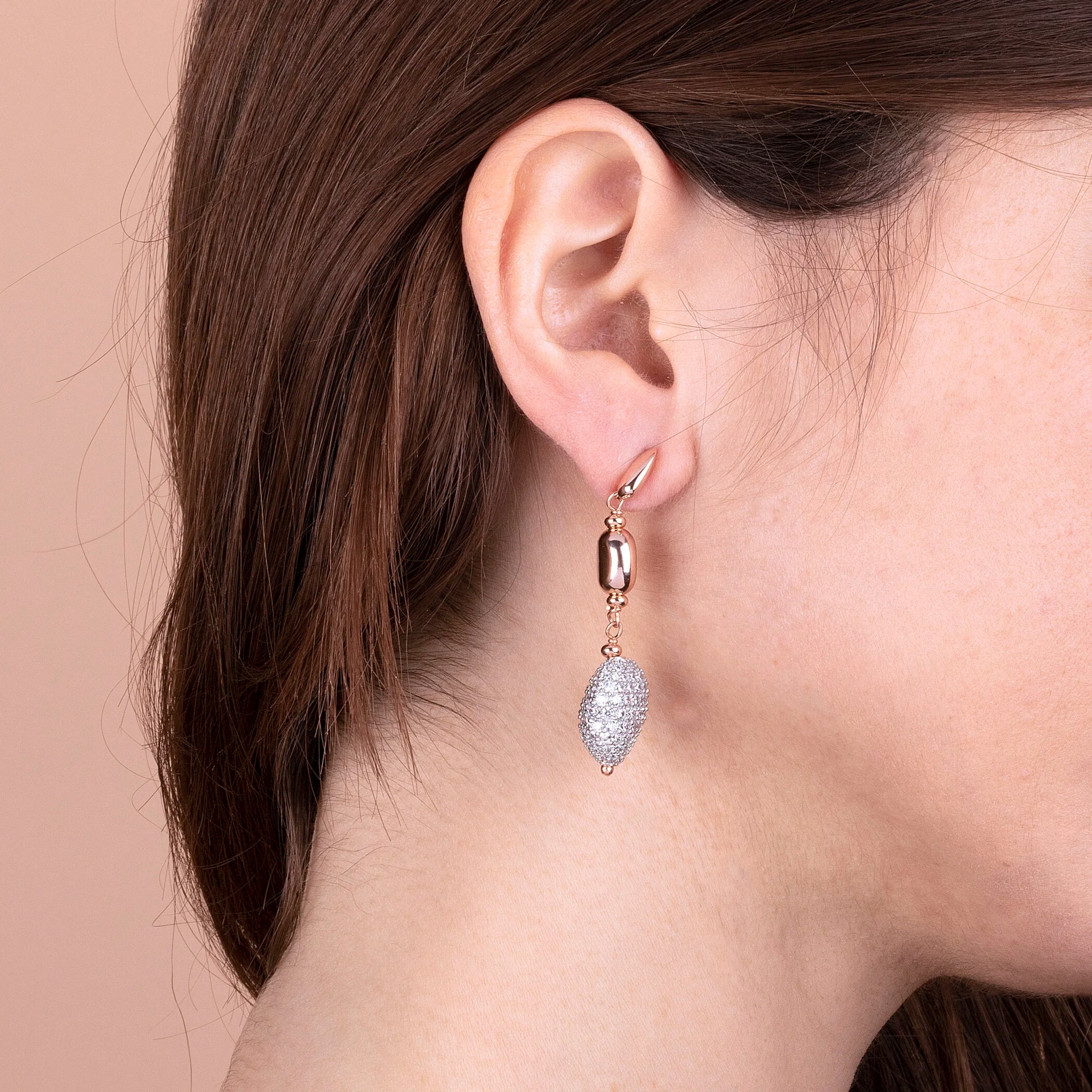 Bronzallure pendant earrings, made on a Golden Rosé base, 18kt rose gold plated, composed of a golden rosé nugget and a final pendant in bright cubic zirconia pavé or black spinel; stud and butterfly closure. Elegant creation, with a perfect design to give brightness to the face.