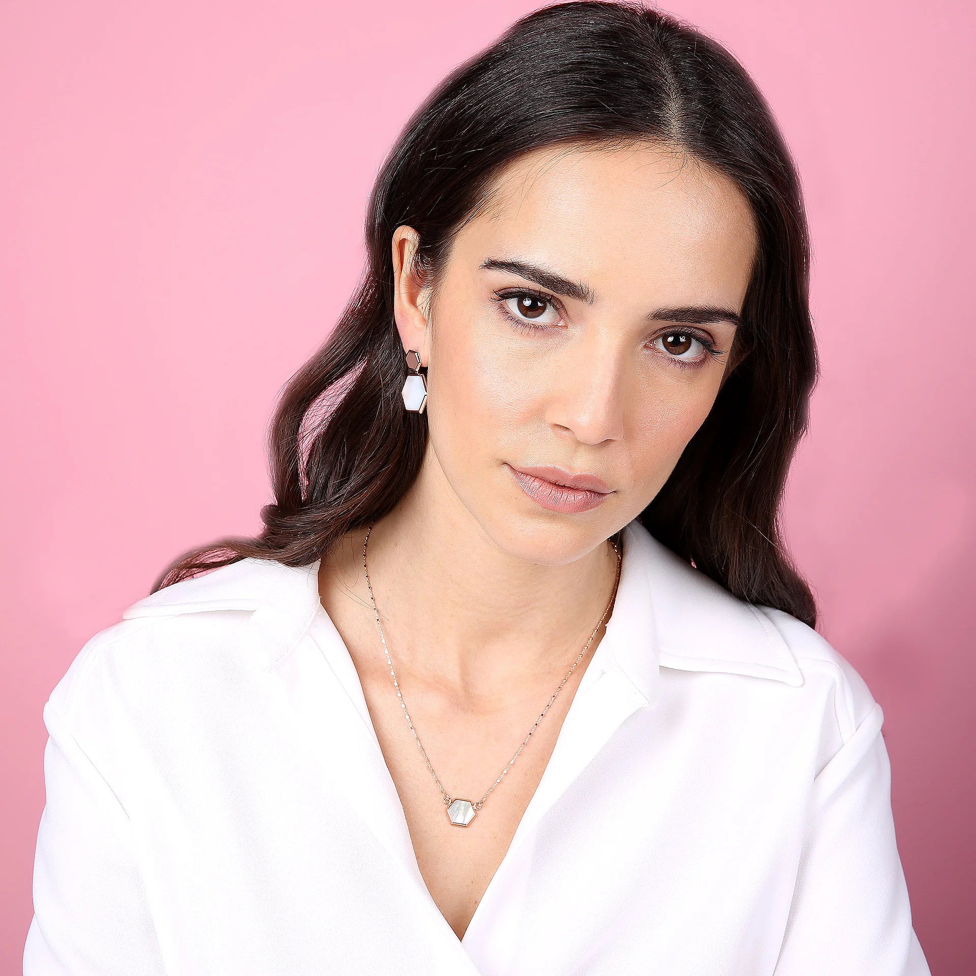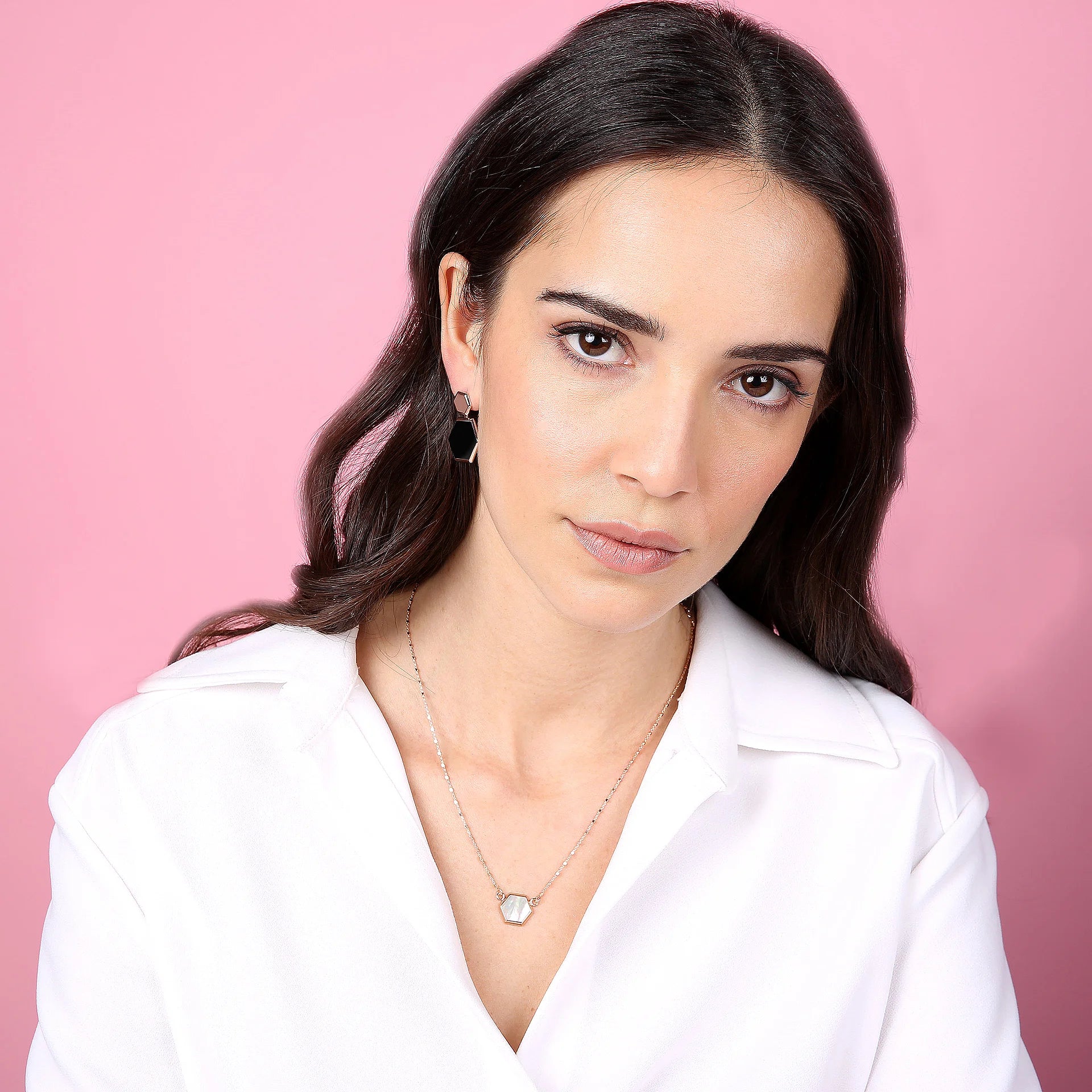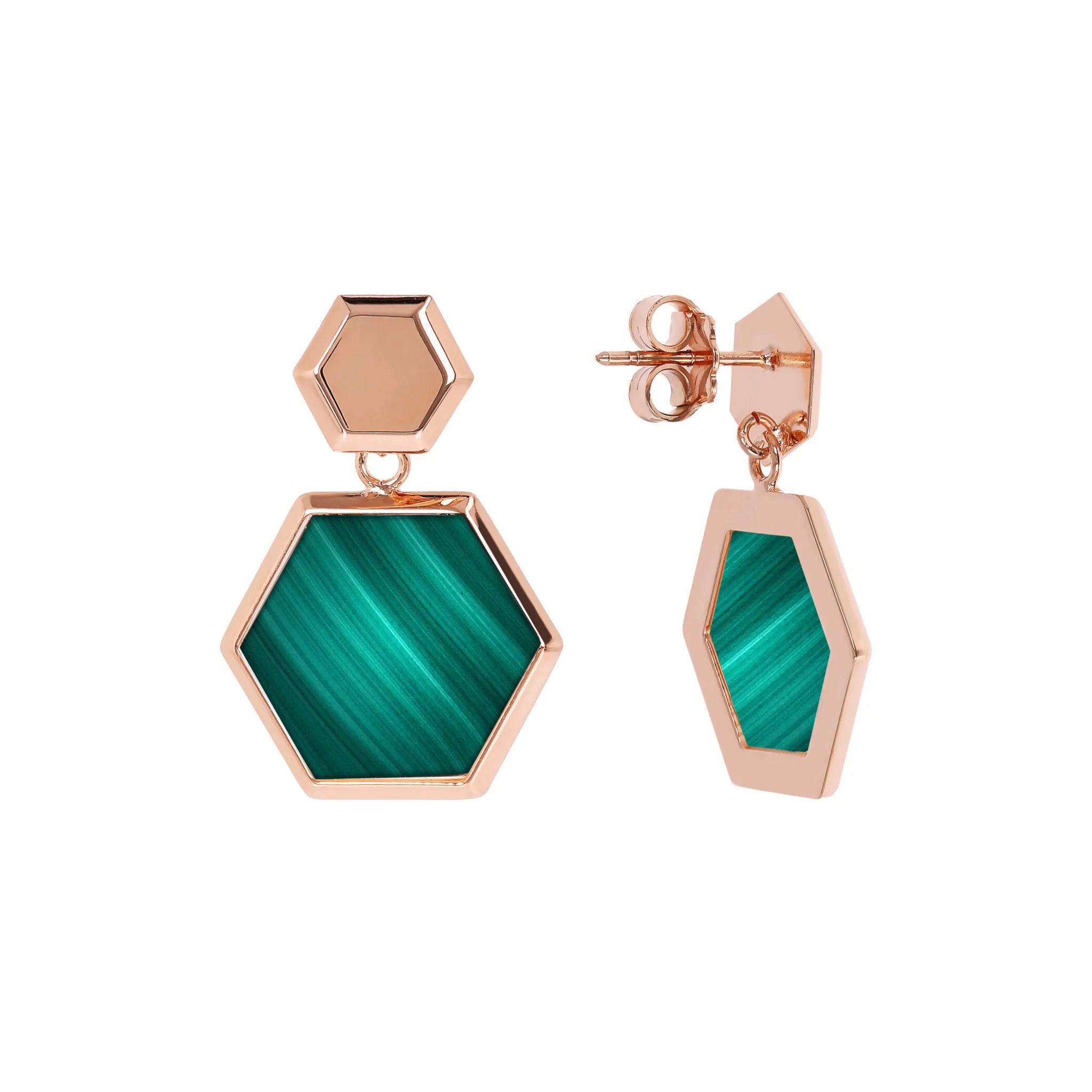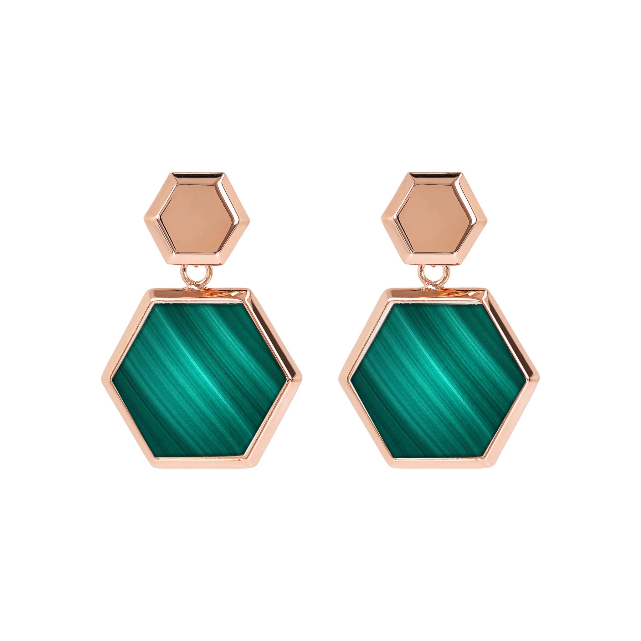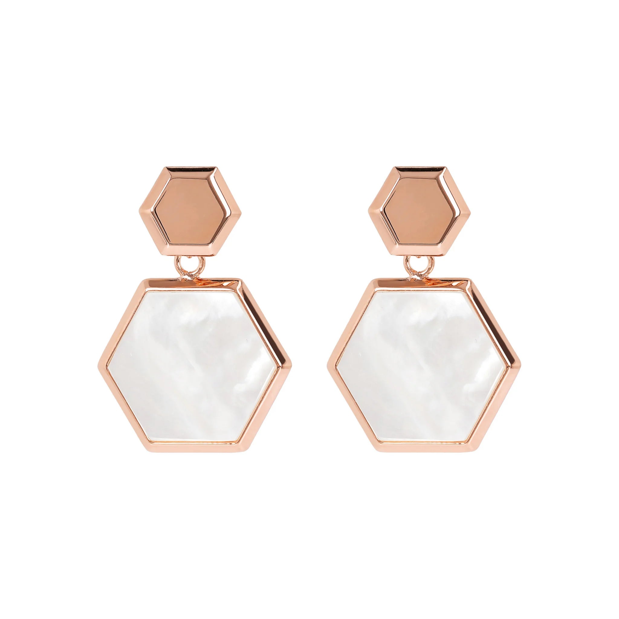 Bronzallure pendant earrings made of Golden Rosé alloy, 18kt rose gold plated with hexagonal flat natural stone pendant mounted on an 18kt rose gold plated base. The earring has a length of 2.8 cm and features a stud and butterfly closure.