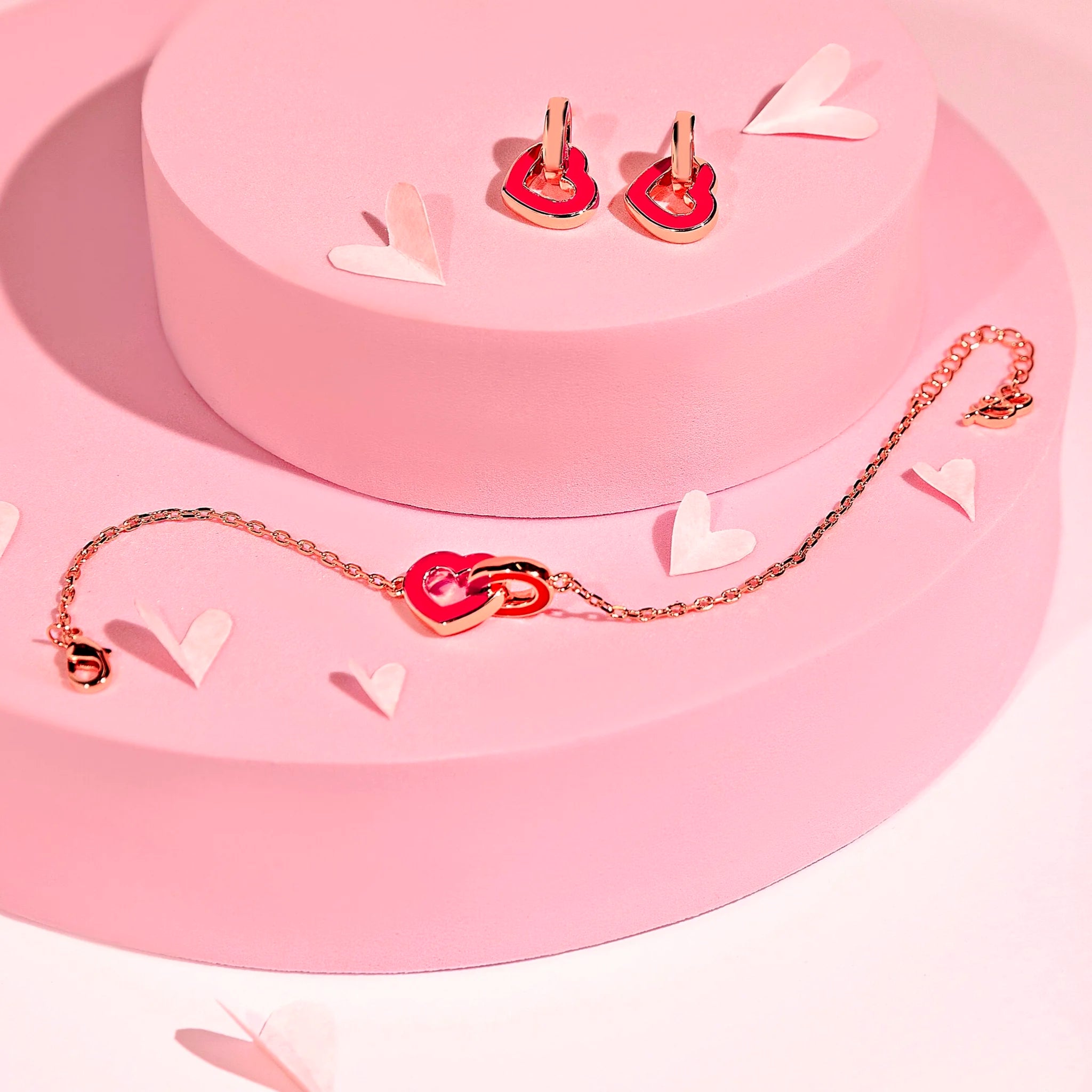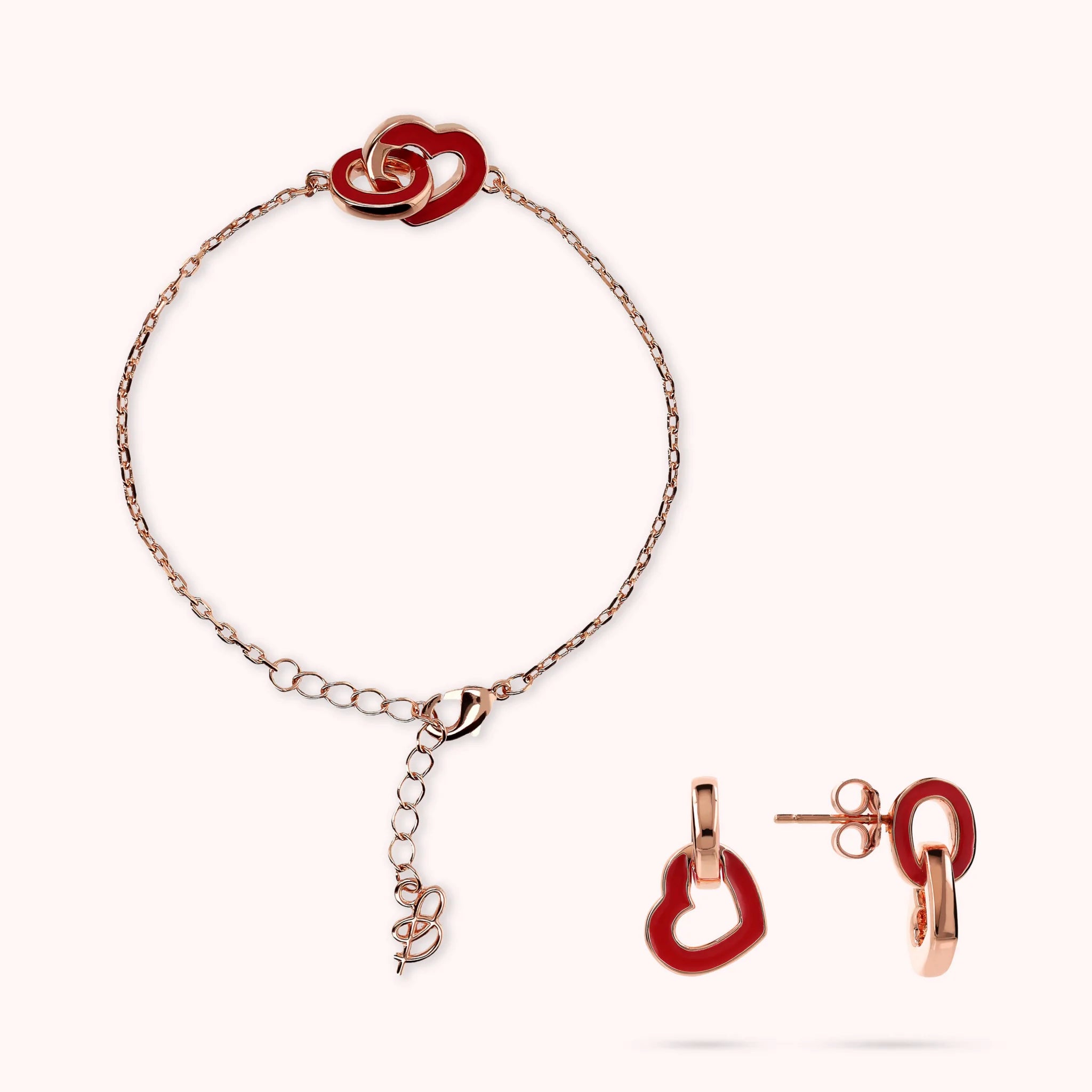 Set of Bronzallure bracelet and earrings made of Golden Rosé alloy, 18kt rose gold plated. Bracelet with forzatina chain embellished with a double intertwined heart-shaped pendant and oval link; length 16.5+3.5 cm. Dangle earrings with double intertwined heart-shaped element and oval link; pin closure. The pendants that embellish this set have a red enamelled surface.