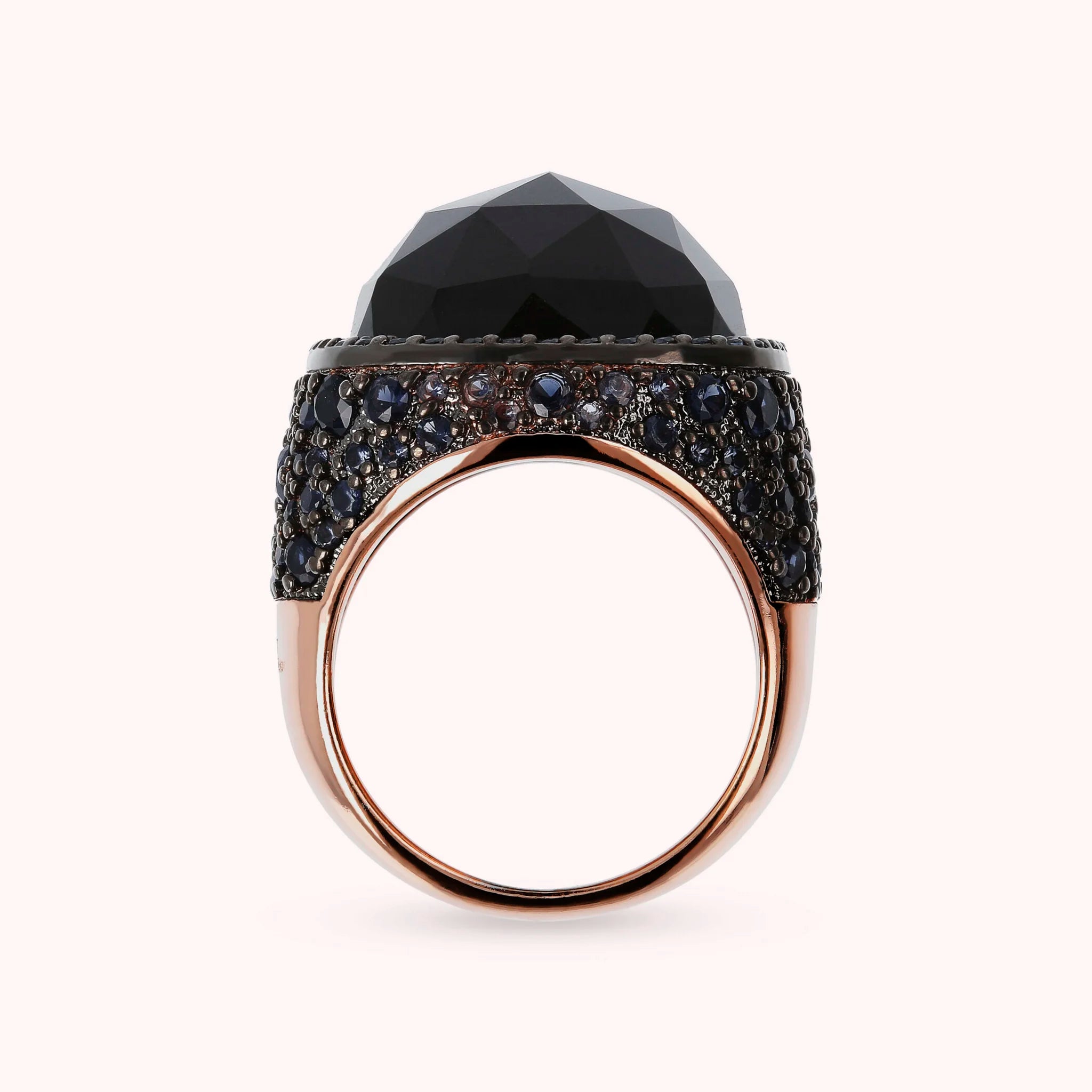 Bronzallure chevalier ring made of Golden Rosé alloy, 18kt rose gold plated, embellished with a faceted natural stone, black onyx, slightly square (16x16 mm) and surrounded by small black luminous cubic zirconia. In the lower part of the stone there is a luminous pavé of small blue cubic zirconia stones.