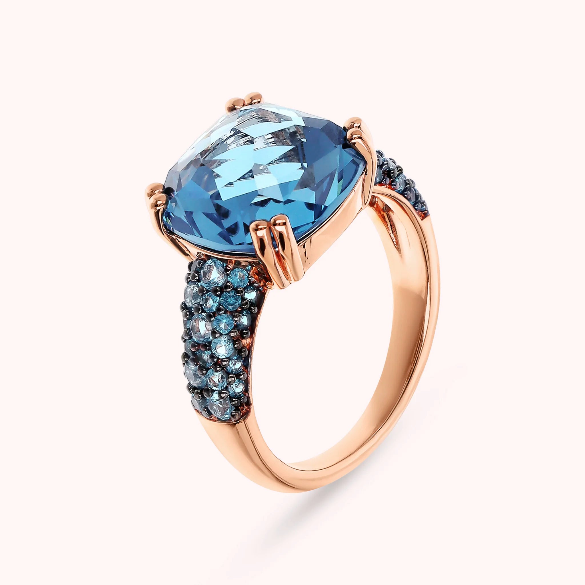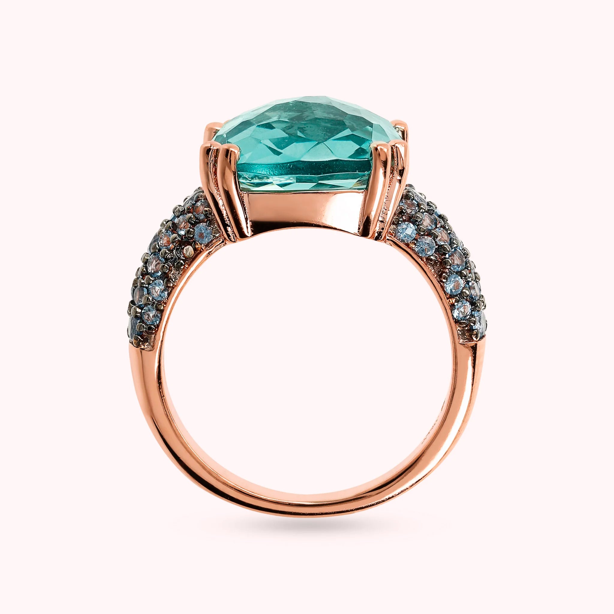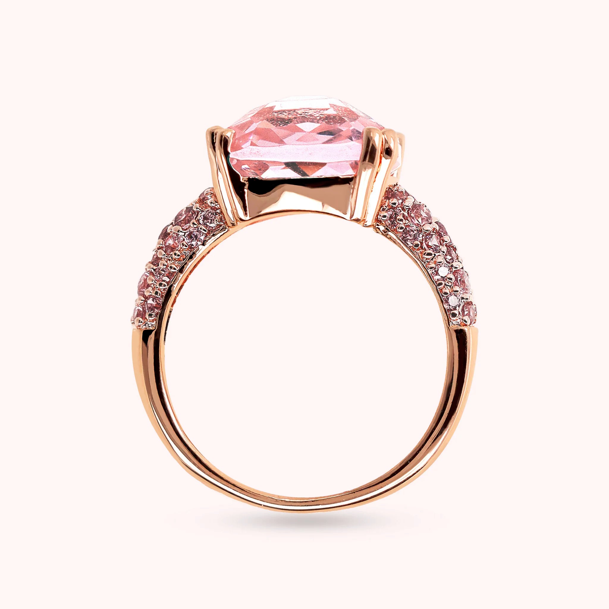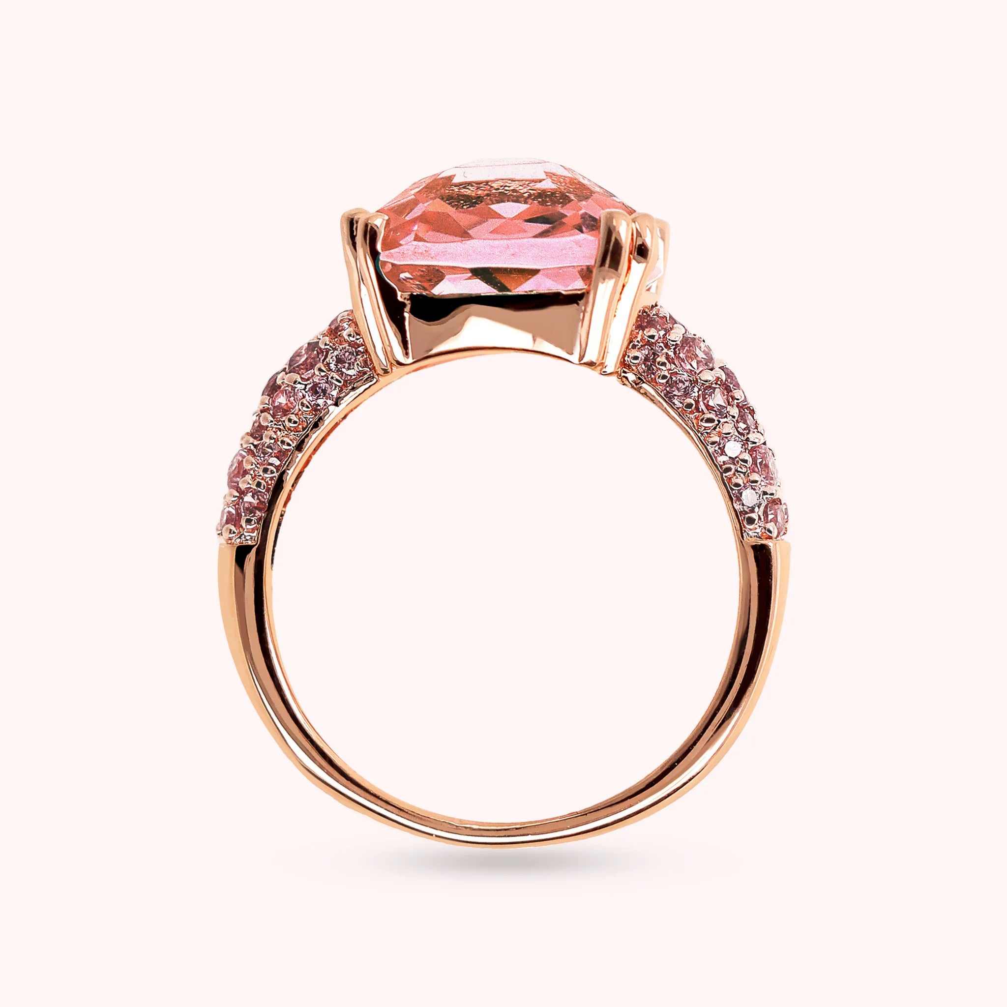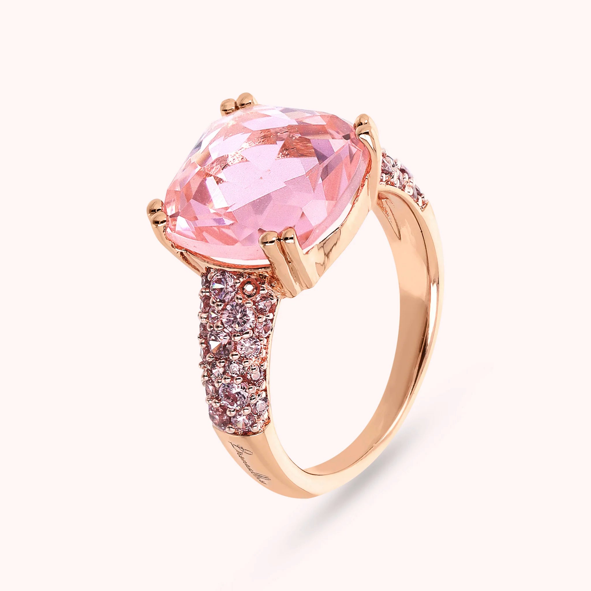 Bronzallure cocktail ring made on a Golden Rosé base, 18kt rose gold plated, embellished with a central square-shaped nano crystal stone (8x8 mm). On the sides of the stone there are cubic zirconia that create a luminous pavé.