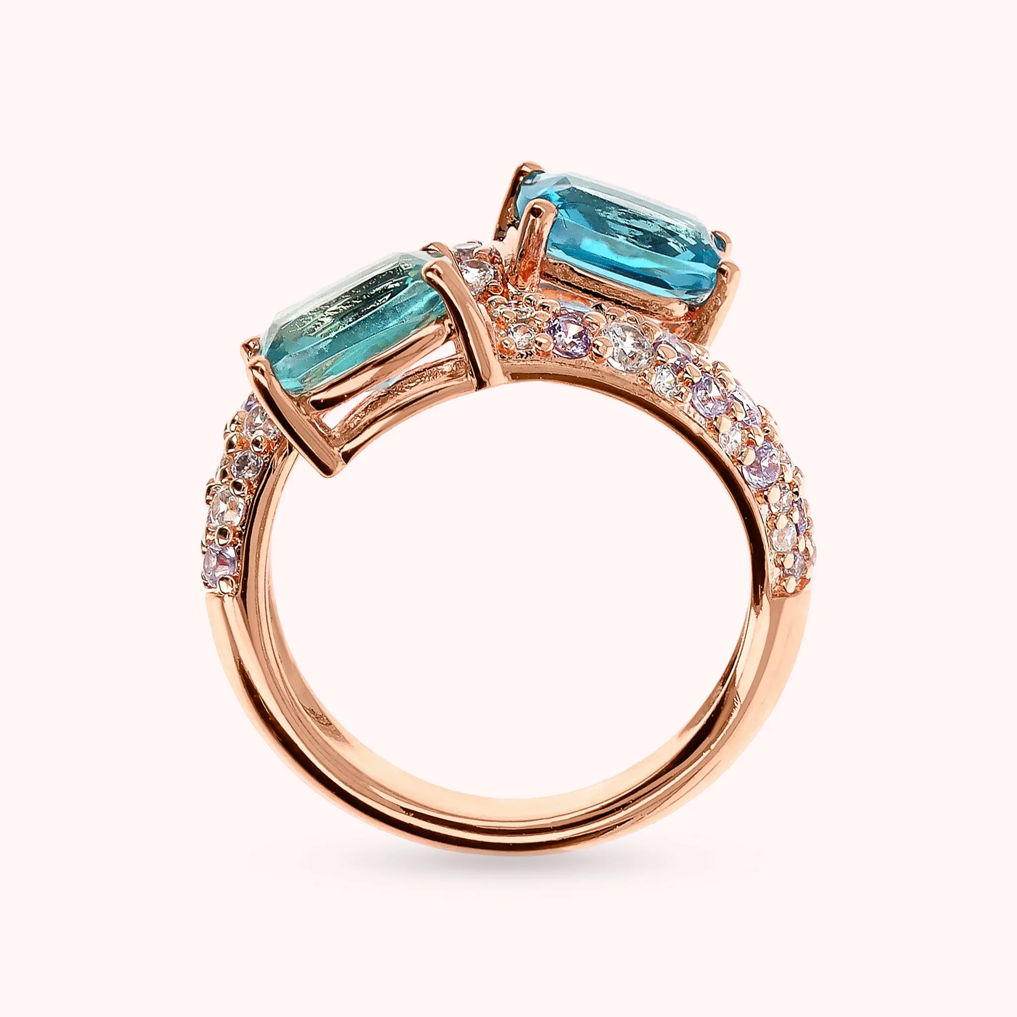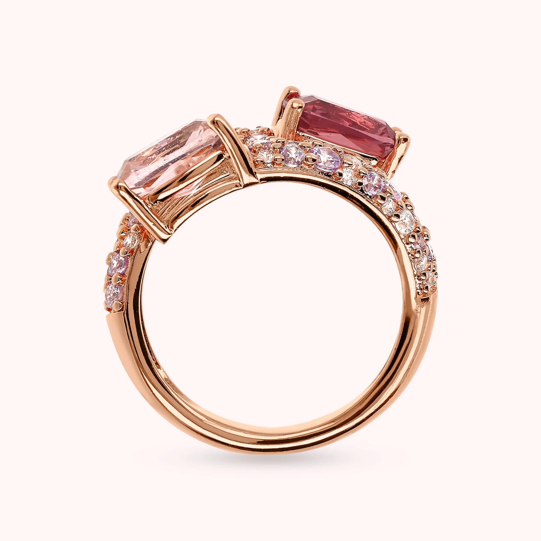 Bronzallure contrarié ring made of Golden Rosé alloy, 18kt rose gold plated, with cubic zirconia pavé surface, luminous quality, embellished with two rectangular gem prism stones (8x5 mm) with a mosaic cut.