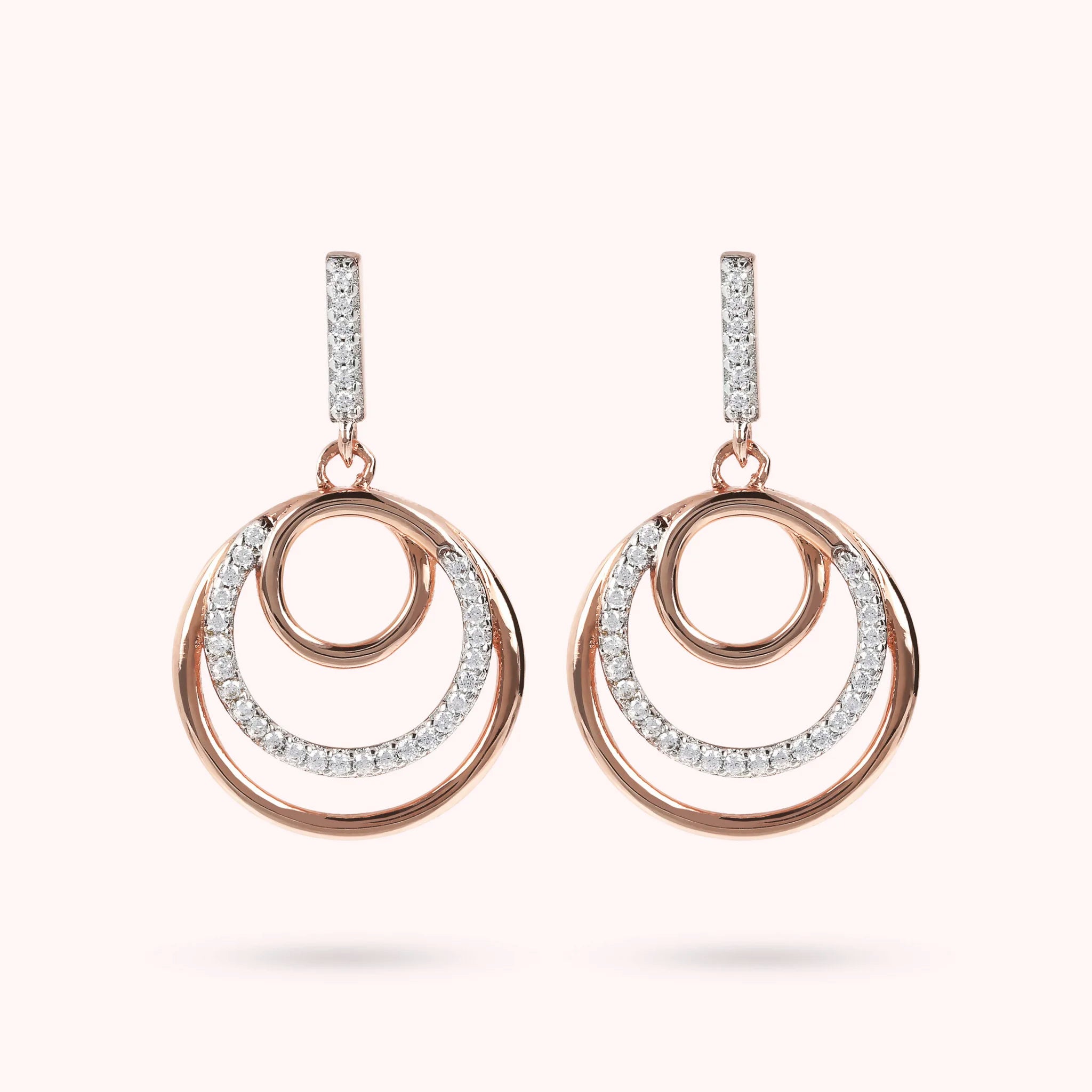 Bronzallure pendant earrings made of Golden Rosé alloy, 18kt rose gold plated, composed of a counter link in luminous cubic zirconia pavé and a triple graduated circle as a pendant, the intermediate circle also in luminous cubic zirconia; pin and butterfly closure; length of 2.5cm. Elegant and perfect creation to make your look shine.