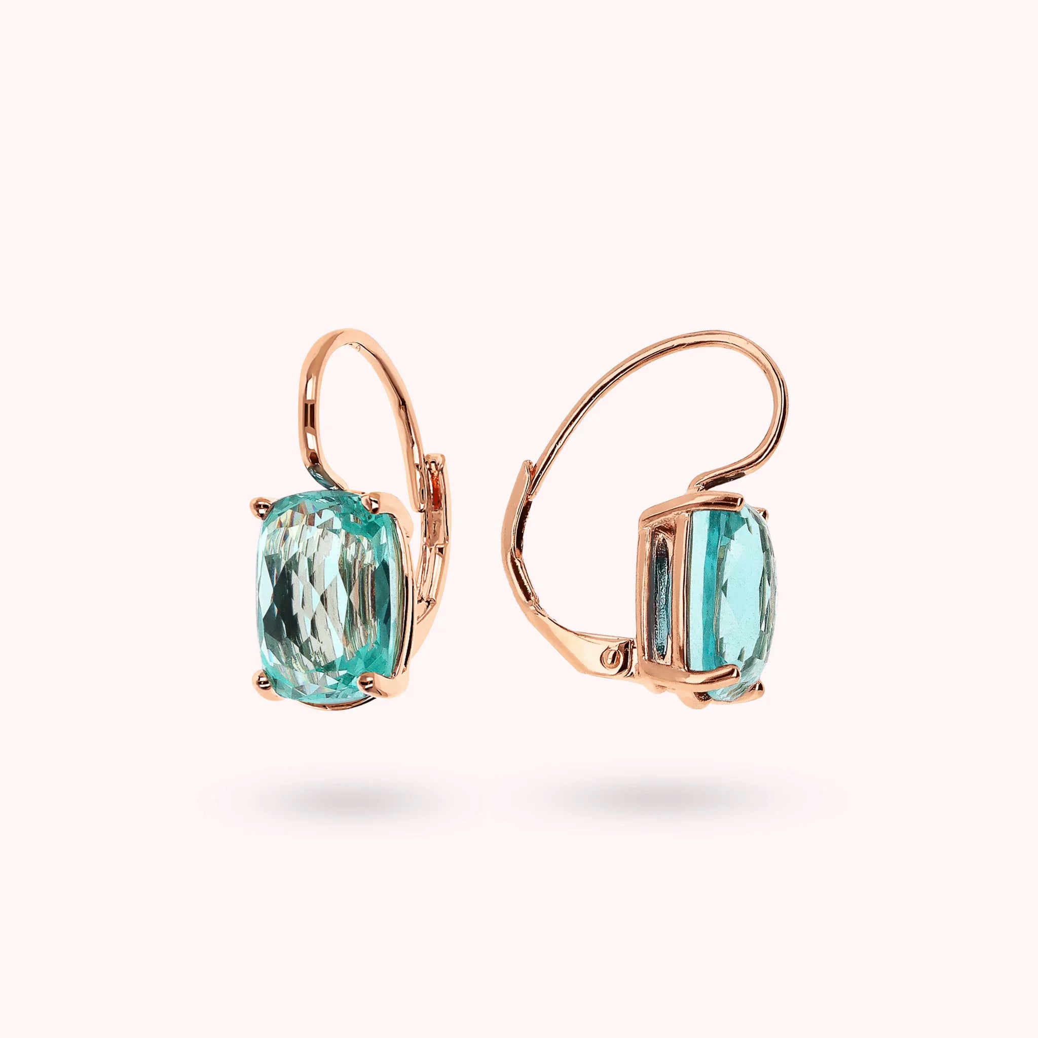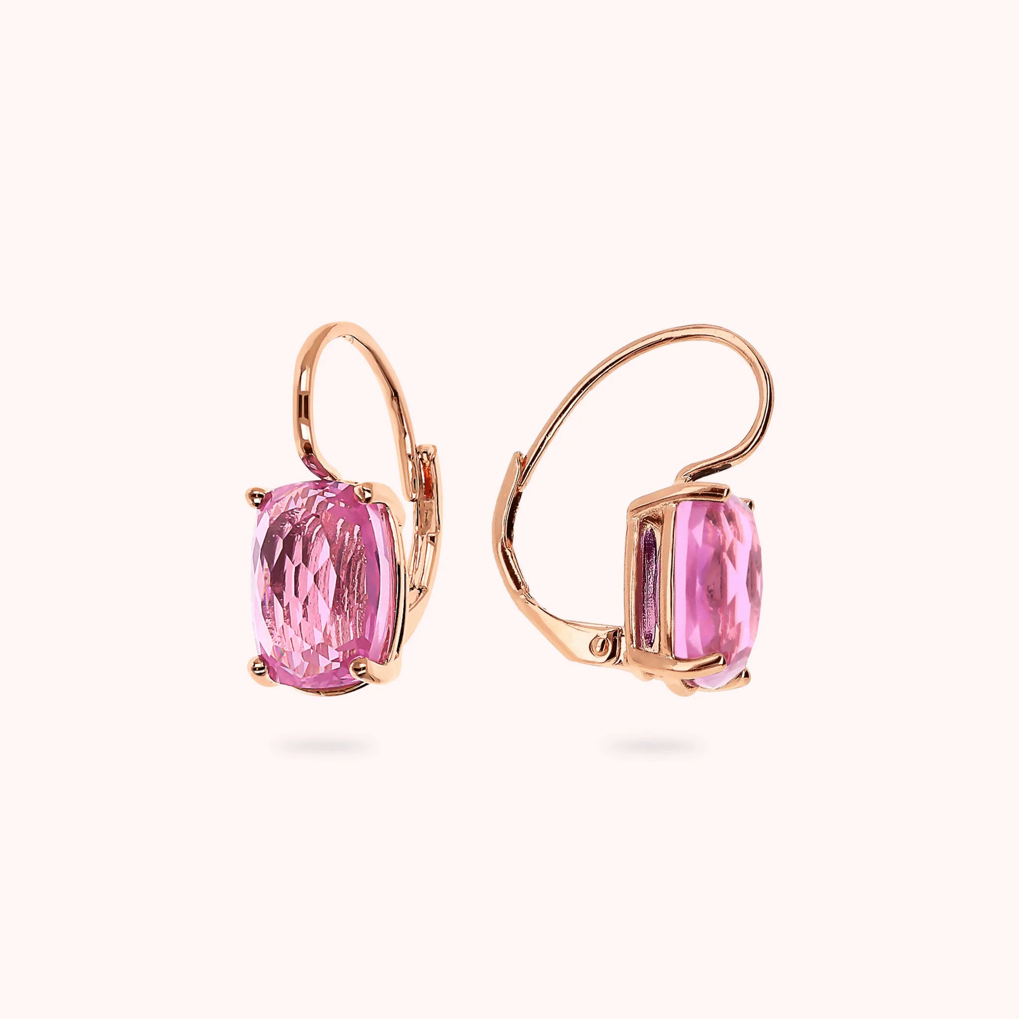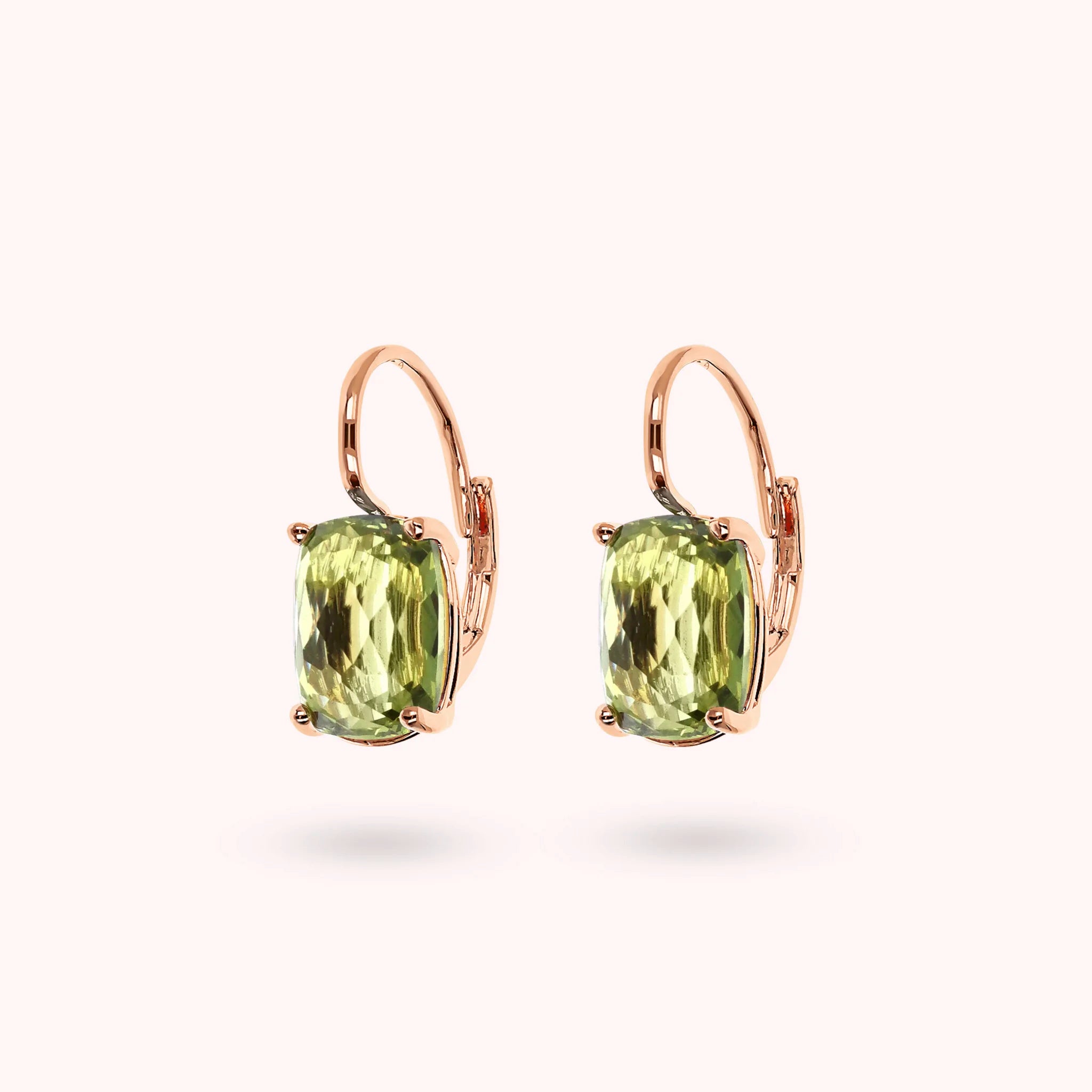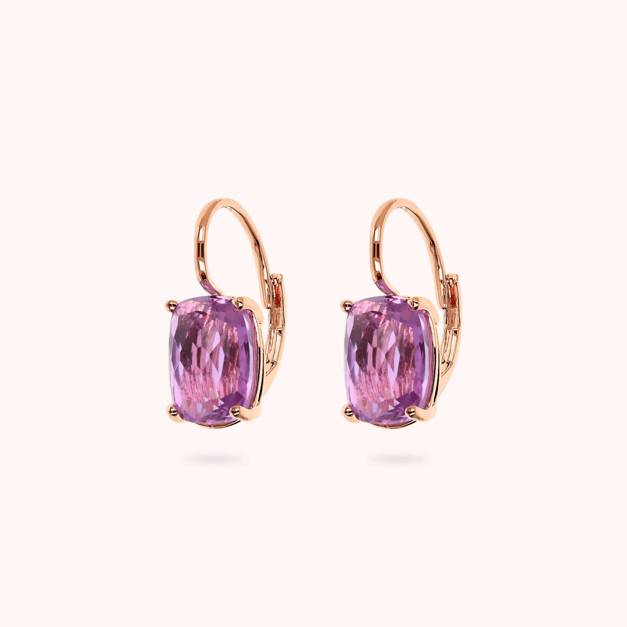 Dangle earrings made of Golden Rosé alloy, 18kt rose gold plated, embellished with two rectangular gem prism stones (8x11) with a mosaic cut. Leverback closure.