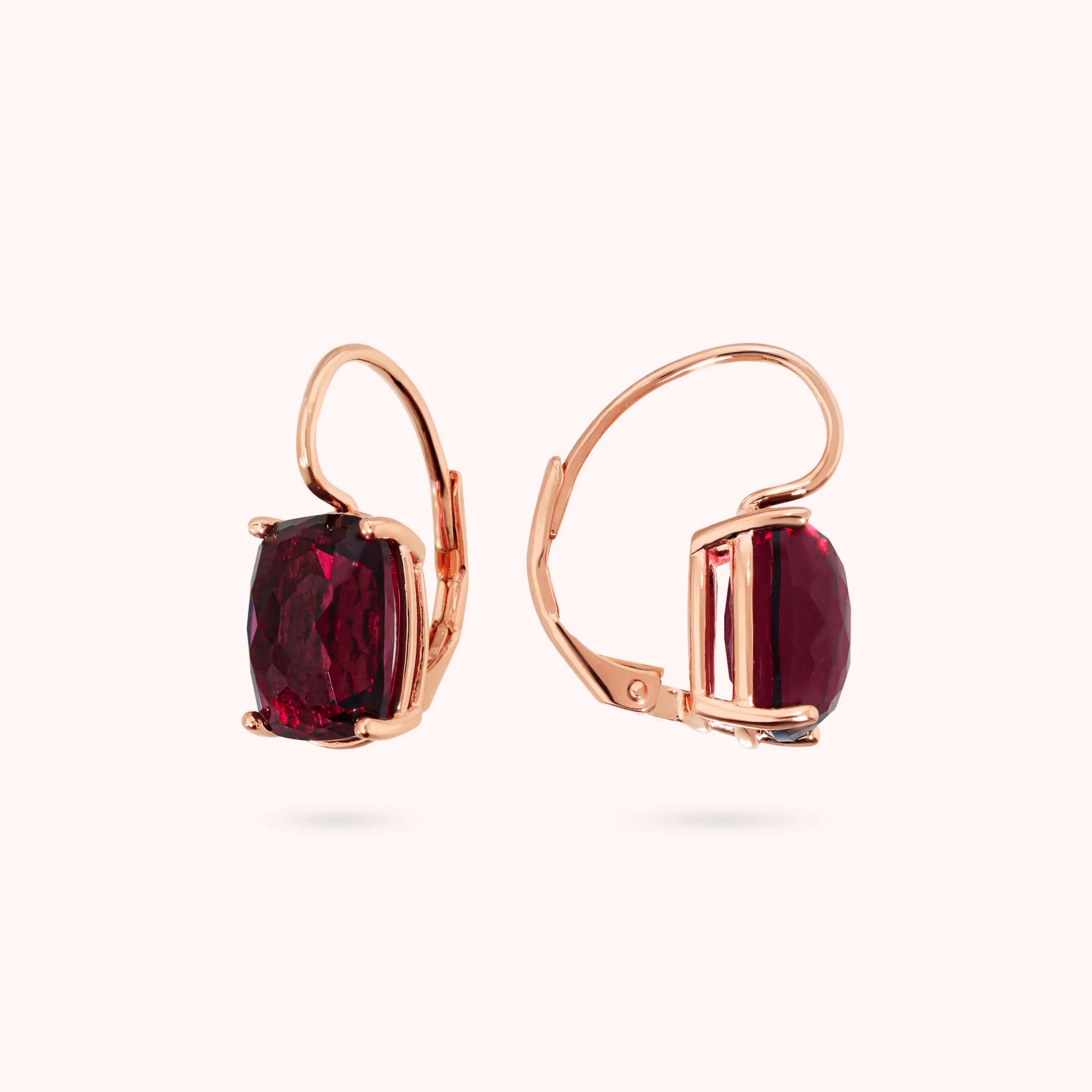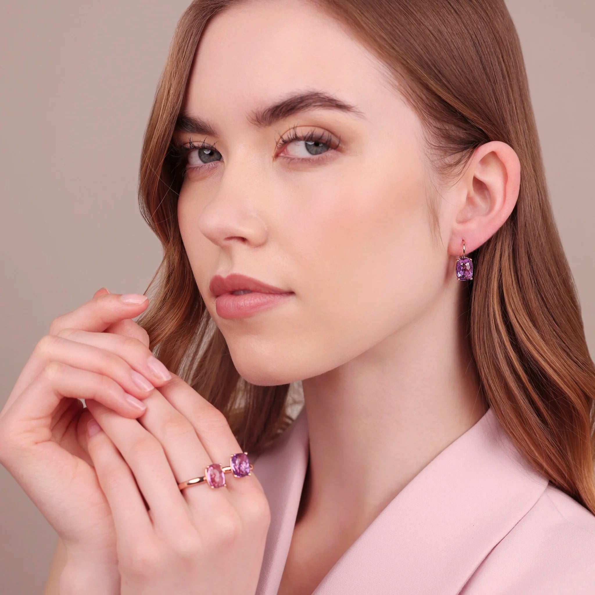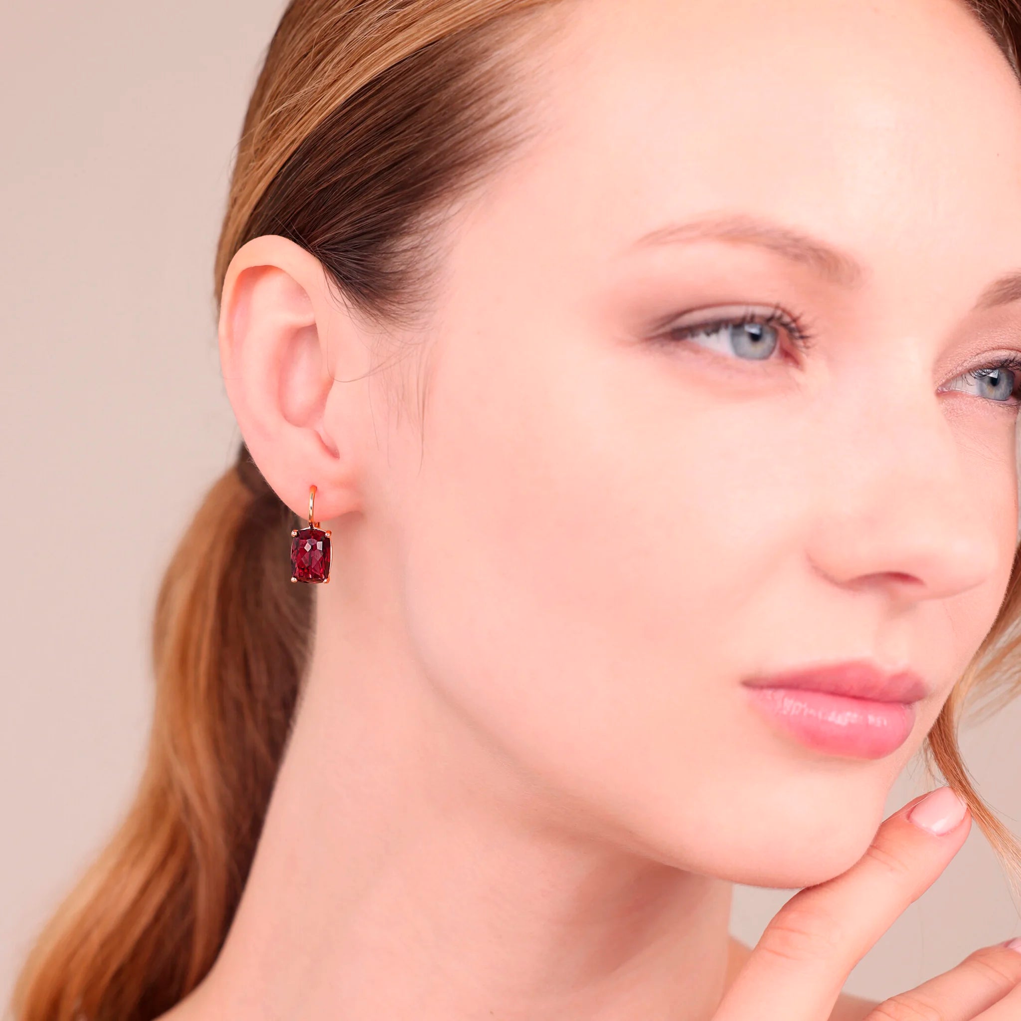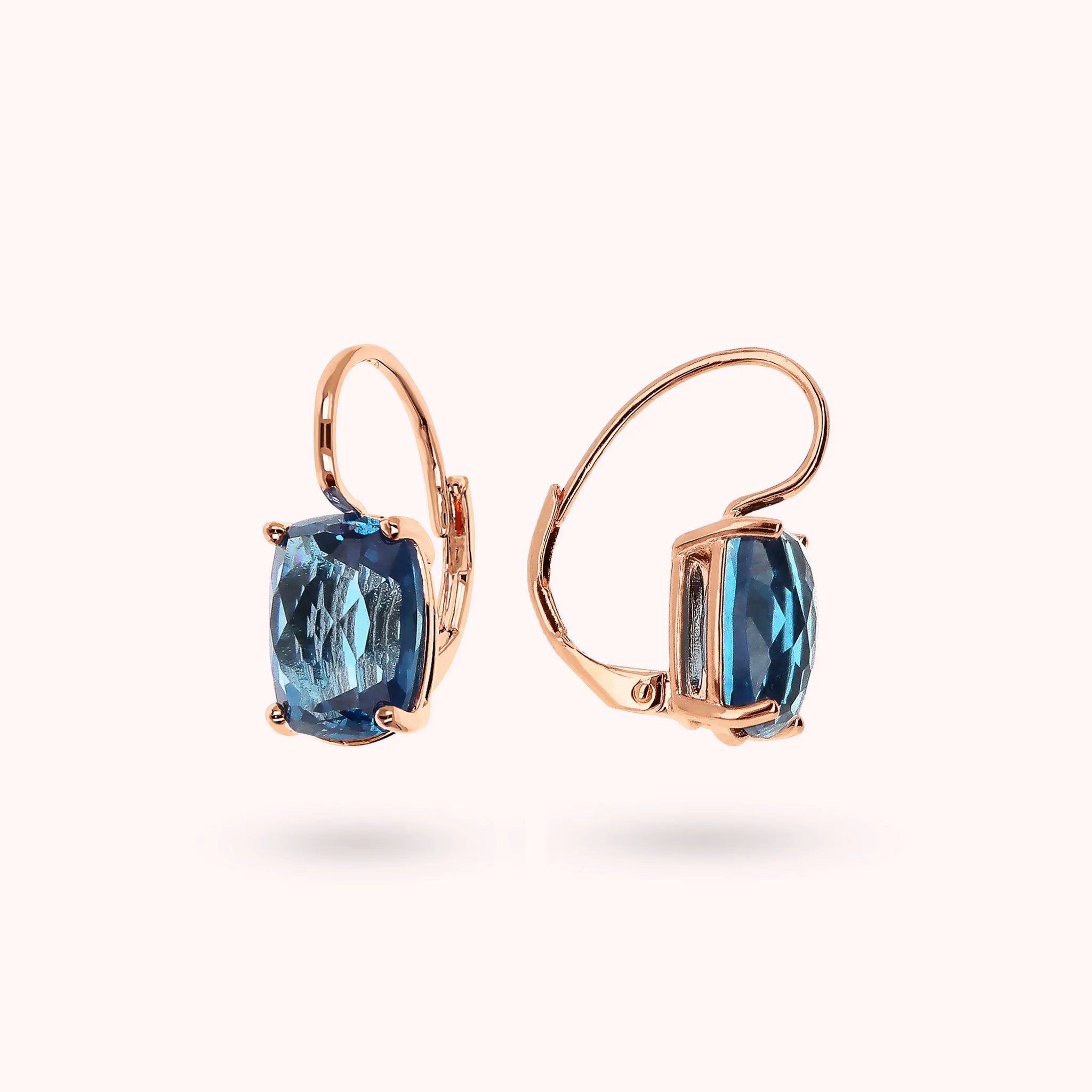 Dangle earrings made of Golden Rosé alloy, 18kt rose gold plated, embellished with two rectangular gem prism stones (8x11) with a mosaic cut. Leverback closure.
