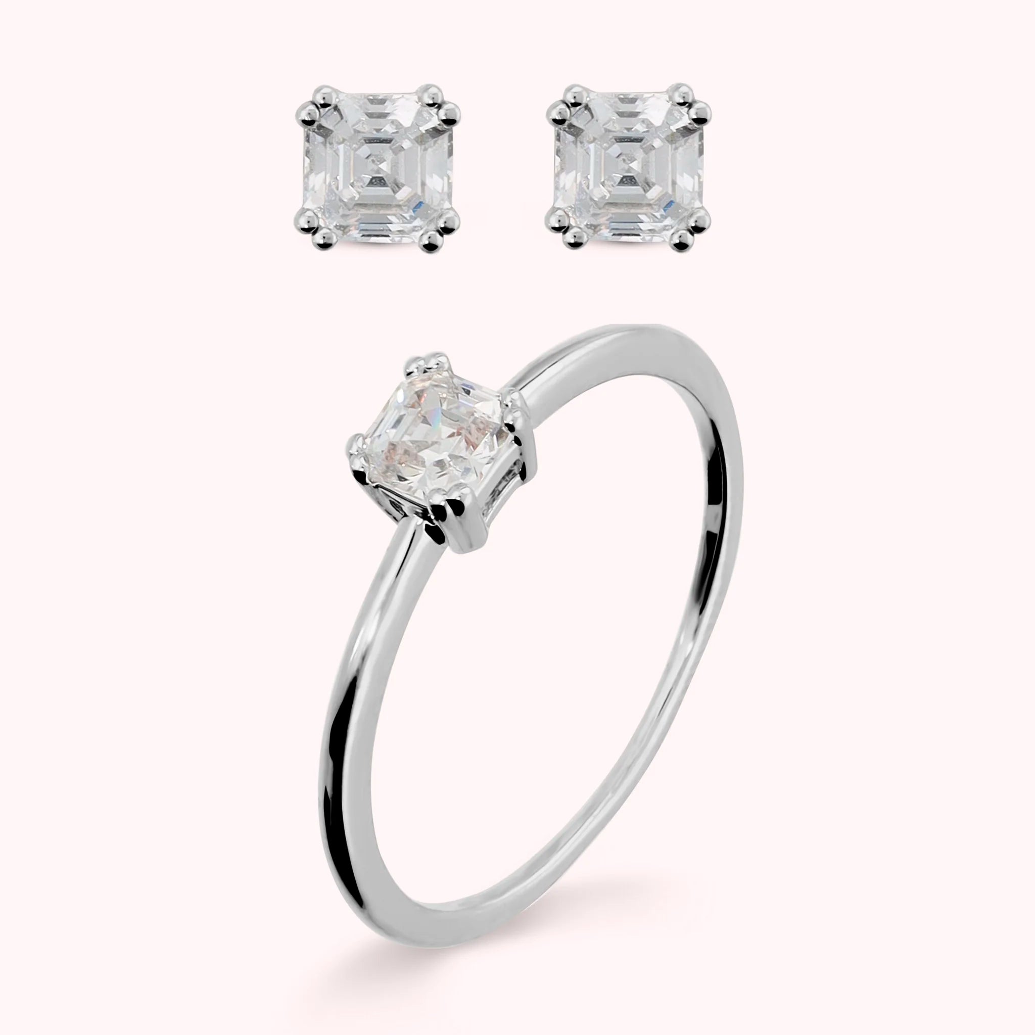 Piccoli ma luminosi, orecchini a bottone e anello solitario con cubic zirconia a taglio princess illuminano con delicatezza il look, aggiungendo un tocco prezioso e raffinato a ogni momento.
