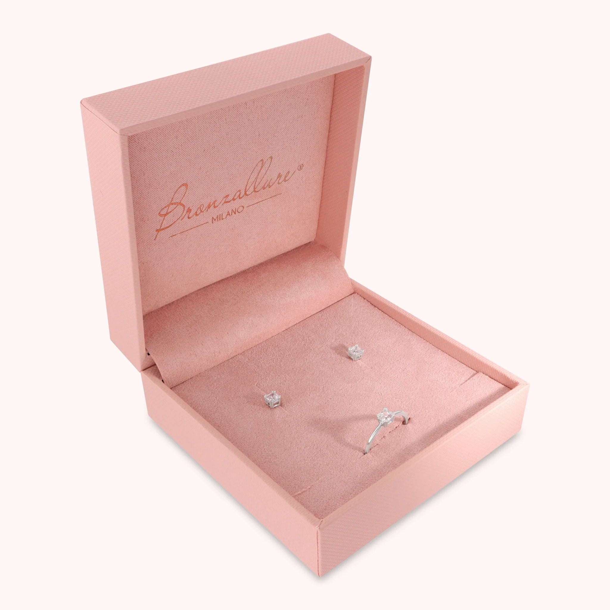 Bronzallure set made of Golden Rosé alloy, rhodium plated, consisting of a pair of button earrings and a solitaire ring with white cubic zirconia, princess cut (4x4mm).